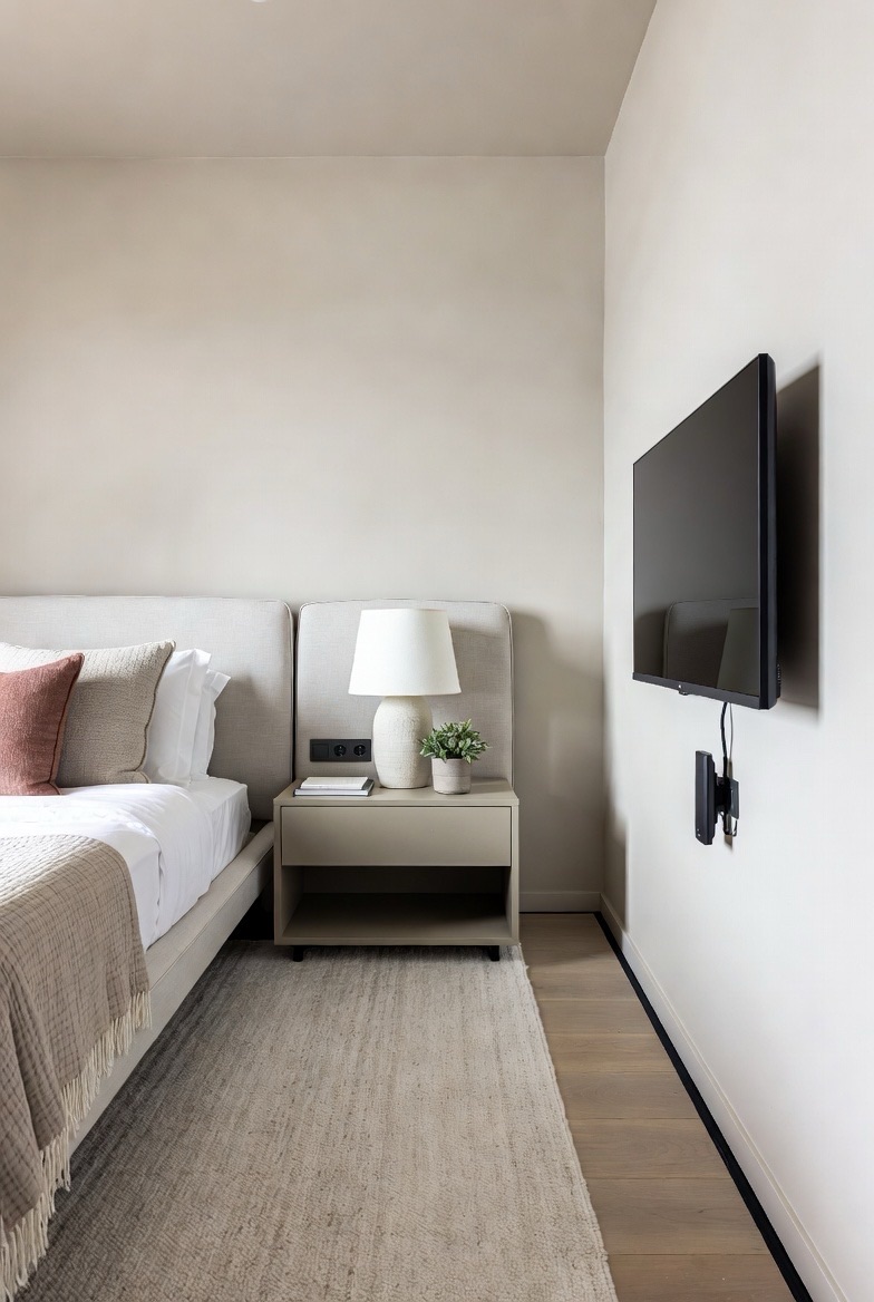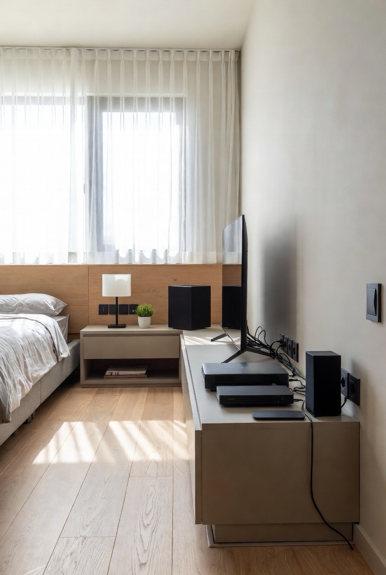 Visible cords can disrupt a minimalist space, so organizing or hiding them keeps the room neat. Use cord covers, built-in cable channels, or furniture with cable management. Keeping devices discreet helps maintain the calming atmosphere that defines minimalist bedrooms. This small detail can make a big difference.