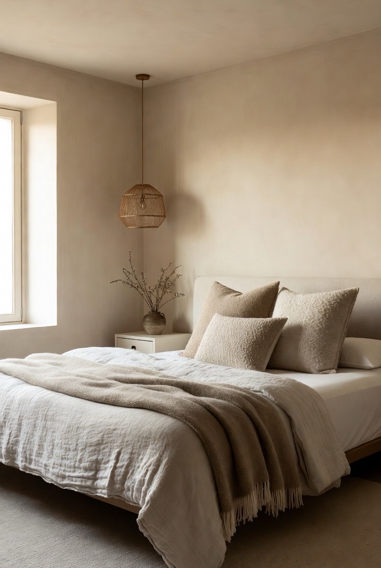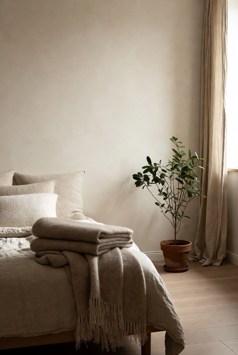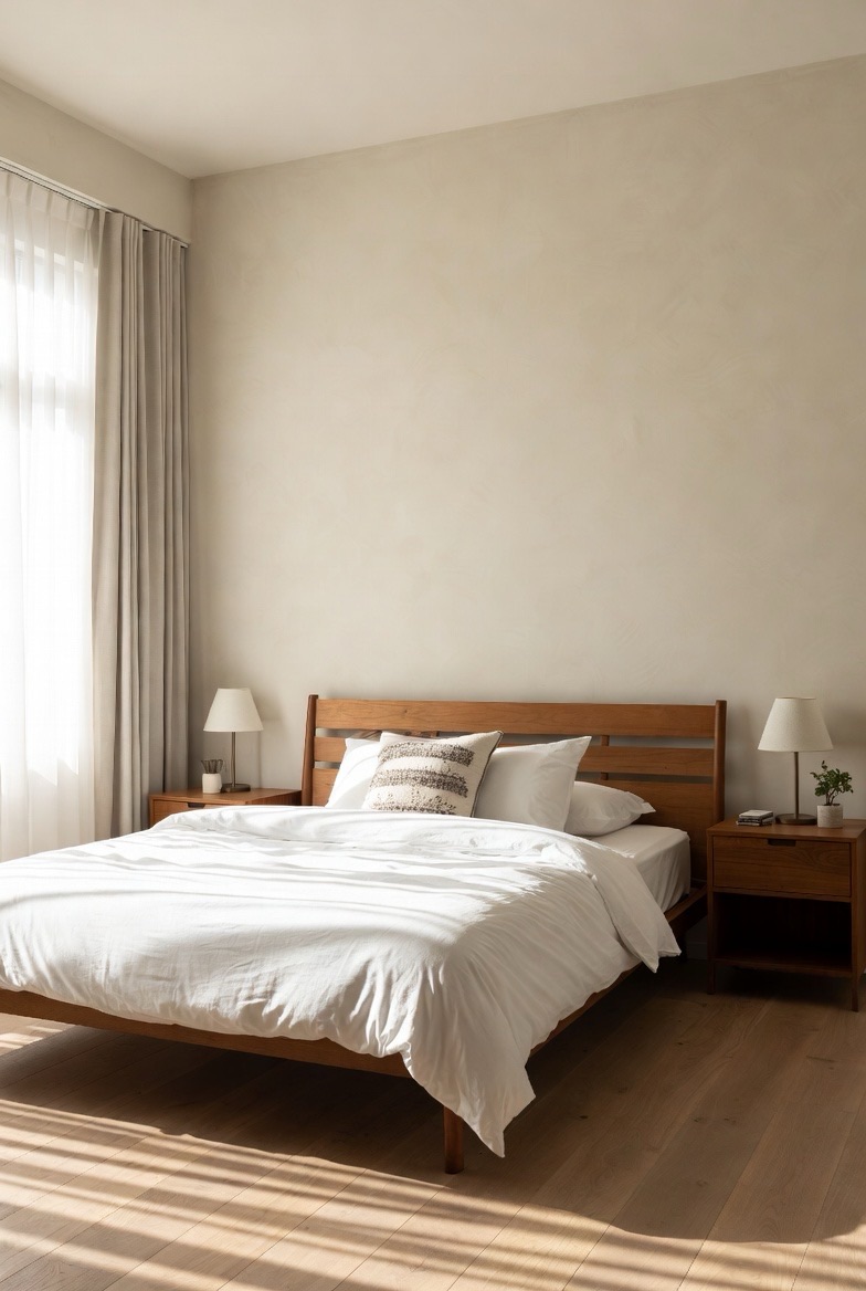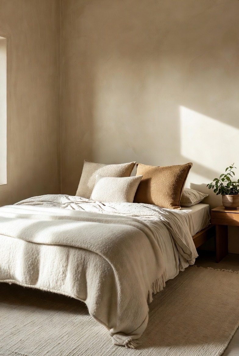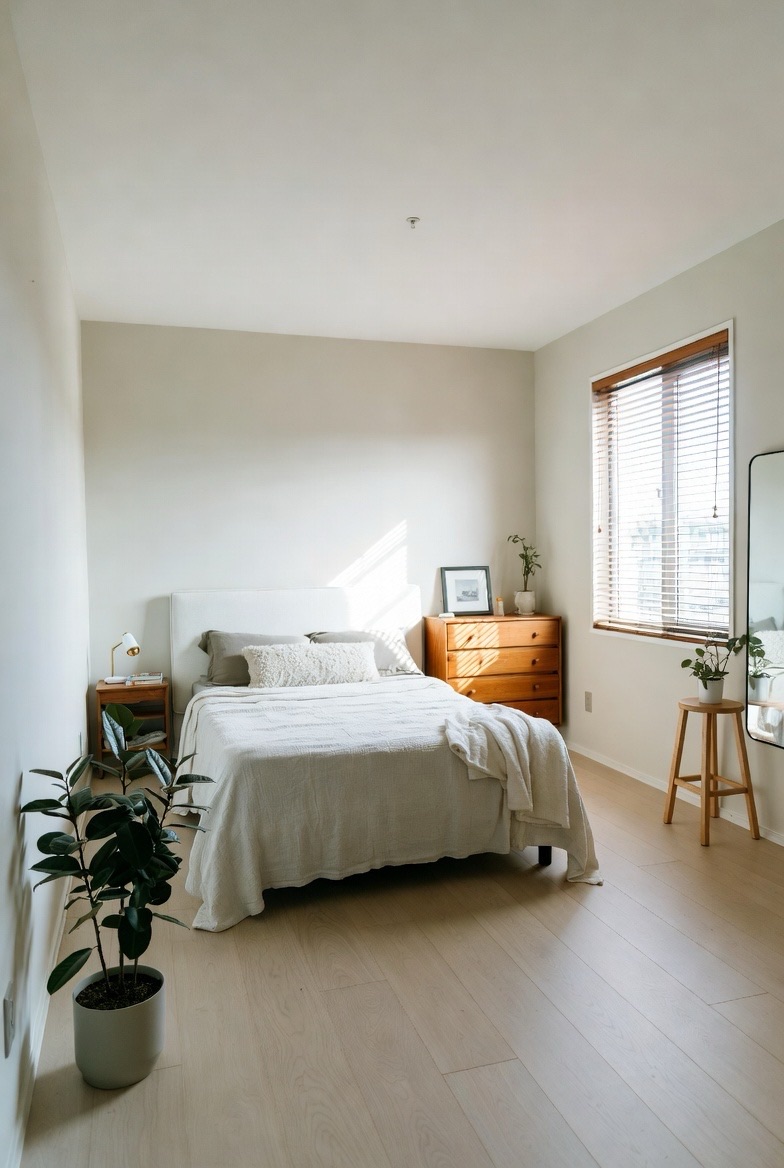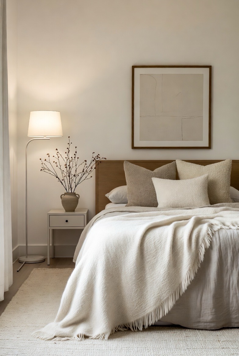 Minimalist rooms thrive on texture. Incorporate soft elements like wool throws, bouclé pillows, and linen sheets to add depth. These natural textures create warmth and interest without overwhelming the space. The gentle layering keeps the room peaceful while making it feel inviting.