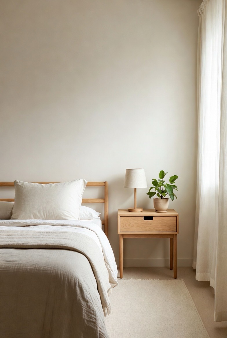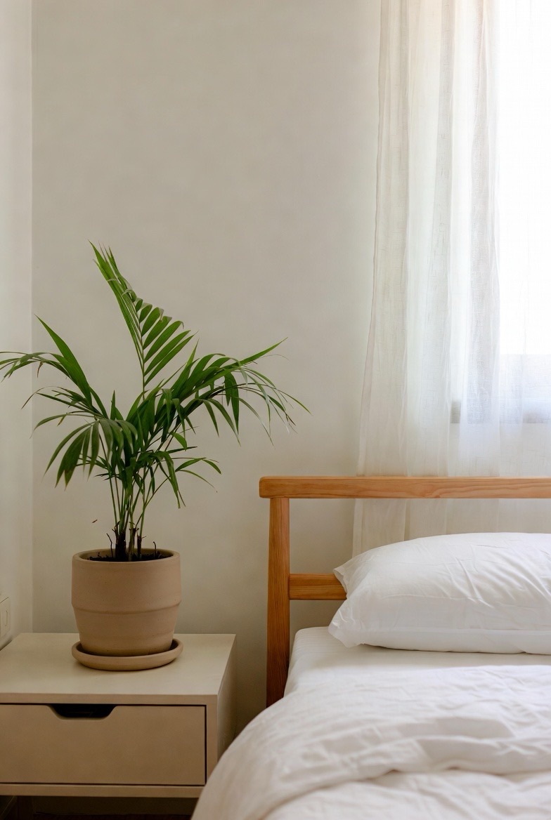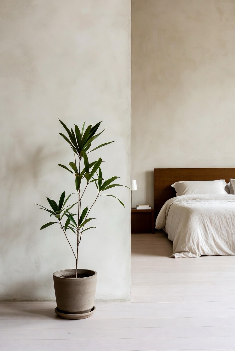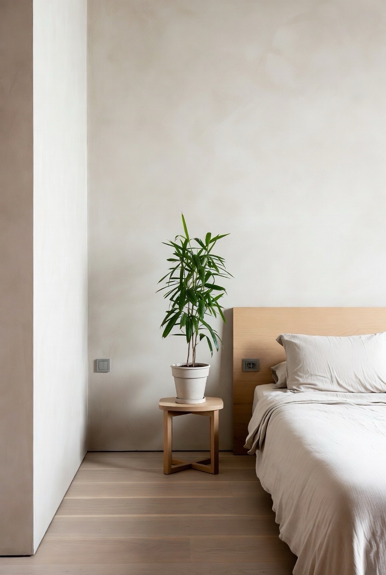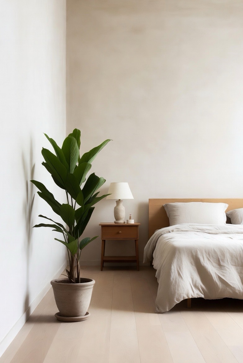 A single potted plant or small cluster of greenery adds life to a minimalist bedroom. Choose plants with clean shapes like snake plants, olive trees, or succulents. Their natural color and soft forms complement the neutral palette and introduce a refreshing touch. Keep it simple to maintain the minimalist vibe.