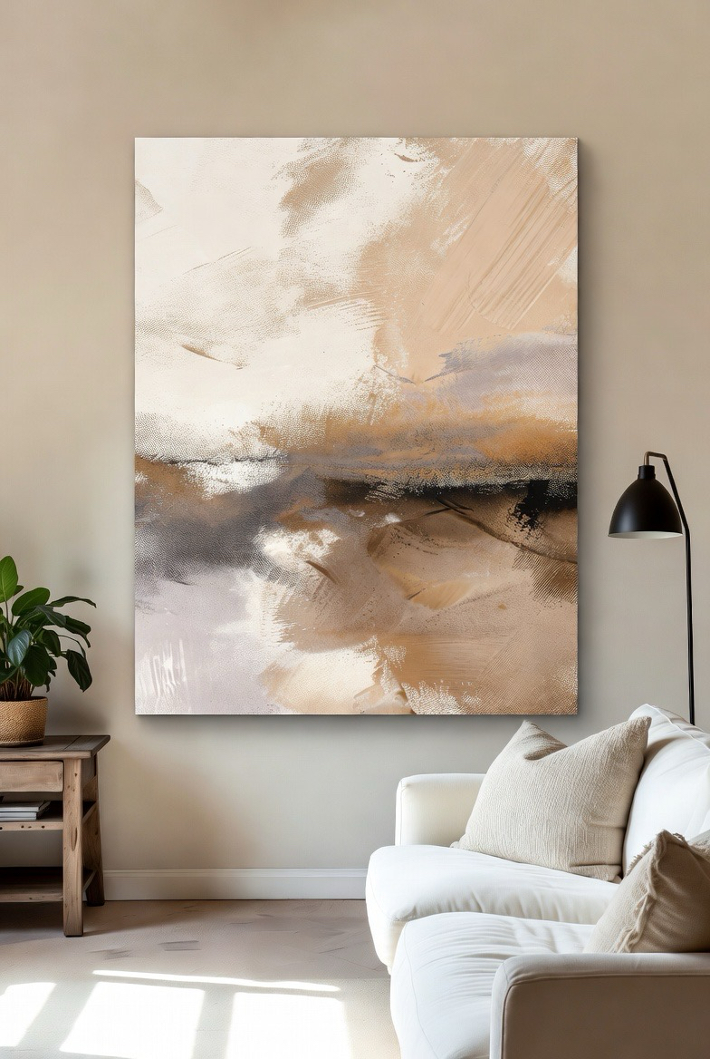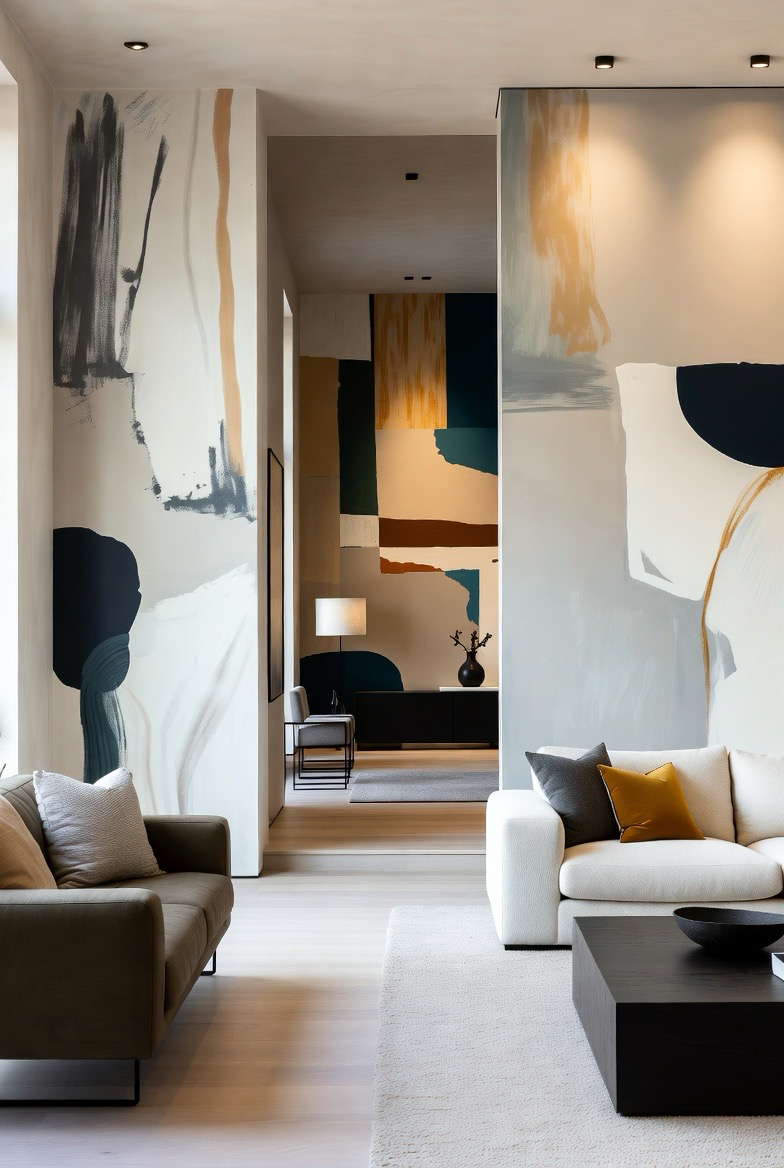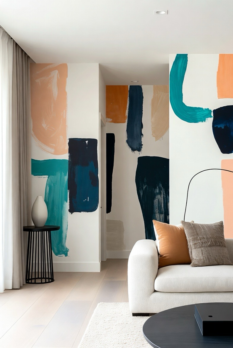 Abstract murals transform walls into art installations. Soft brushstrokes, geometric patterns, or neutral gradients create a bold yet refined statement. Murals work best in open living spaces where the wall can be appreciated fully.