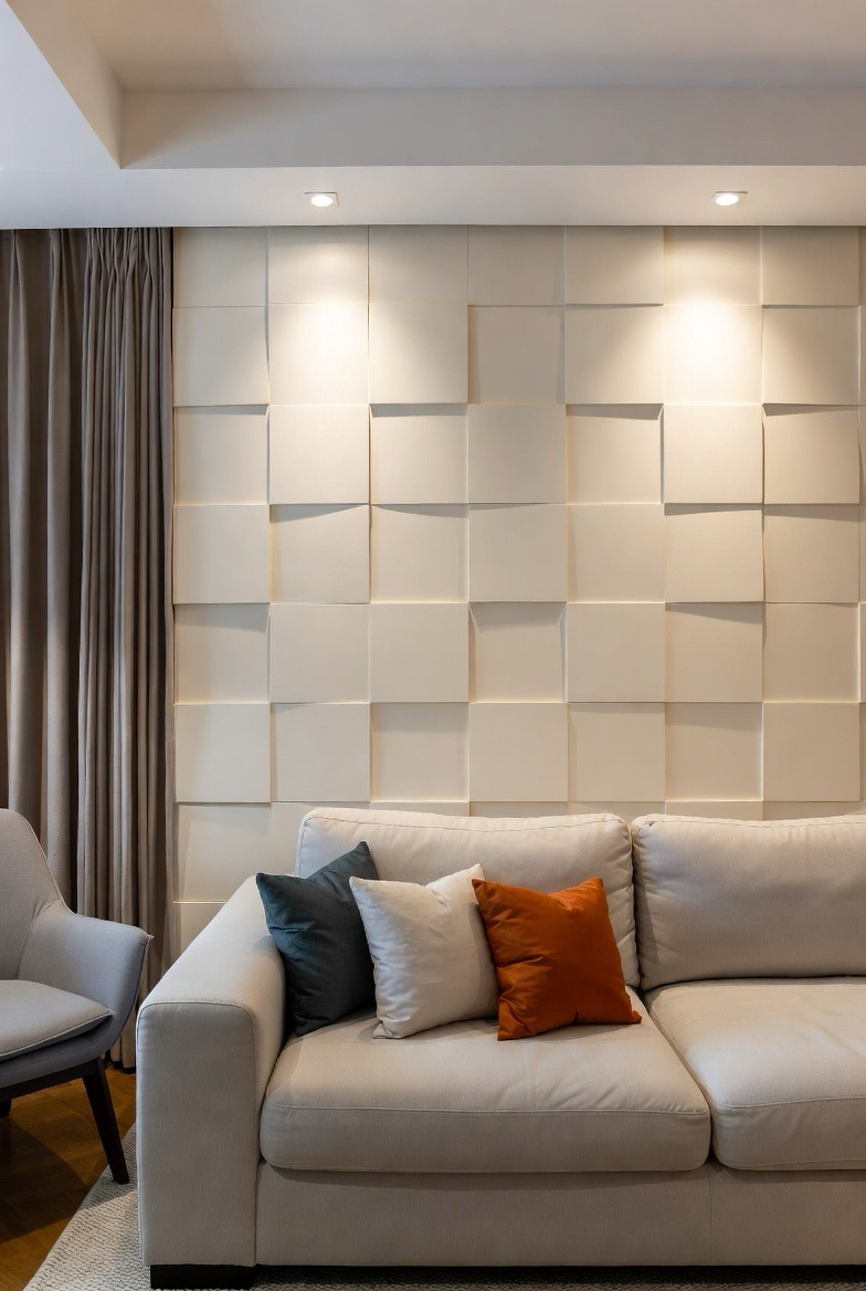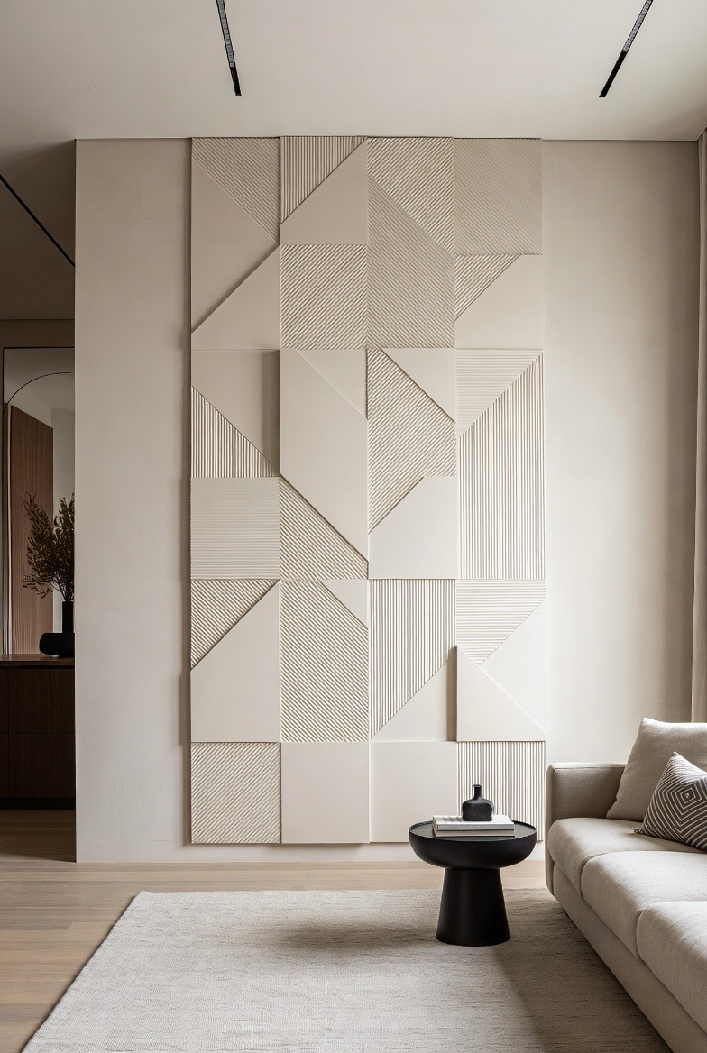 Sculptural wall panels add texture and depth to modern living rooms. Whether crafted from wood, plaster, or geometric materials, these panels create a three-dimensional effect that feels architectural and refined. They’re ideal for accent walls and work especially well in neutral color schemes, adding visual interest without relying on artwork or heavy decor.