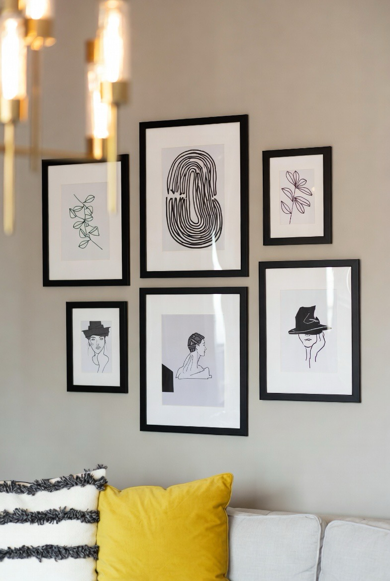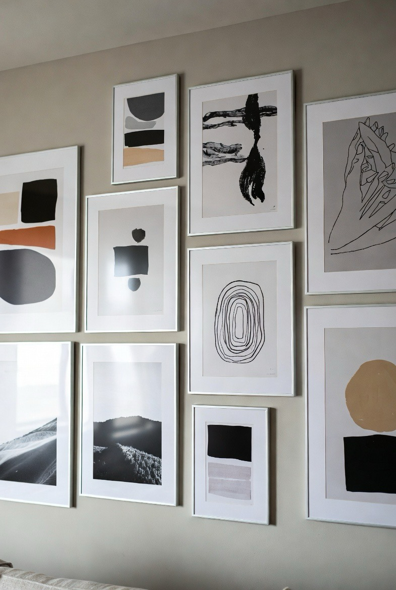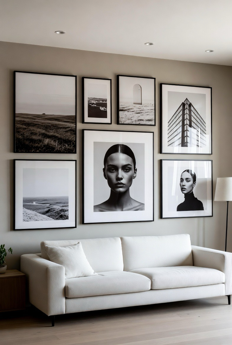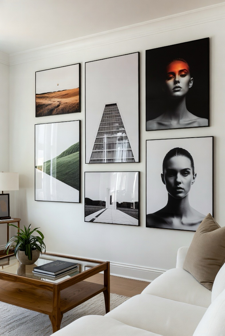 A modern gallery wall focuses on cohesion rather than clutter. Use matching frames, consistent spacing, and a unified color palette to keep the look clean and intentional. Mix abstract prints, photography, and minimal illustrations for variety while maintaining balance. This approach allows personality to shine while preserving a sleek, contemporary feel.