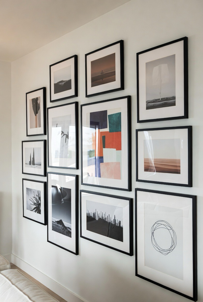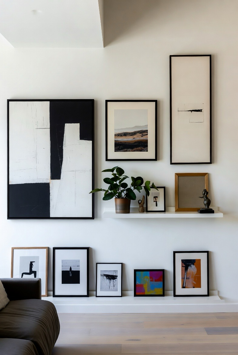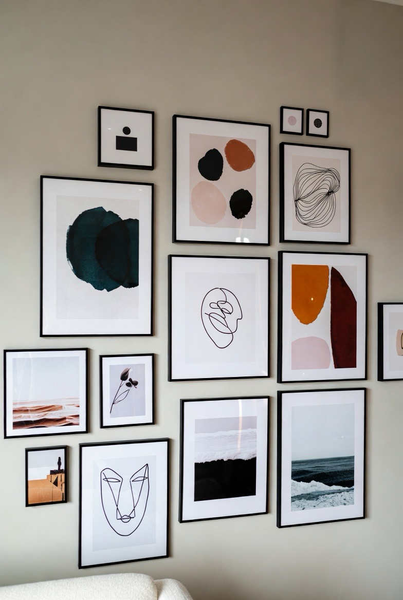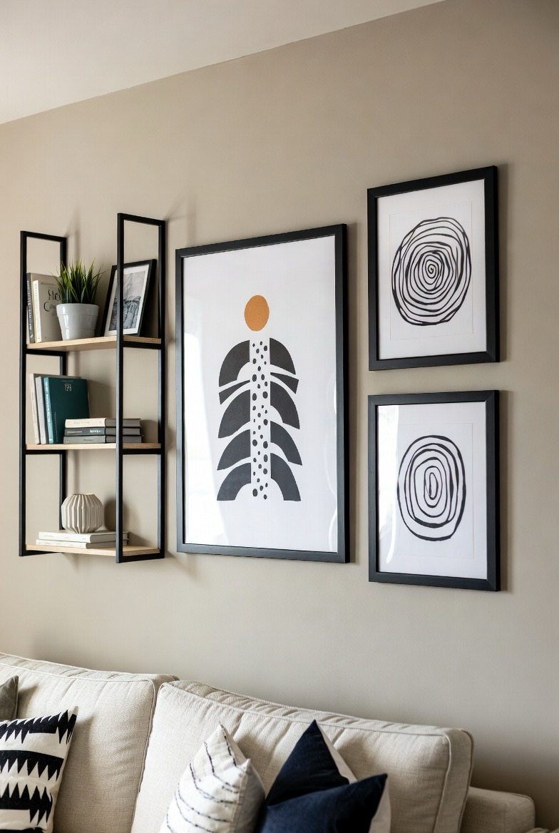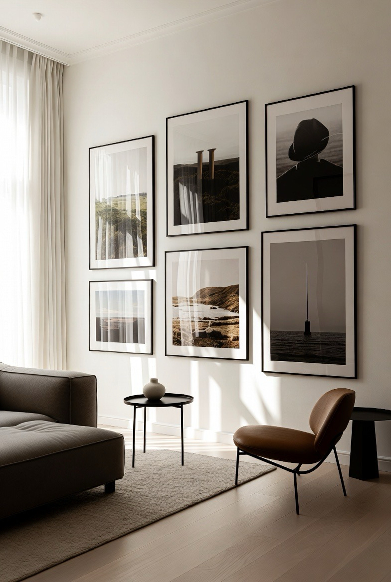 A modern gallery wall focuses on cohesion rather than clutter. Use matching frames, consistent spacing, and a unified color palette to keep the look clean and intentional. Mix abstract prints, photography, and minimal illustrations for variety while maintaining balance. This approach allows personality to shine while preserving a sleek, contemporary feel.