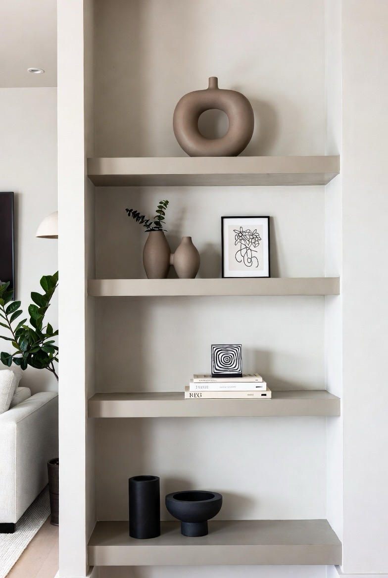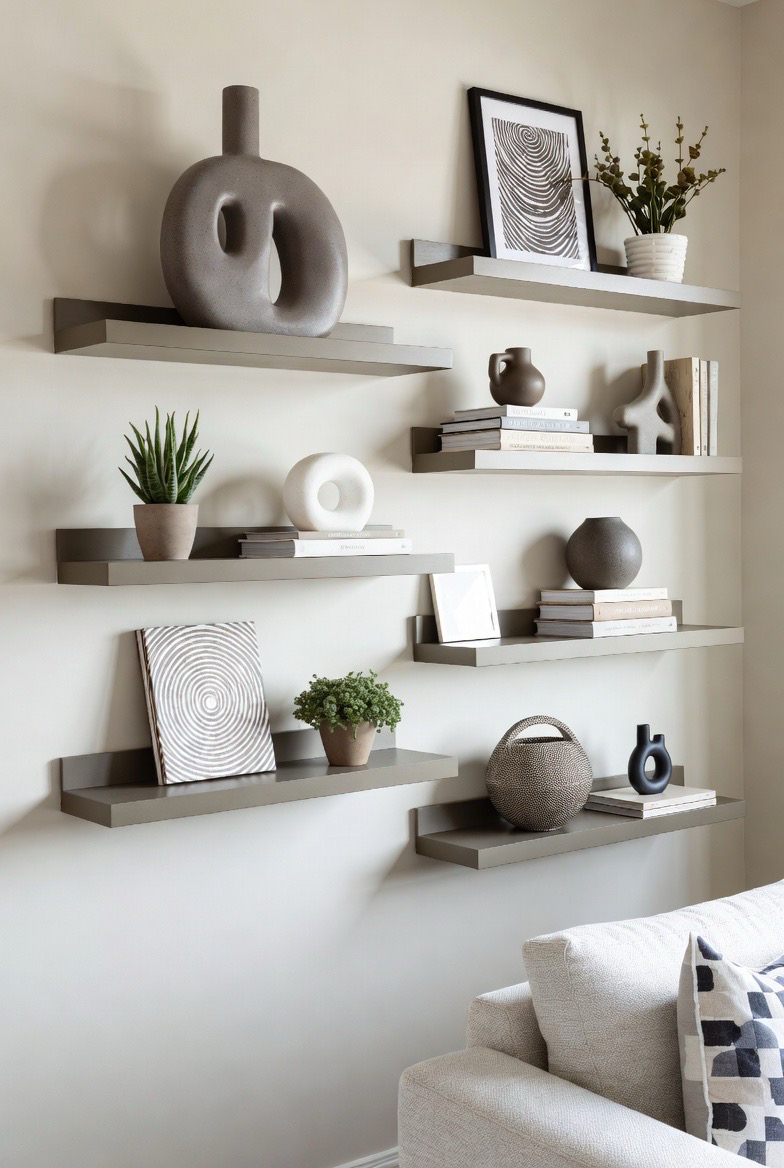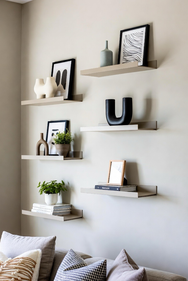 Floating shelves provide a modern way to display decor without visual heaviness. Style them with sculptural vases, small plants, art objects, and books in varying heights. Keeping a neutral or monochrome palette ensures a clean, designer look while allowing subtle personality to emerge through carefully chosen pieces.