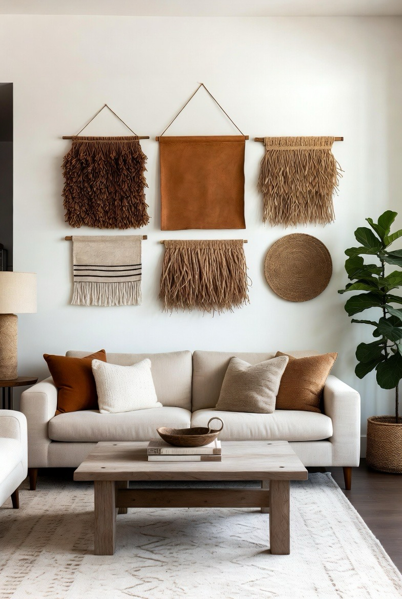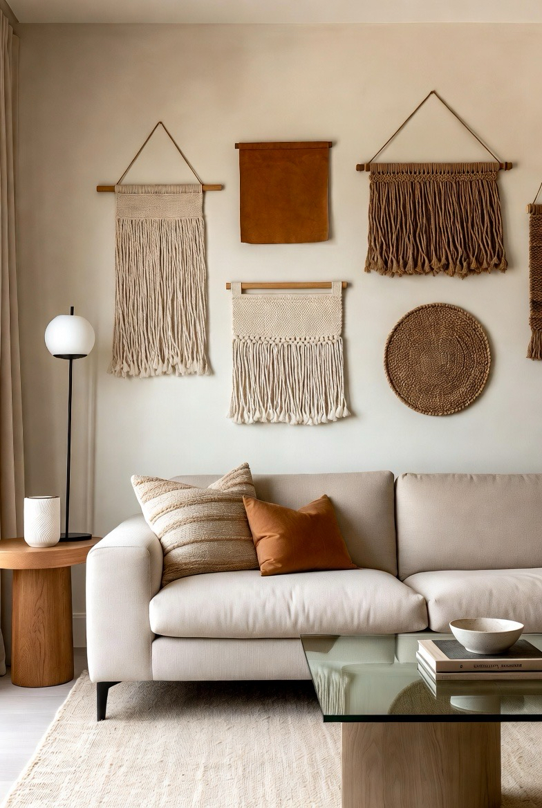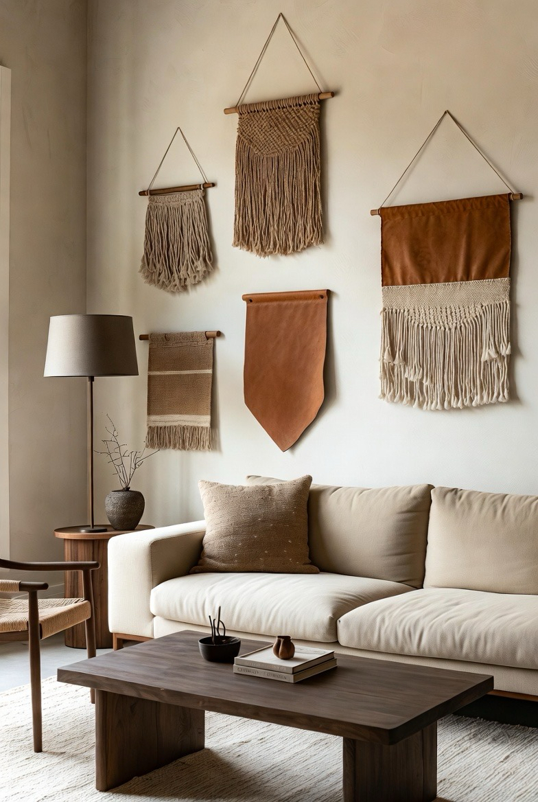 Modern wall hangings made from woven fibers, leather, or fabric introduce warmth and softness. These pieces balance sleek furniture and hard surfaces, creating a cozy yet contemporary atmosphere. Neutral-toned wall hangings work especially well in minimalist living rooms, adding interest without overpowering the design.