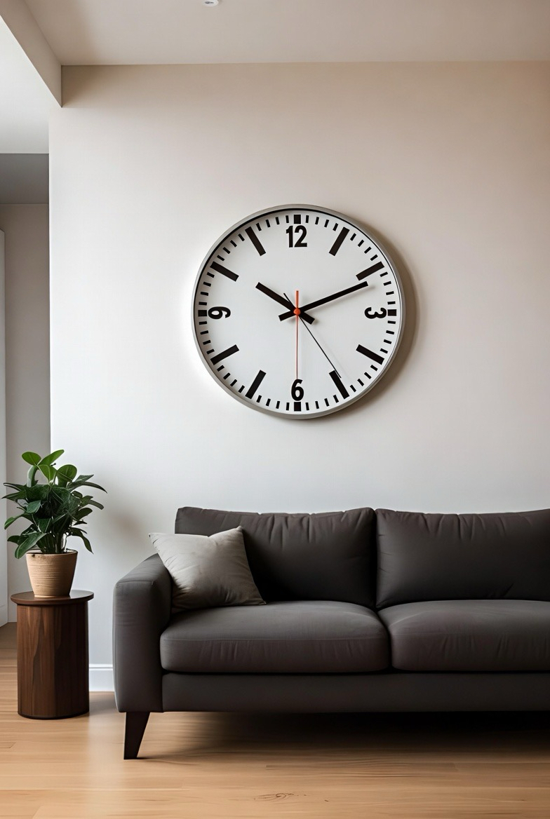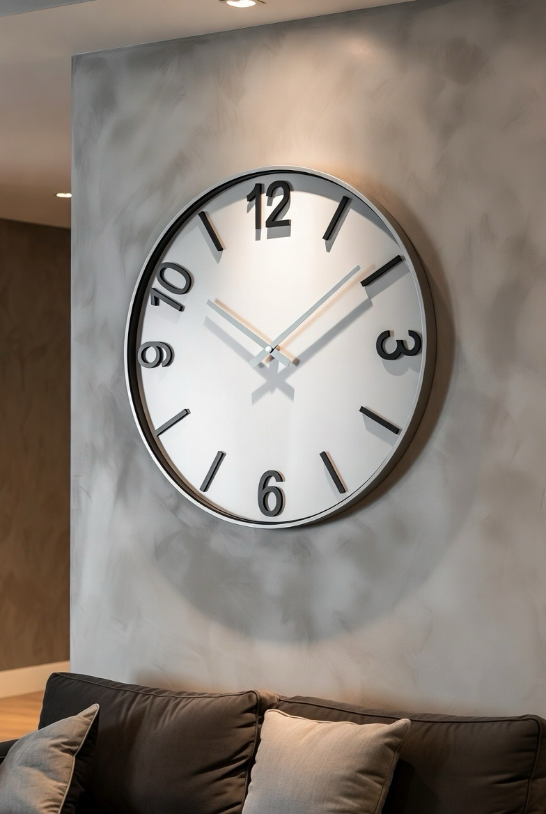 A large, modern wall clock doubles as functional art. Choose minimalist designs with clean lines, metal finishes, or oversized numerals. Positioned above a sofa or fireplace, a statement clock anchors the wall while reinforcing a modern, intentional aesthetic.