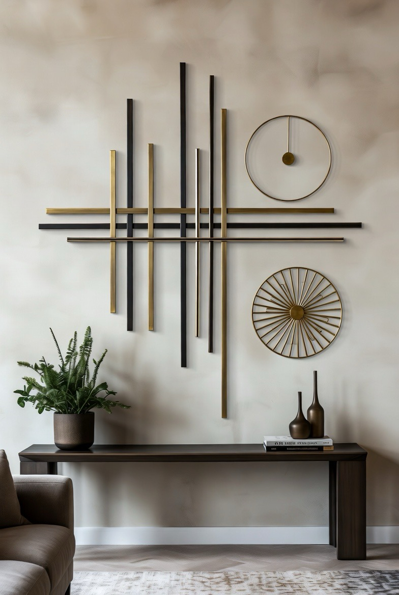 Metal wall art brings a sleek, contemporary edge to living rooms. Designs featuring abstract lines, sunburst shapes, or layered metal elements create movement and shine. Black, brass, or matte gold finishes pair beautifully with modern furniture and neutral walls.