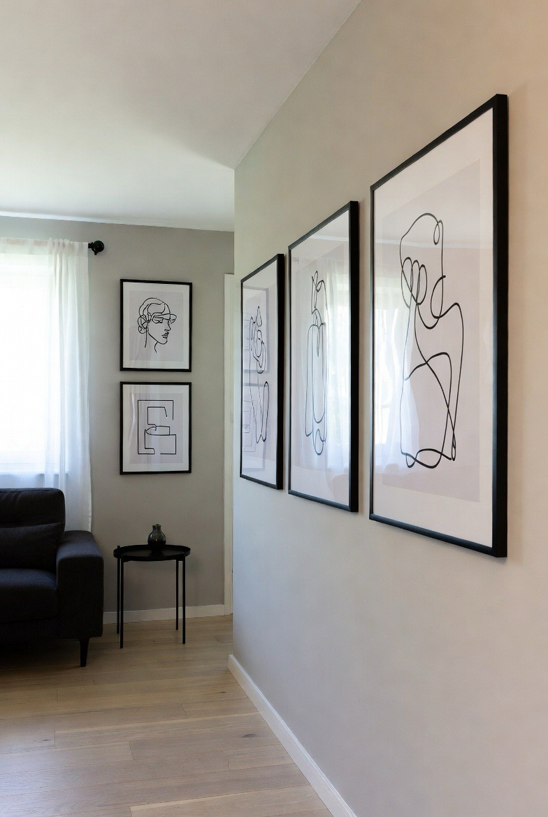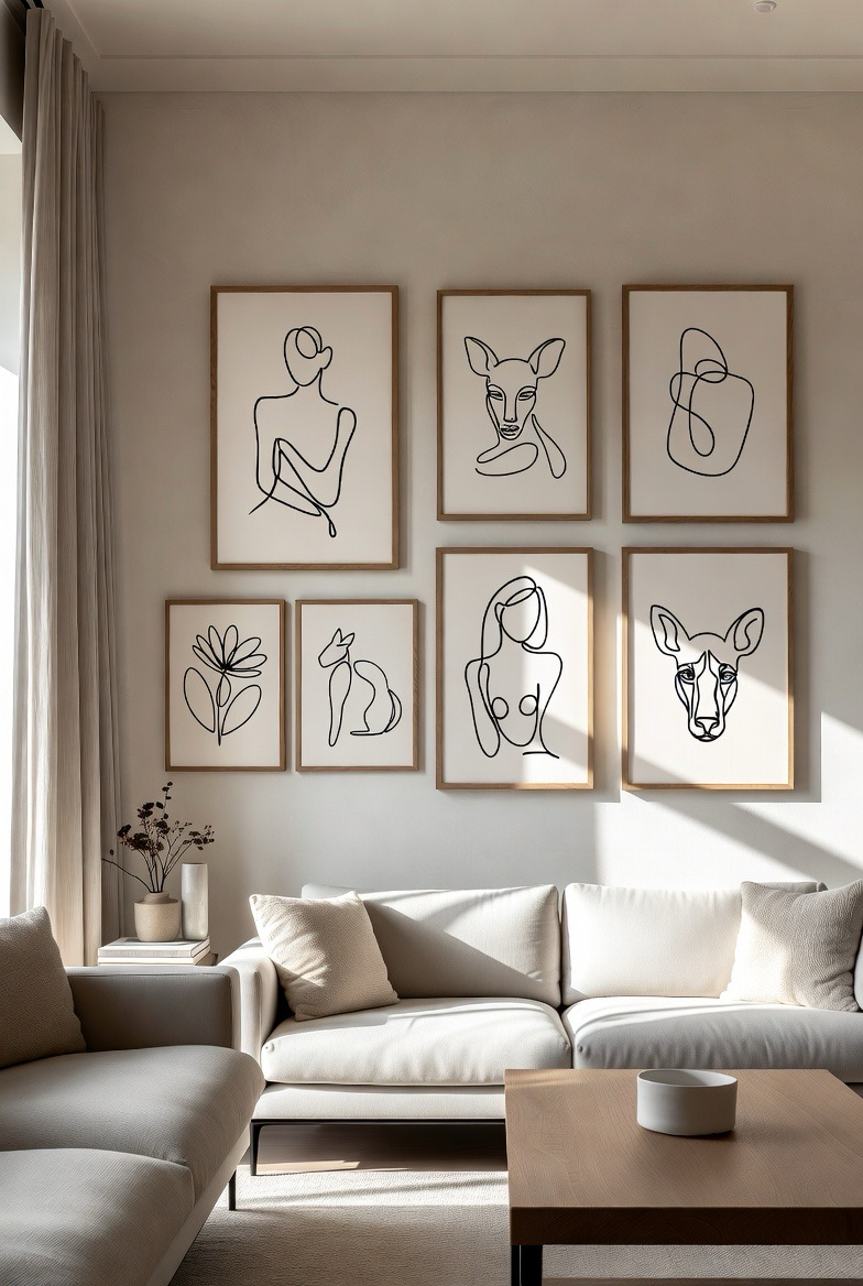 Line art is a modern favorite for its simplicity and elegance. Black-and-white sketches or continuous-line illustrations add sophistication without visual clutter. Grouped in pairs or triptychs, line art creates harmony and complements contemporary living room styles effortlessly.