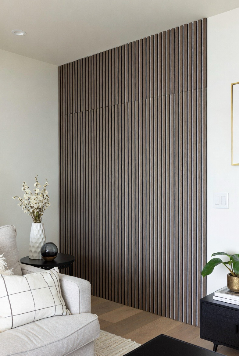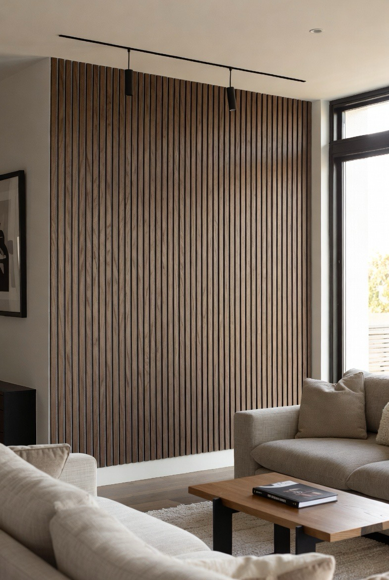 Wooden slat walls introduce warmth while maintaining a modern edge. Vertical slats create height and visual rhythm, making the living room feel more spacious. This decor idea pairs well with neutral furniture, adding contrast and architectural interest.