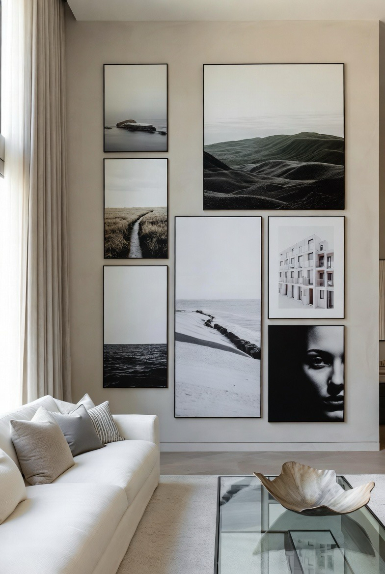 Modern photography, especially landscapes, architectural shots, or monochrome portraits, adds depth and storytelling to living room walls. Oversized framed photos feel gallery-inspired and create a refined focal point that elevates the overall design.