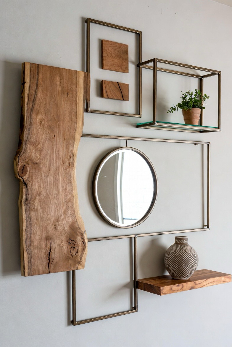 Combining materials like wood, metal, glass, and ceramic creates layered visual interest. Mixed-material wall decor adds richness without clutter when styled intentionally. This approach works especially well in modern living rooms seeking balance between warmth and structure.