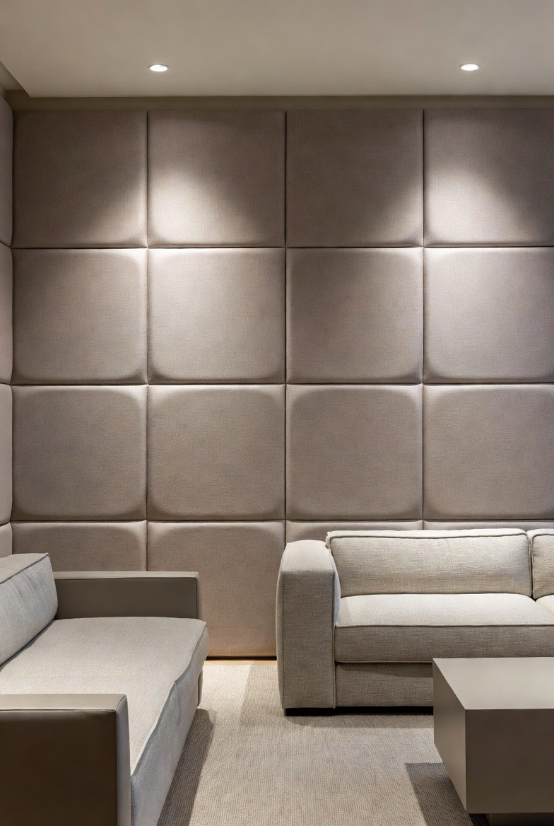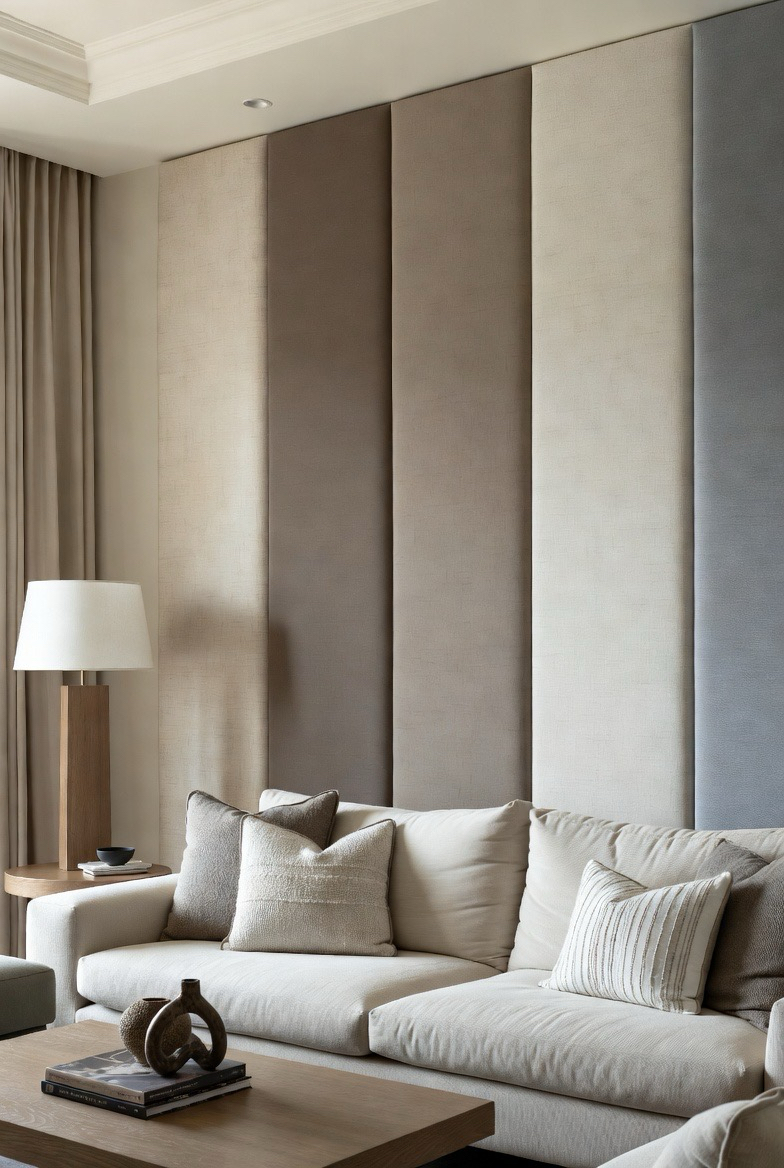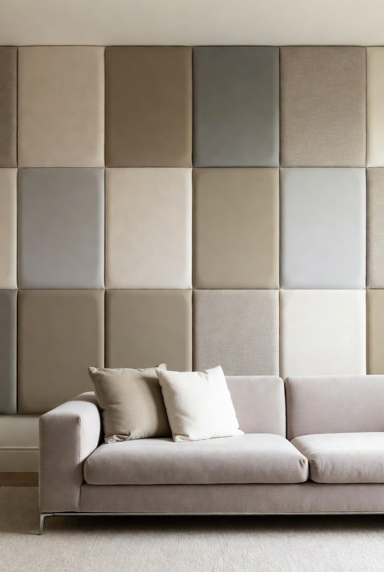 Fabric wall panels or padded textile art add softness and sound absorption. Neutral tones like beige, taupe, or gray enhance modern living rooms while providing a cozy, elevated feel that complements minimalist furniture.