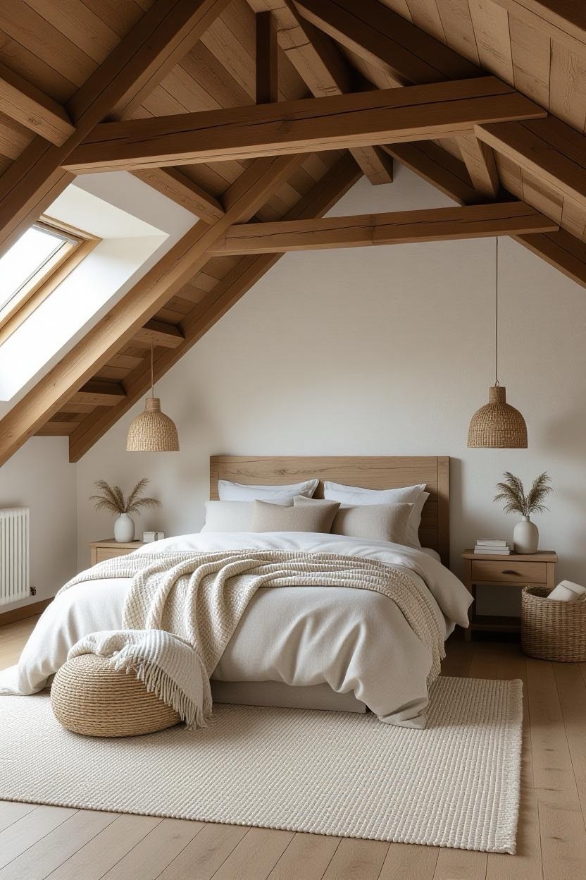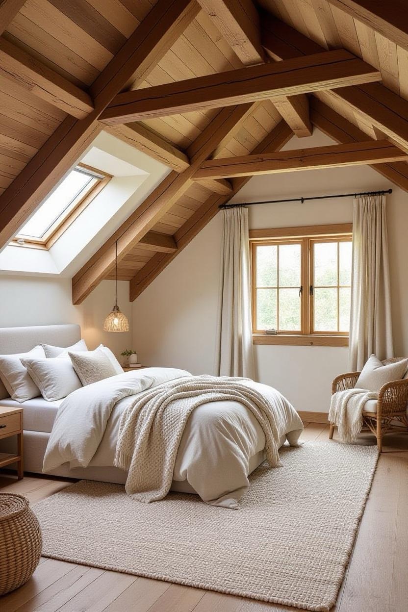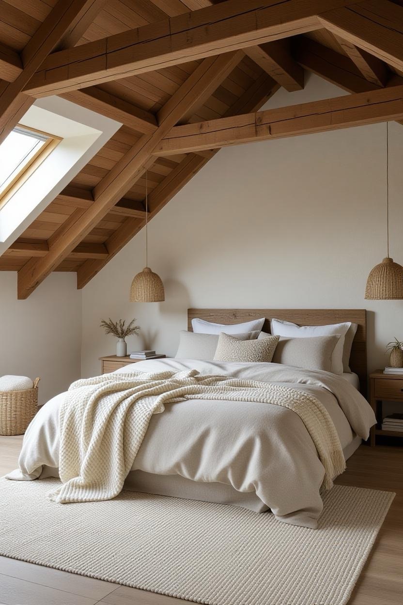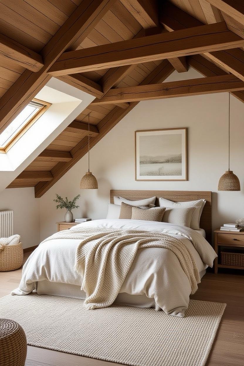 A rustic attic bedroom with wooden beams and neutral tones creates a warm, inviting retreat. Pair natural wood with cozy textiles like wool blankets and linen bedding to bring a cabin-like feel right into your home. Add a soft rug for comfort underfoot.