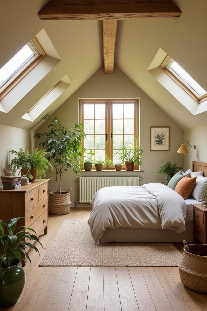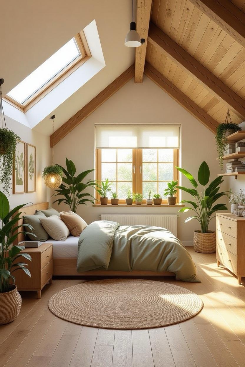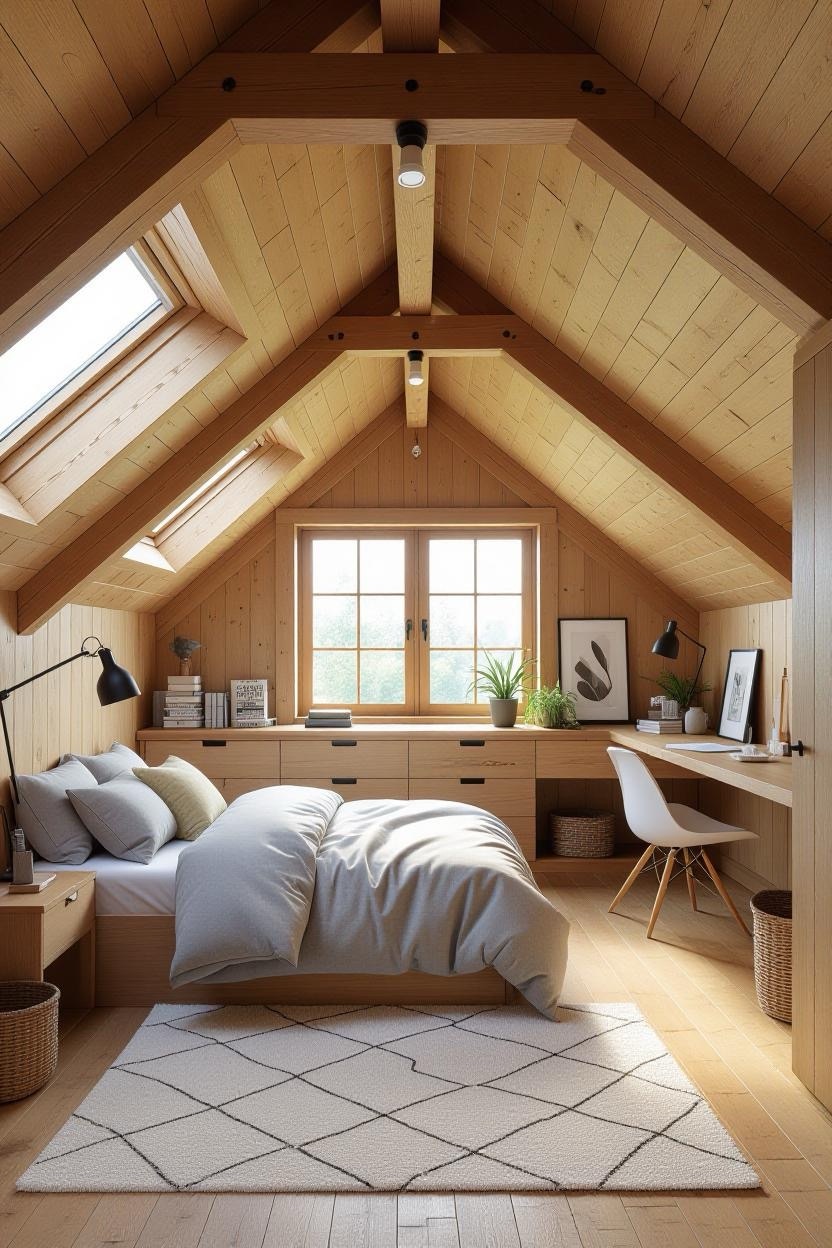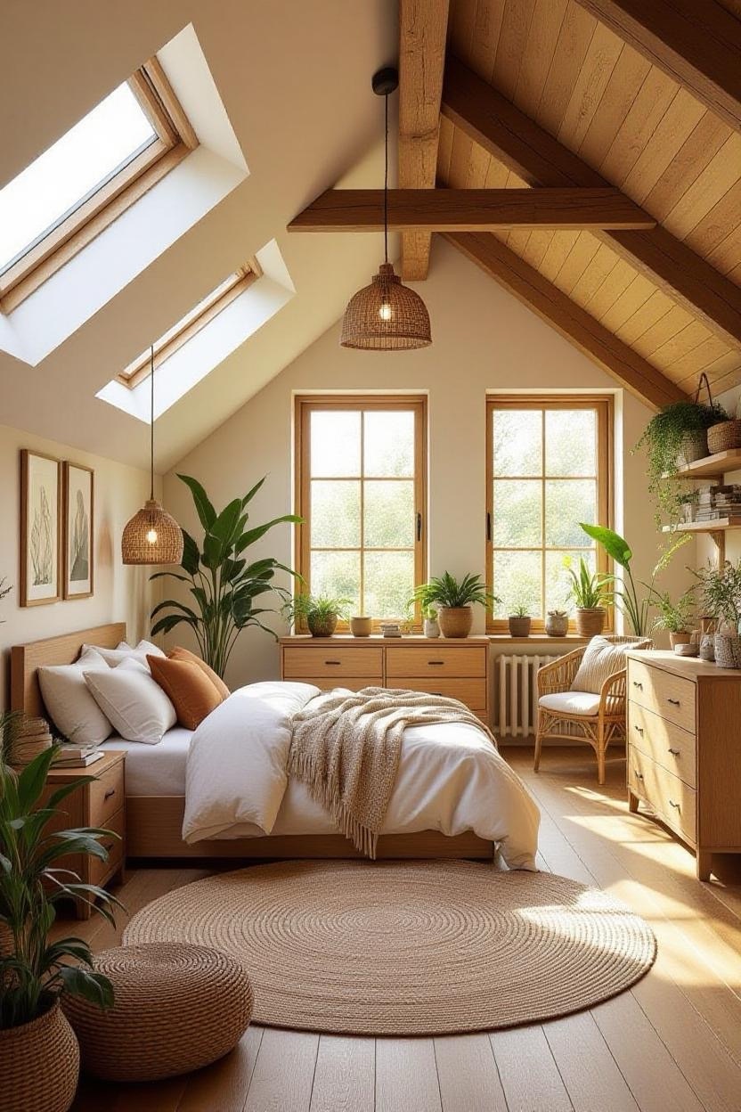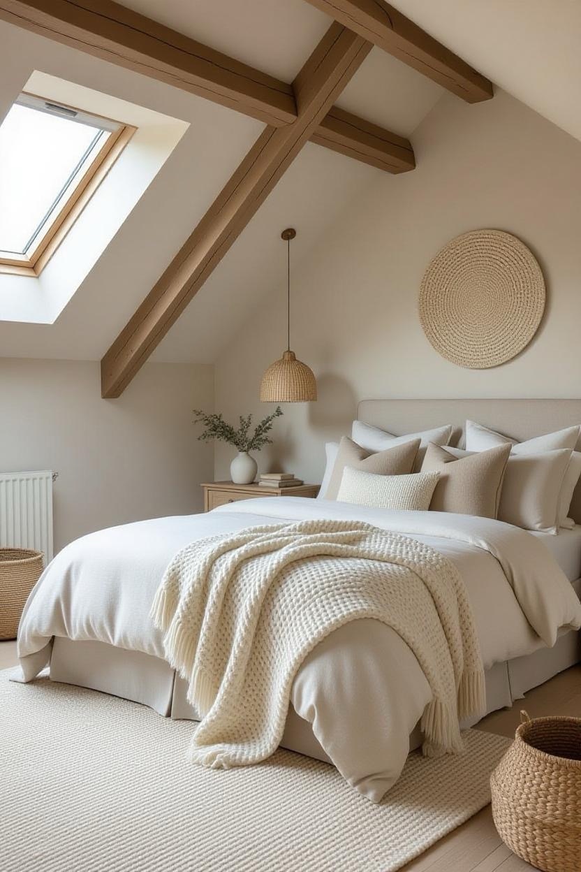 A rustic attic bedroom with wooden beams and neutral tones creates a warm, inviting retreat. Pair natural wood with cozy textiles like wool blankets and linen bedding to bring a cabin-like feel right into your home. Add a soft rug for comfort underfoot.