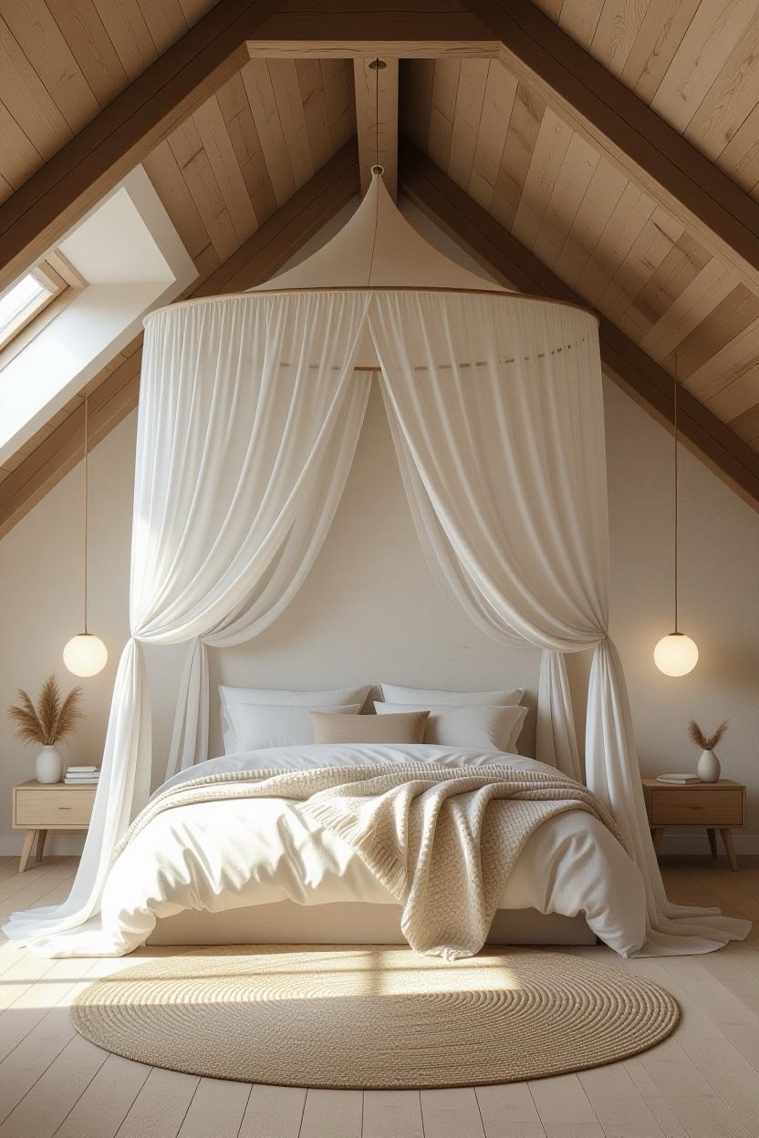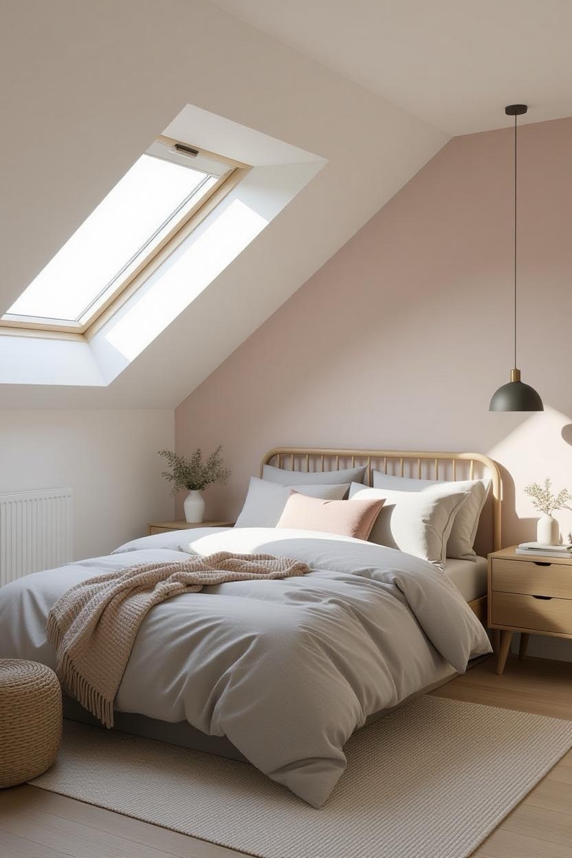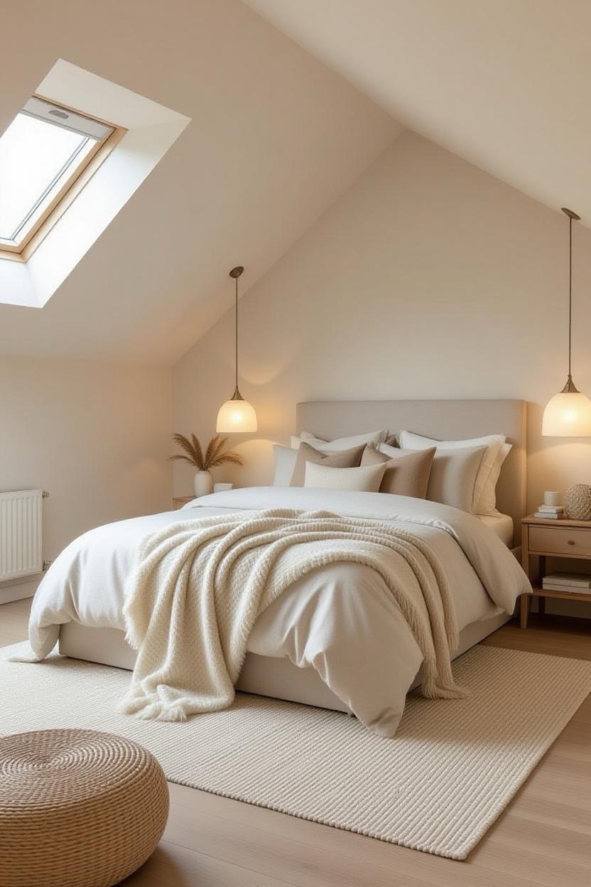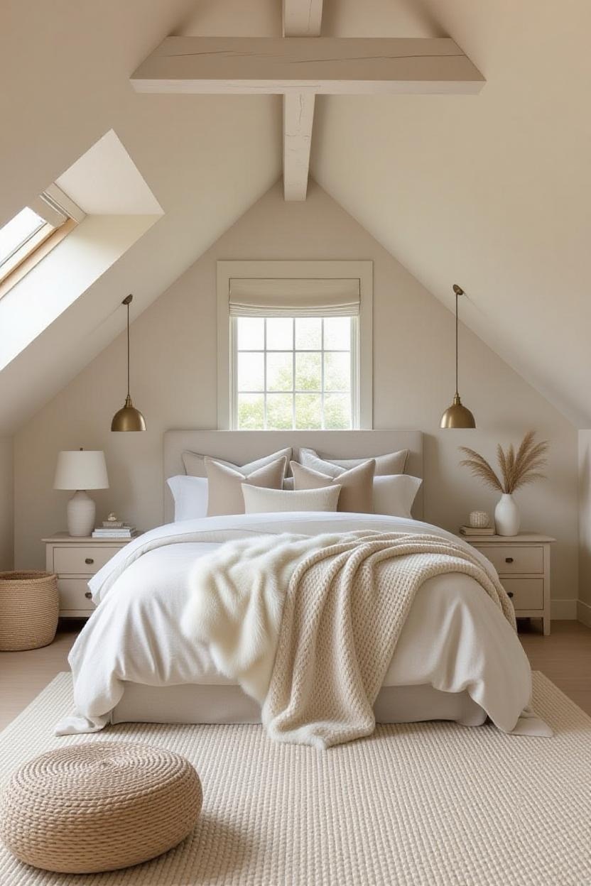 A rustic attic bedroom with wooden beams and neutral tones creates a warm, inviting retreat. Pair natural wood with cozy textiles like wool blankets and linen bedding to bring a cabin-like feel right into your home. Add a soft rug for comfort underfoot.
