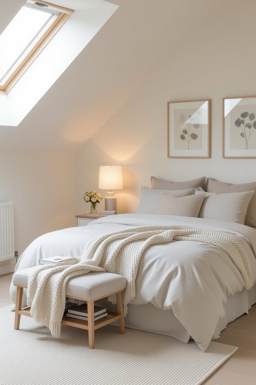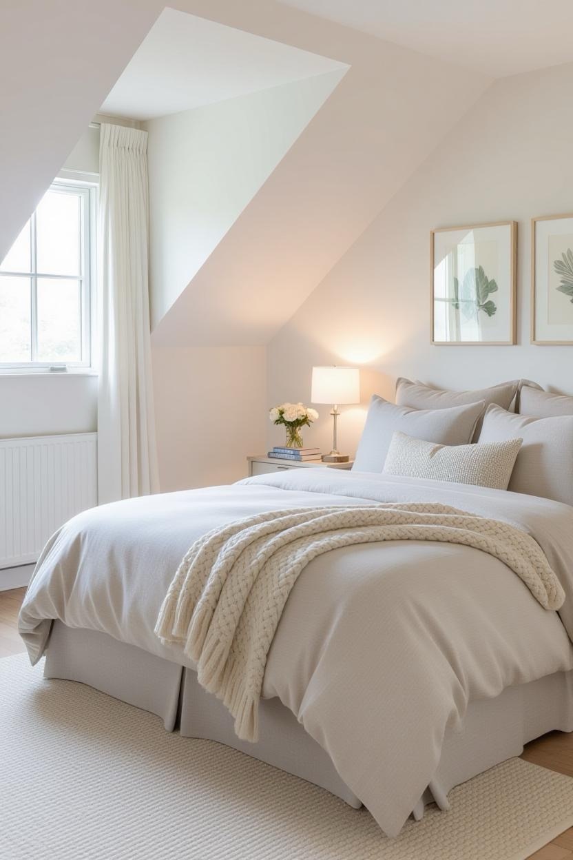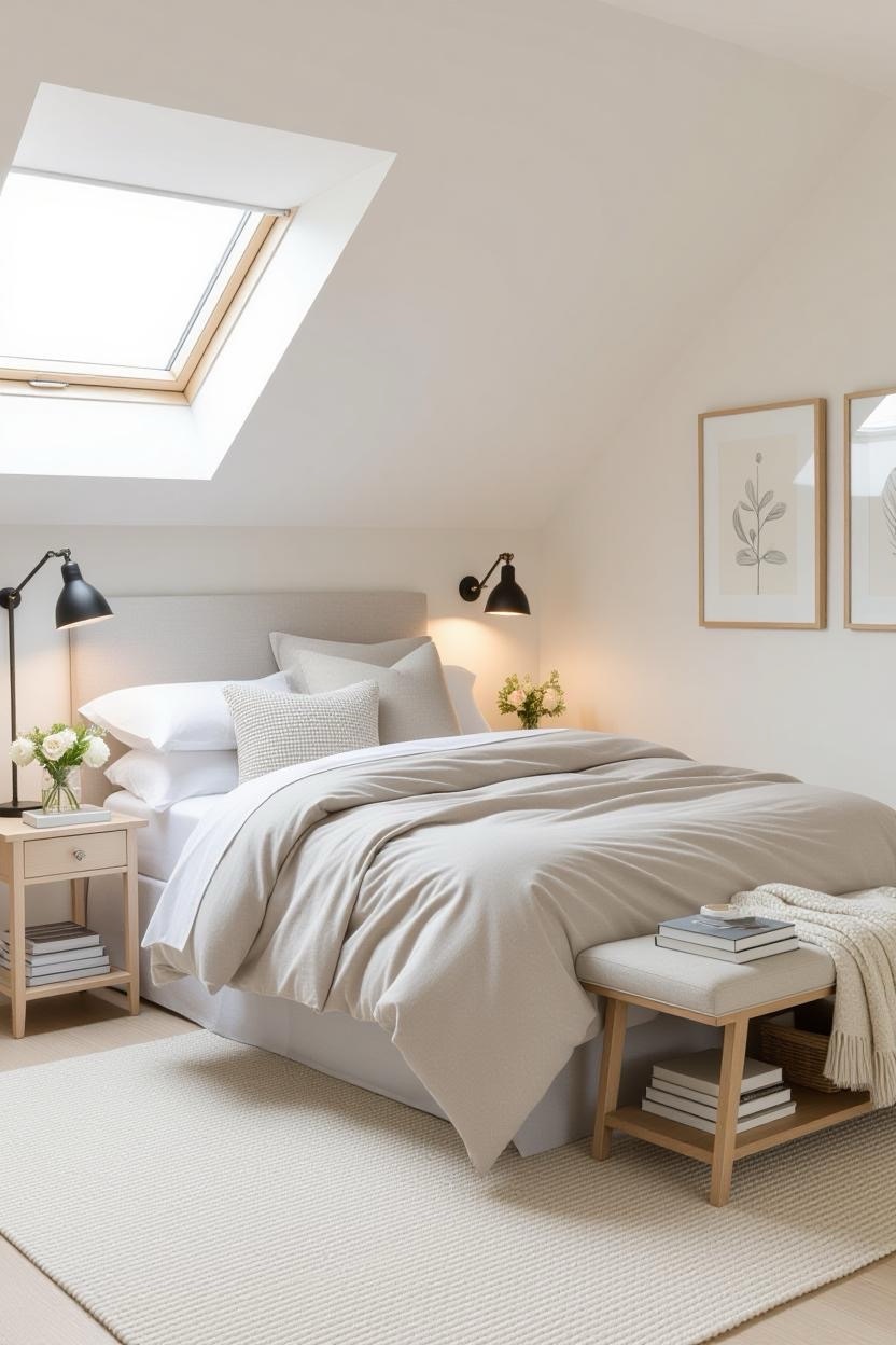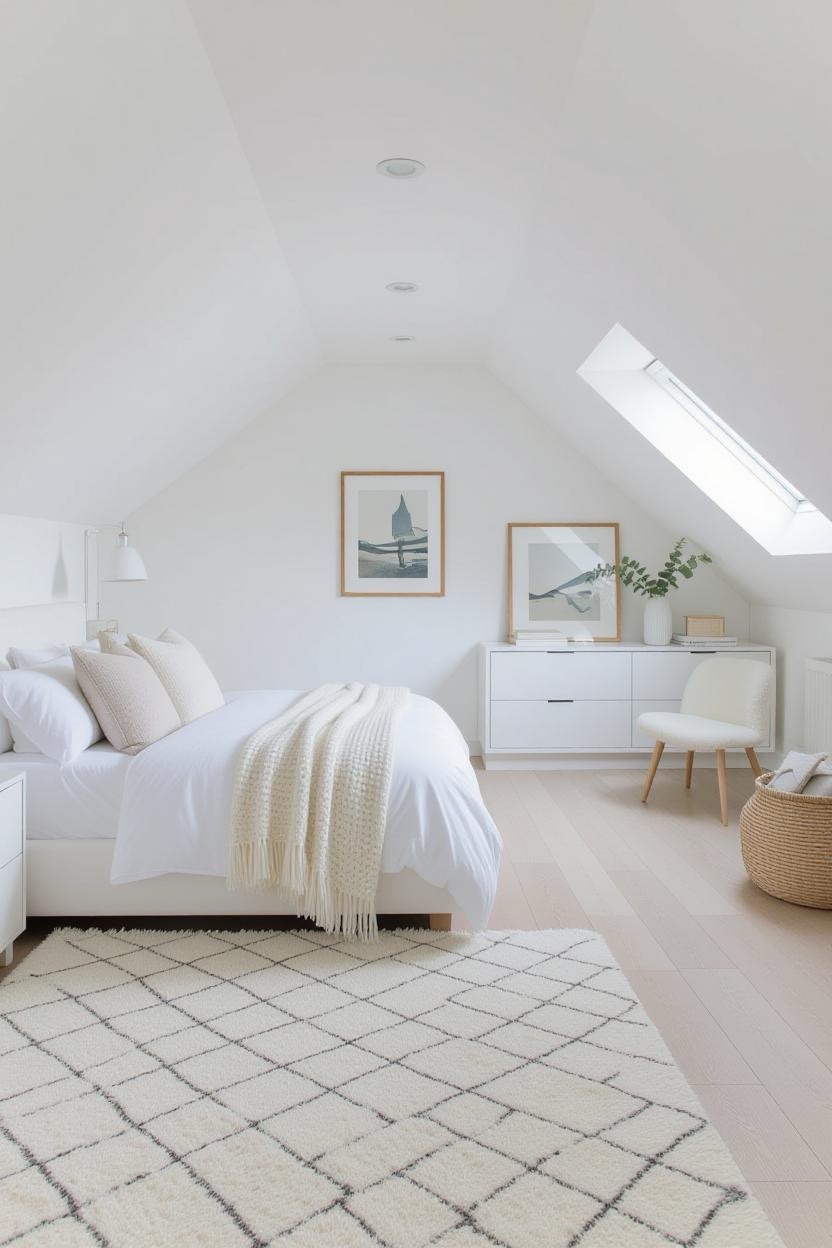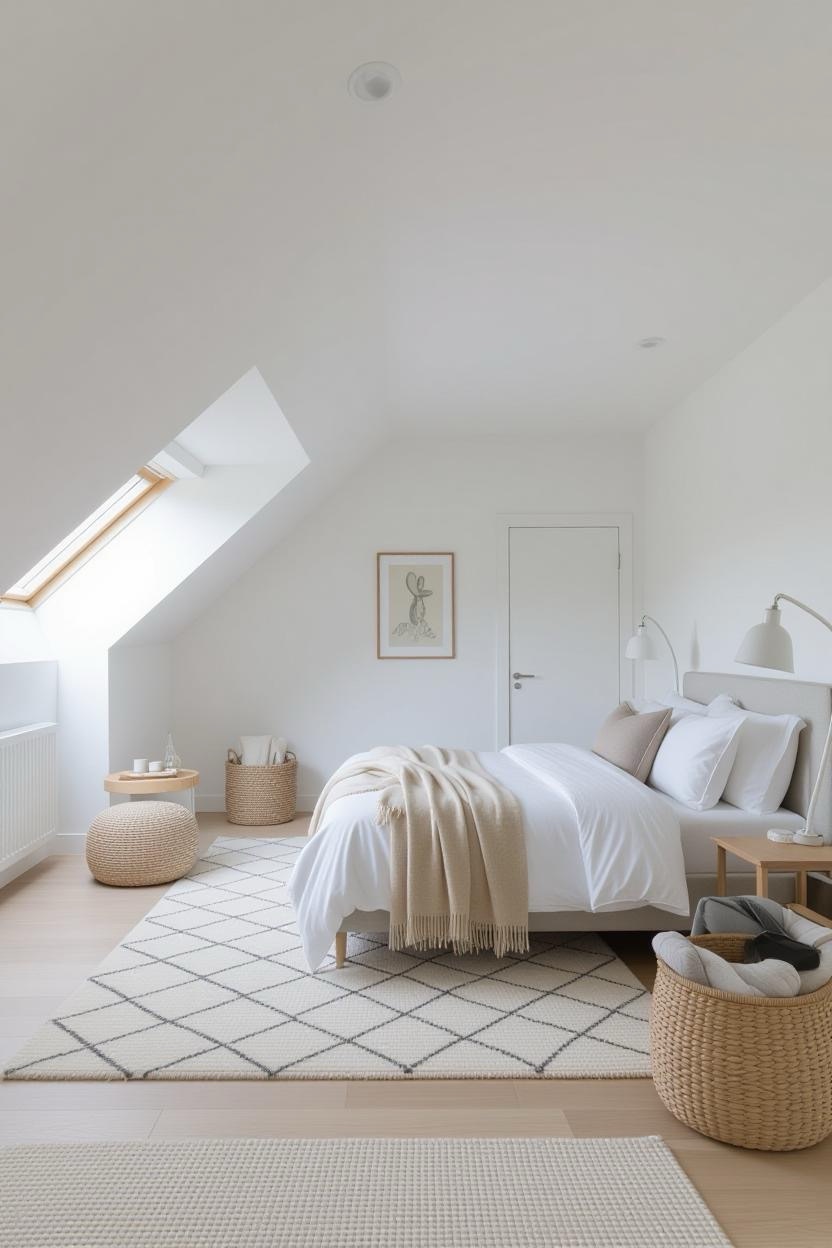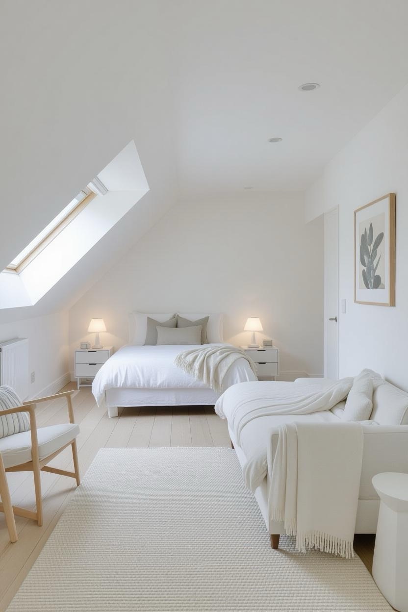 Painting attic walls and ceilings white instantly opens the space, making it appear larger and airier. A minimalist design with sleek furniture and light accents creates a clean, calming vibe, perfect for a restful retreat.