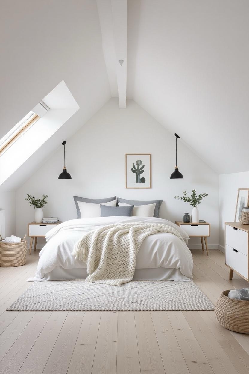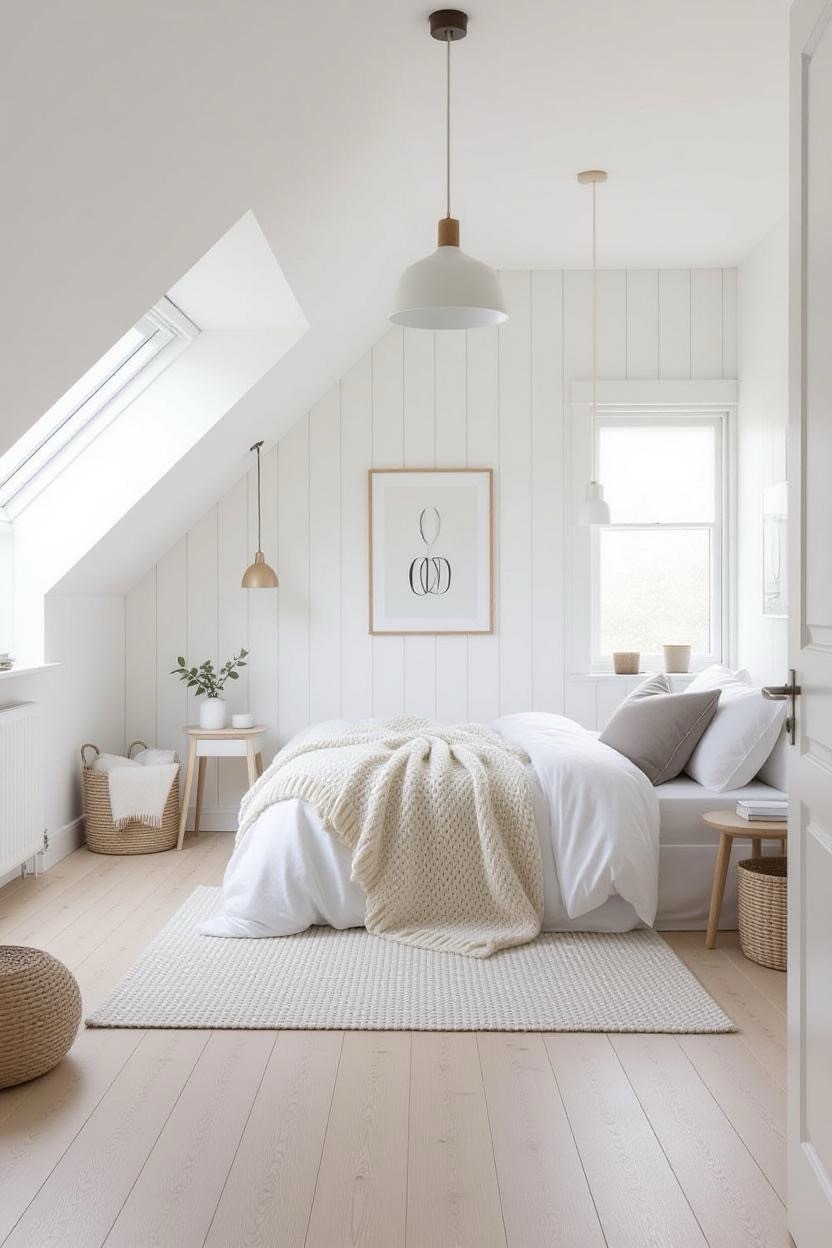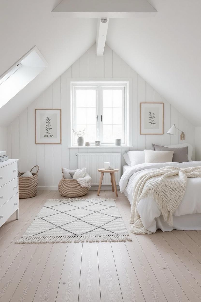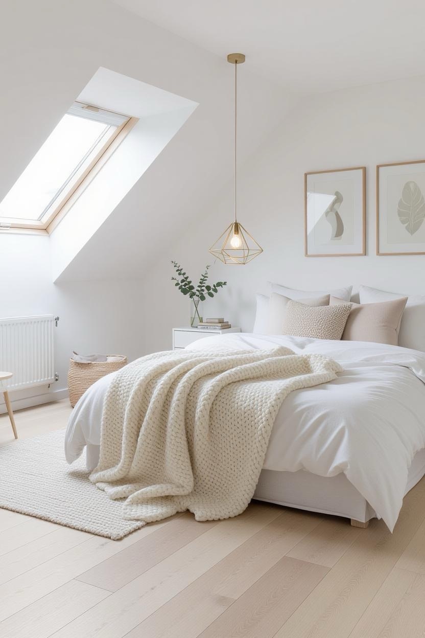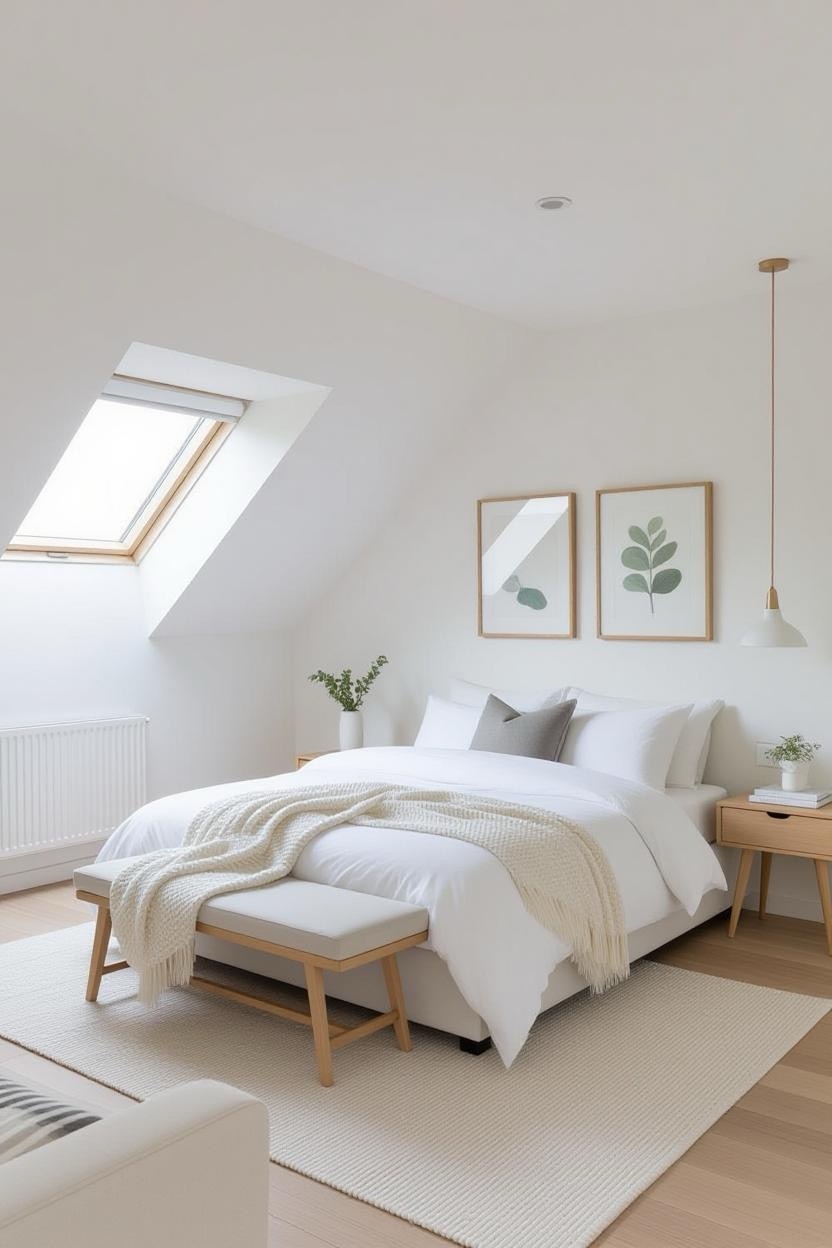 A Scandinavian-inspired attic with light wood flooring, white walls, and simple furnishings is effortlessly stylish. Add cozy throws and a few statement decor pieces to keep the look minimal yet warm.