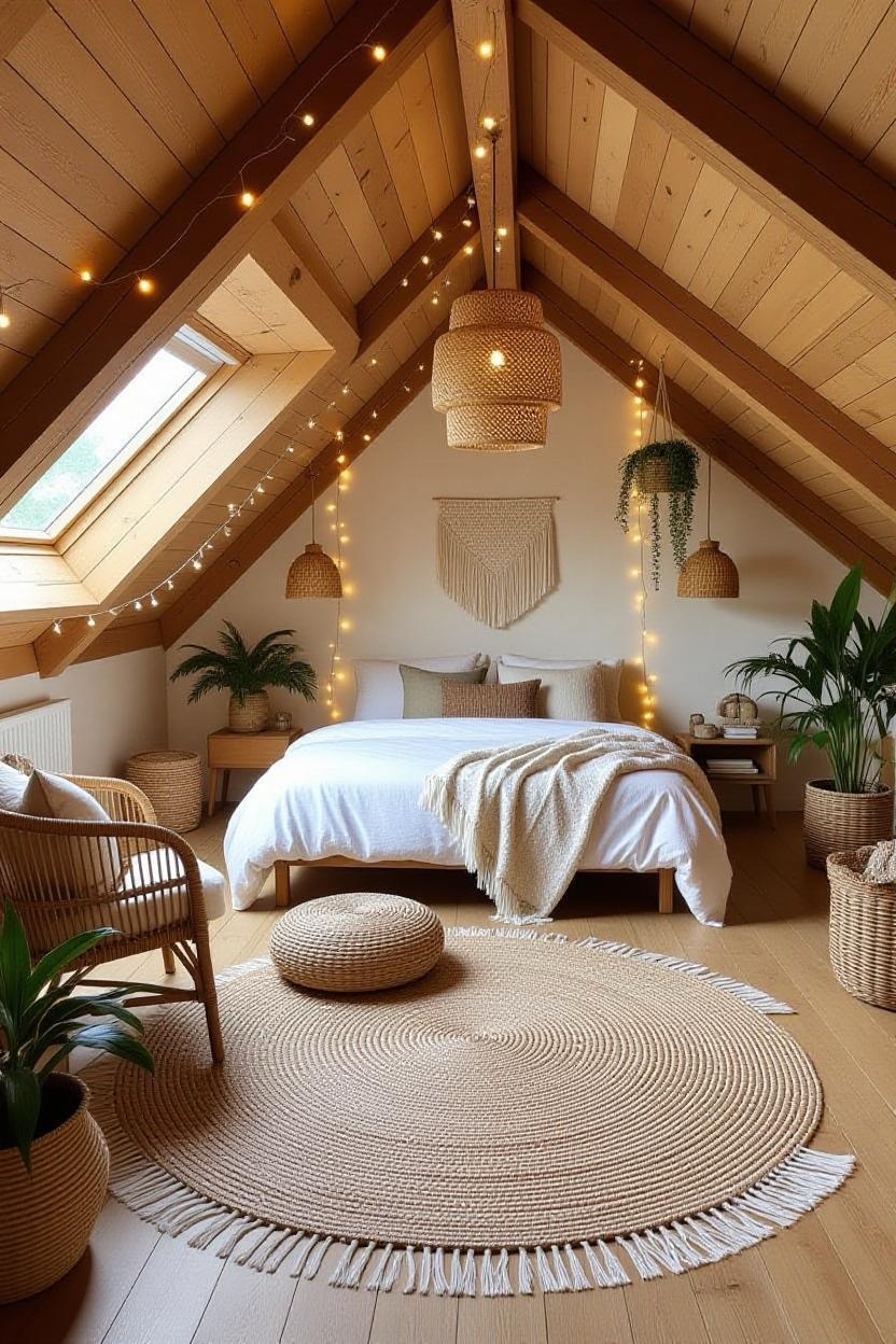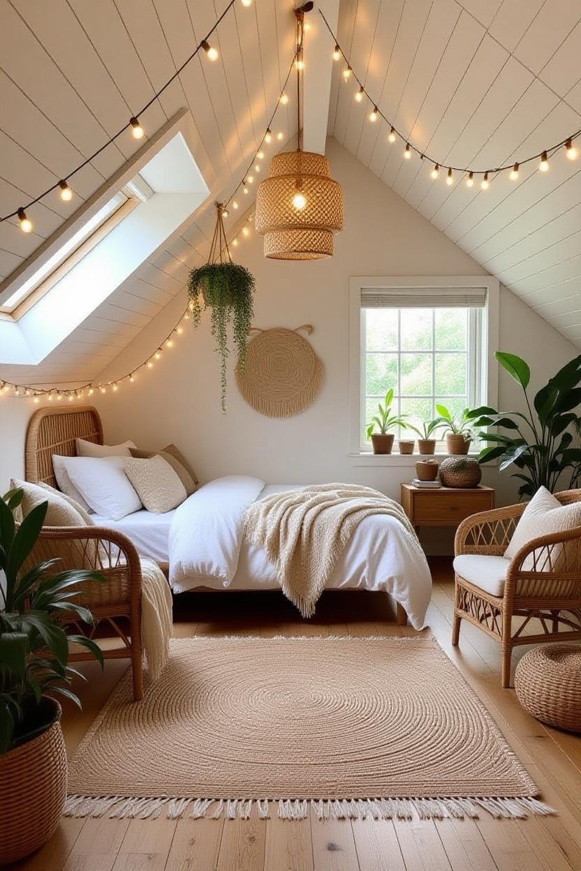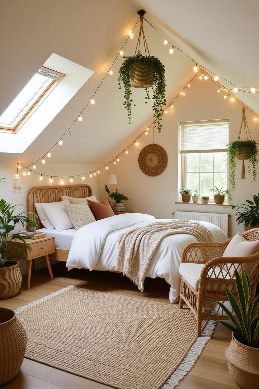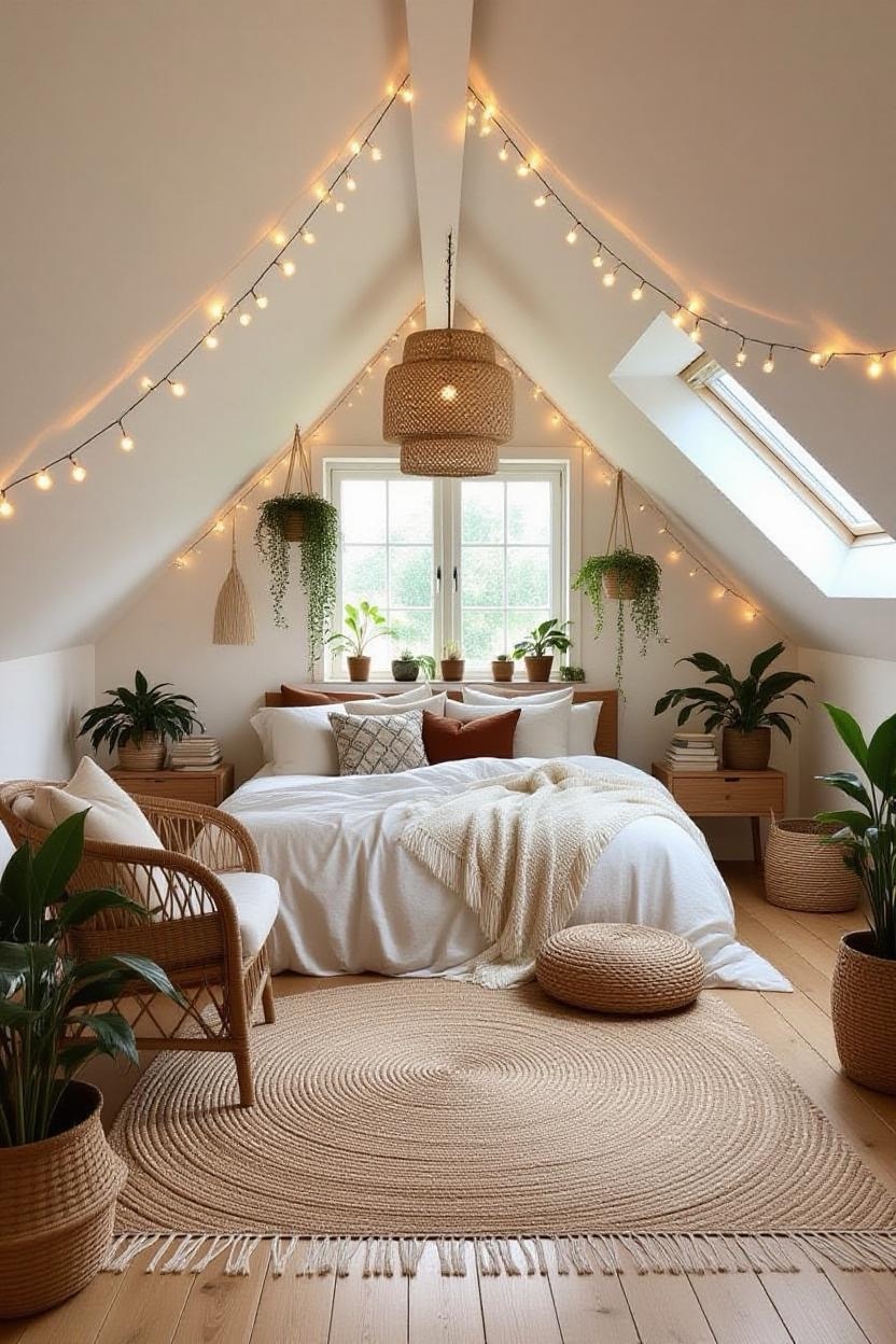Layered textiles, woven rugs, rattan furniture, and plants make an attic bedroom feel like a boho sanctuary. Hanging fairy lights along sloped ceilings adds a whimsical glow that makes the space extra cozy.
