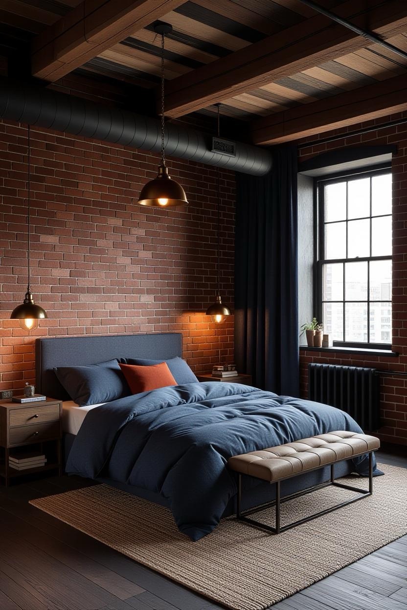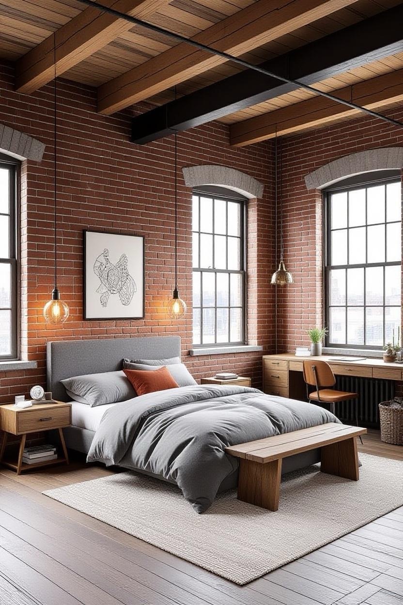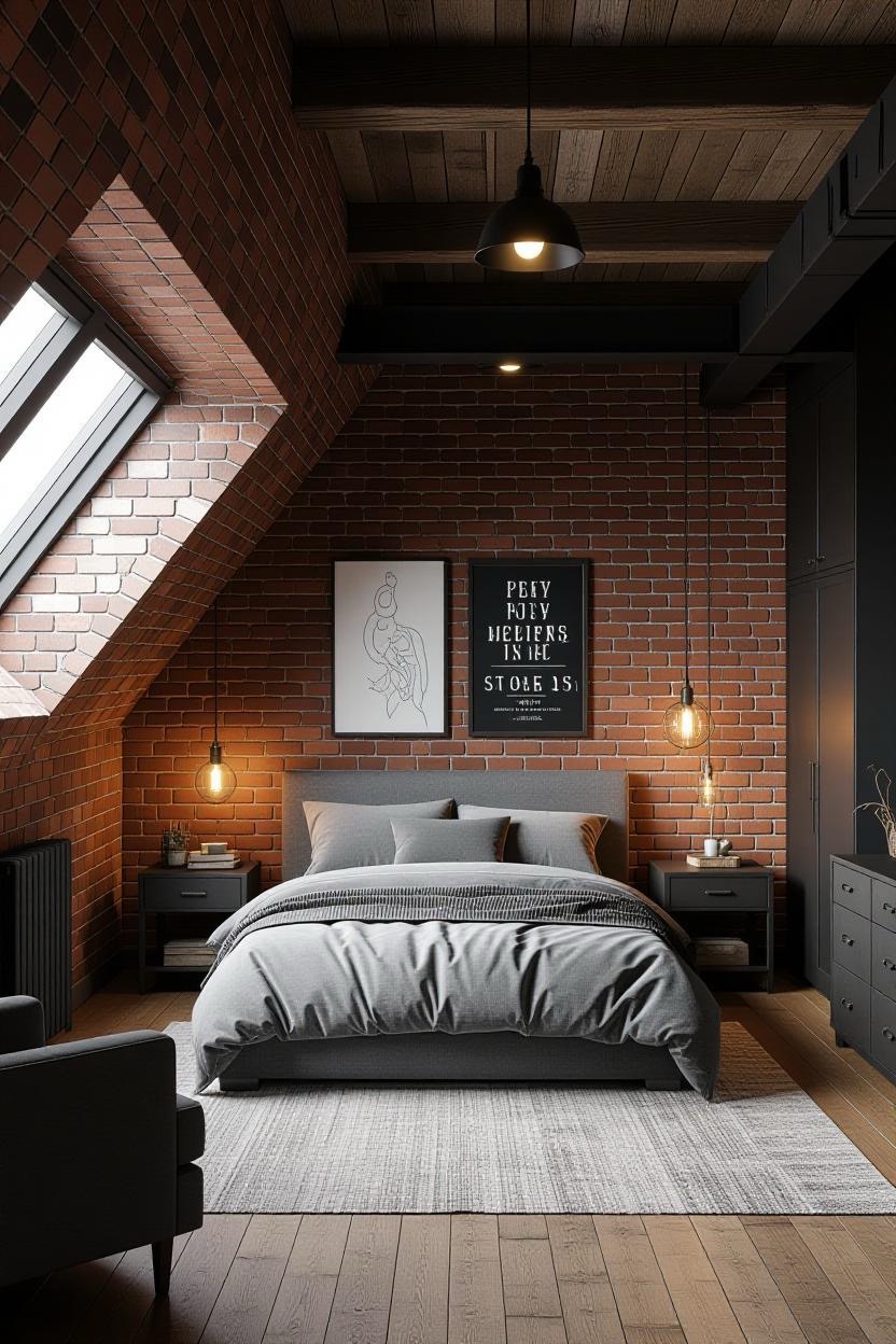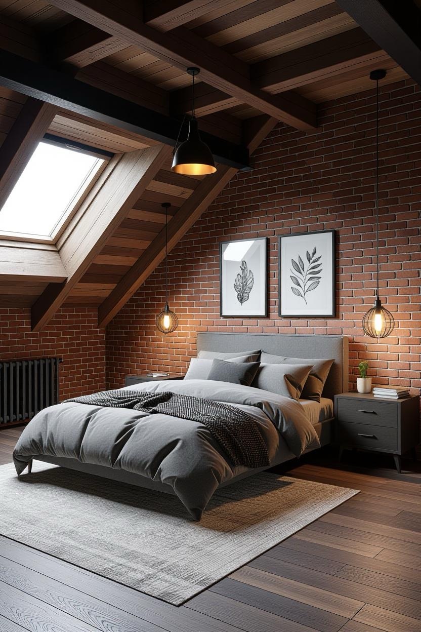 If you love edgy interiors, an industrial attic bedroom with exposed brick, metal accents, and moody colors is a perfect fit. Pair it with simple furniture and vintage-inspired lighting for an urban loft vibe.