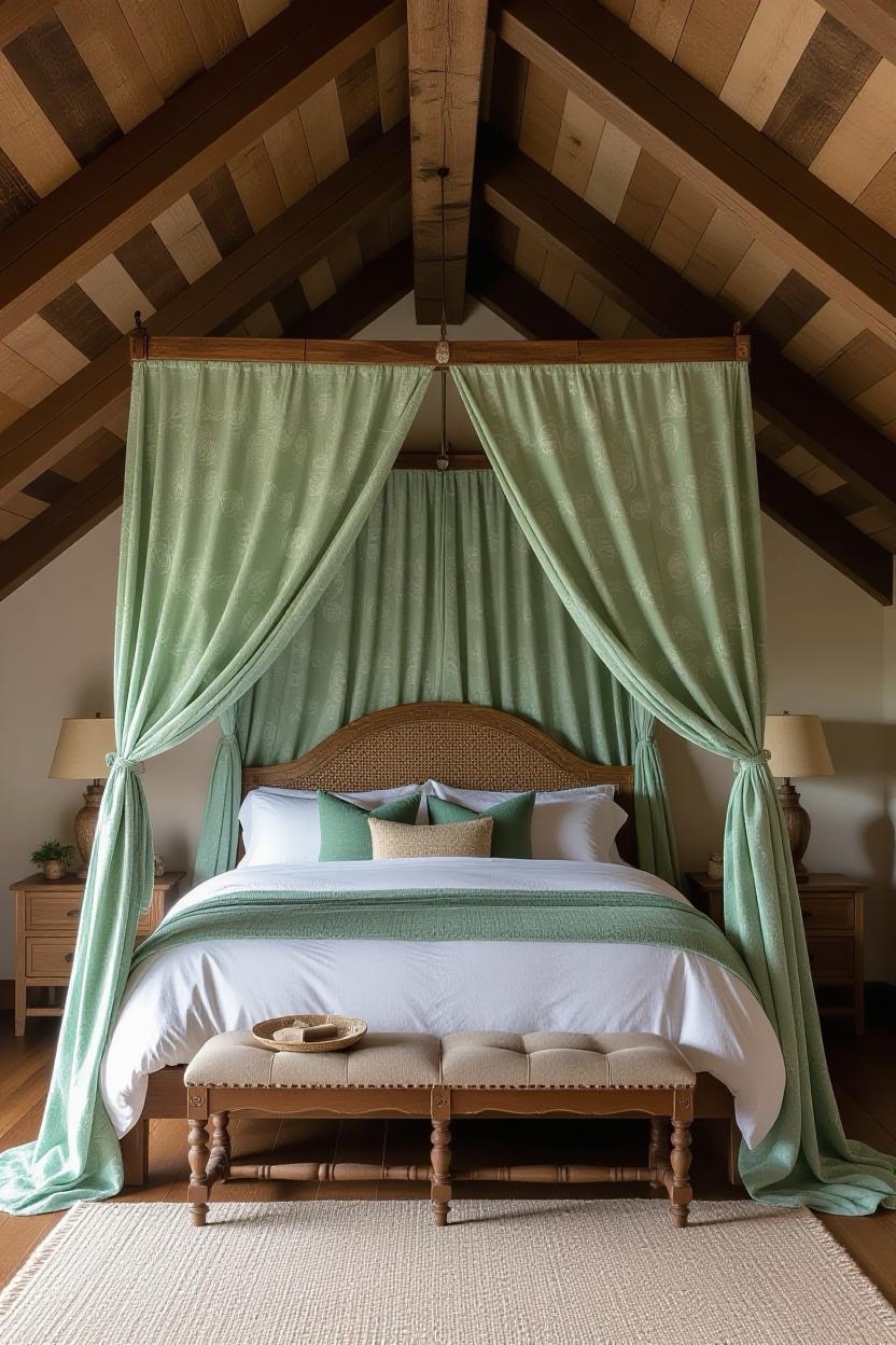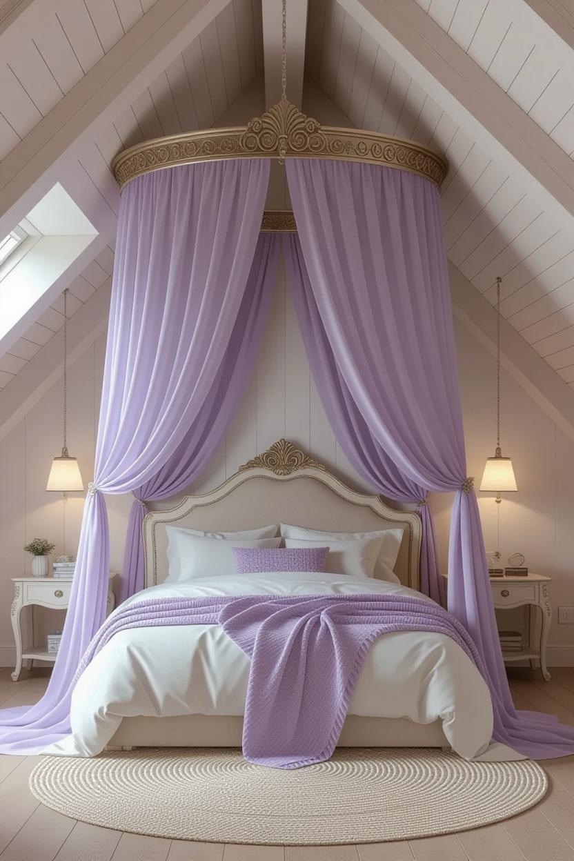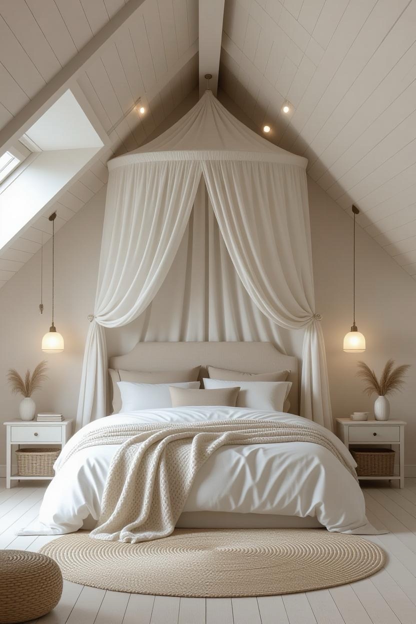 Use the sloped ceilings to your advantage by placing a canopy bed in the center of your attic. Draped fabrics and soft lighting create a dreamy, romantic feel that makes the space feel magical.