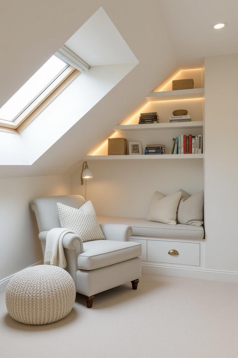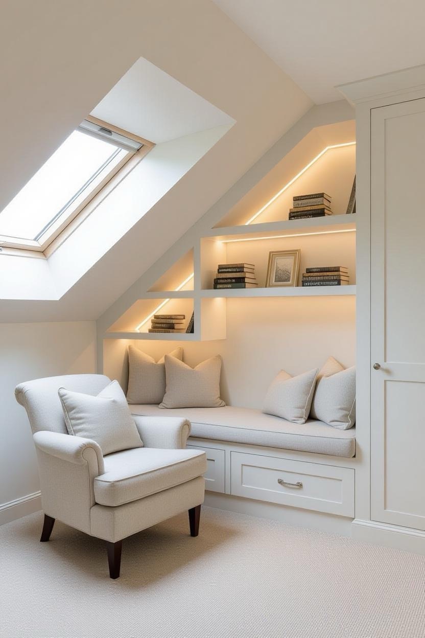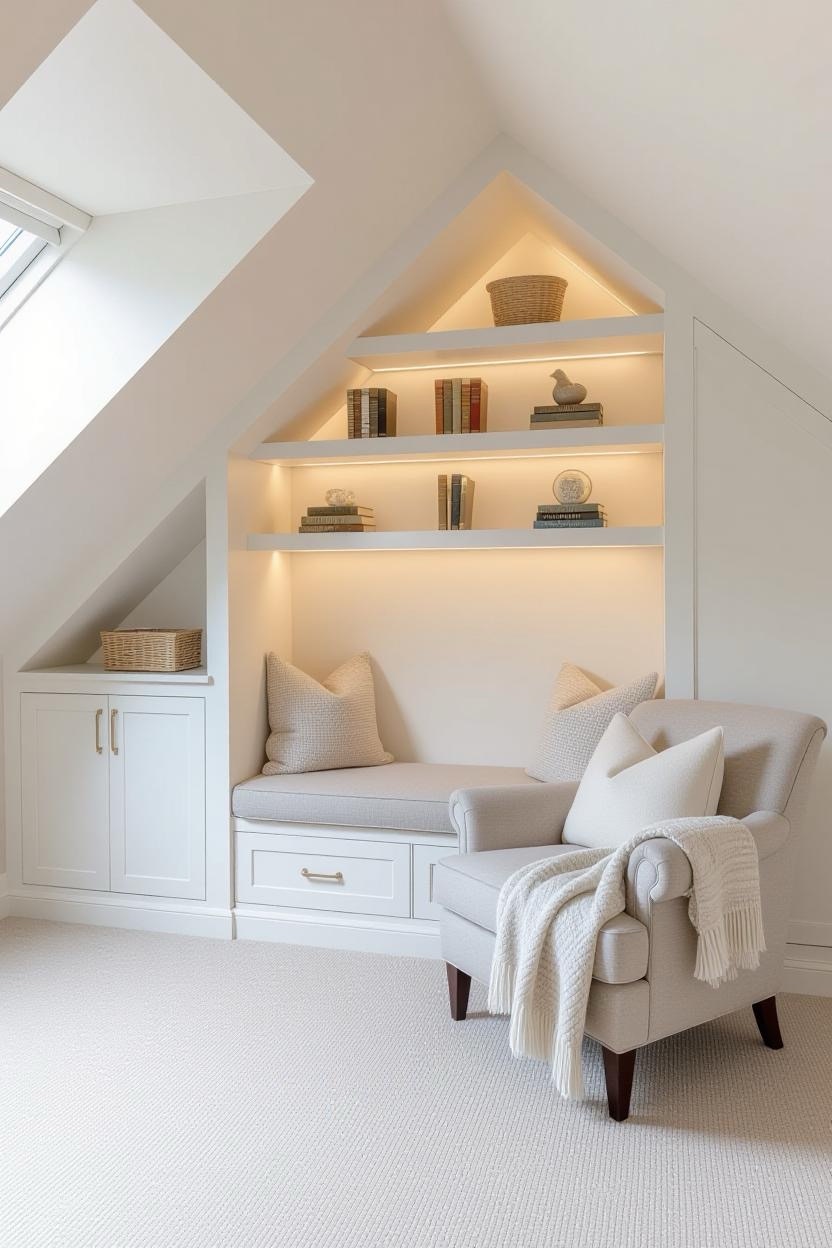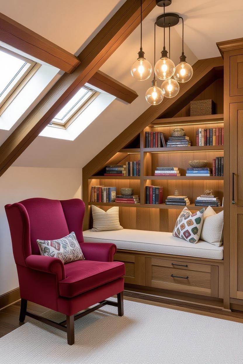 Turn a corner of your attic into a reading nook with built-in shelves, a plush chair, and soft lighting. It makes your attic bedroom both functional and inviting, perfect for book lovers.