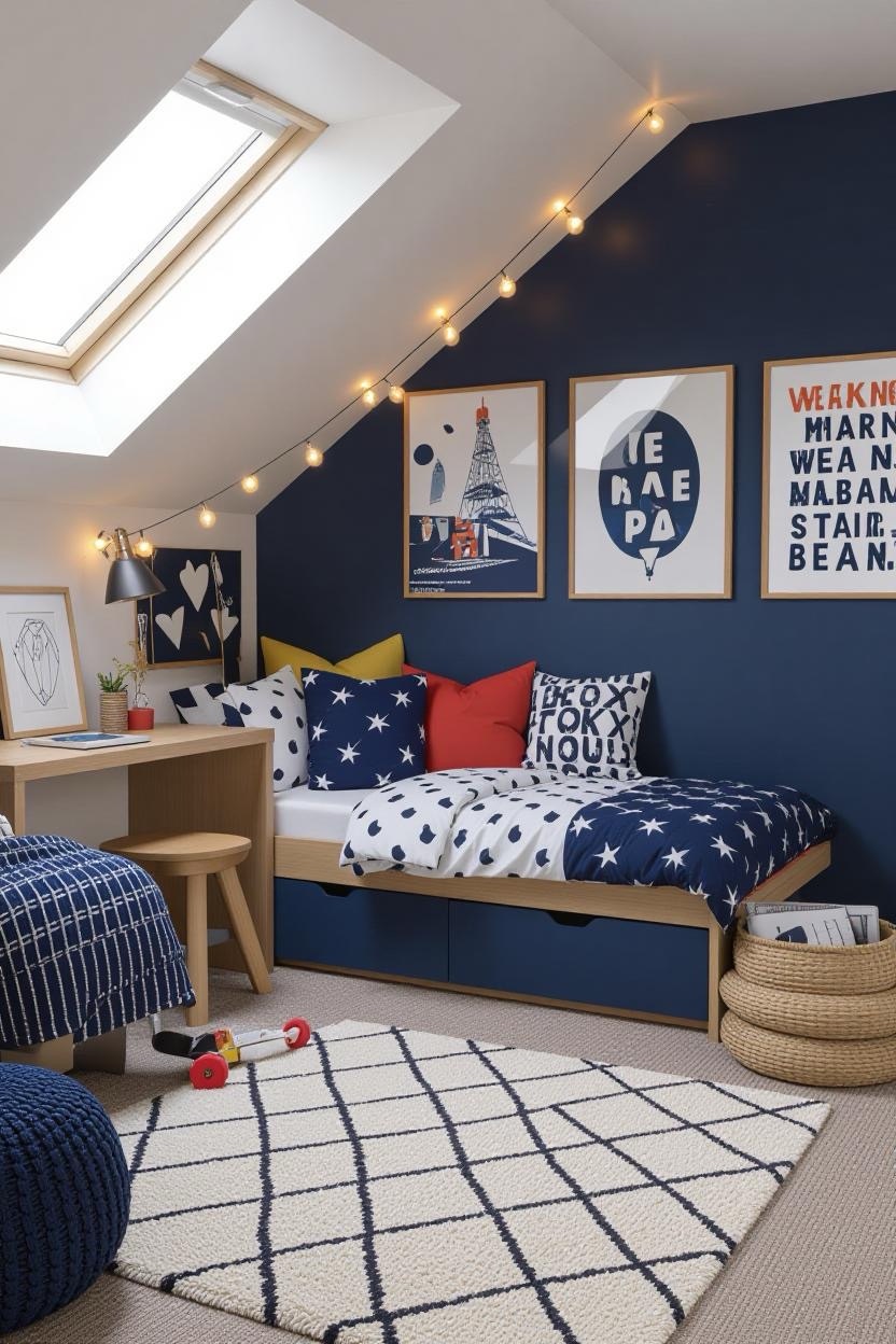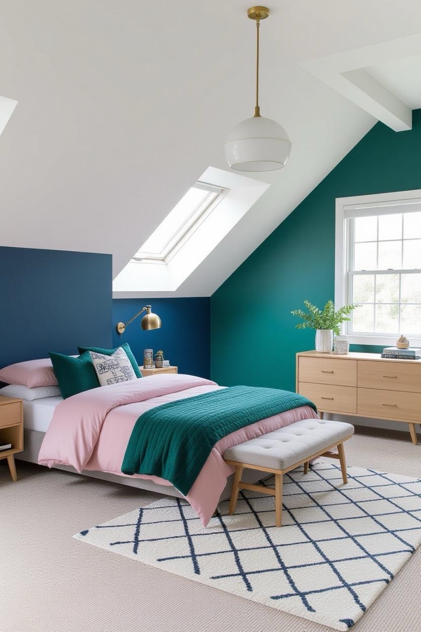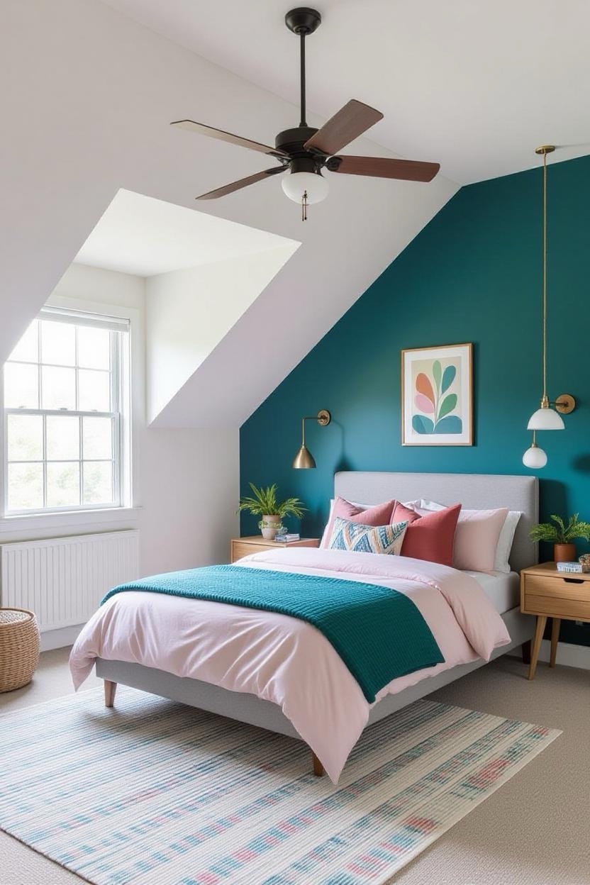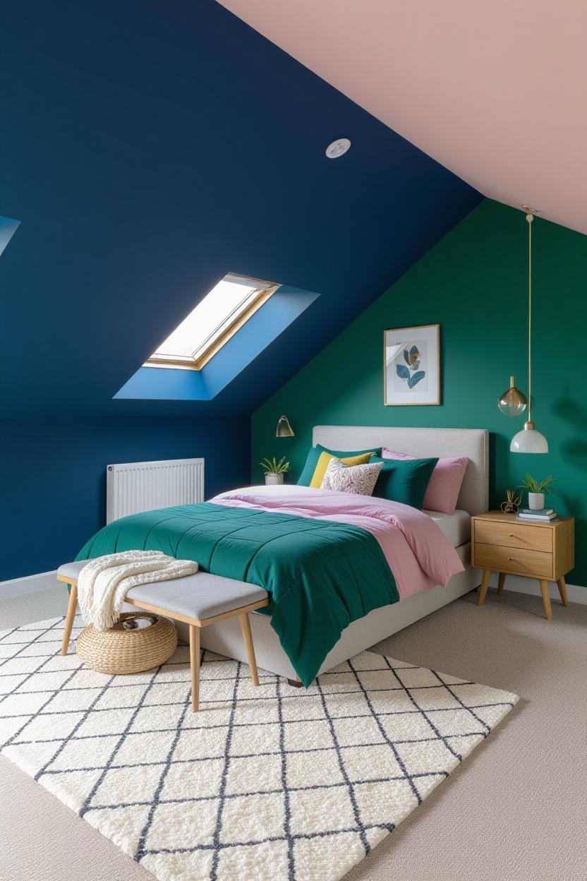Don’t be afraid to use bold colors in an attic! A colorful accent wall, such as deep blue, emerald green, or blush pink, adds character and modern flair while keeping the rest of the room neutral.
