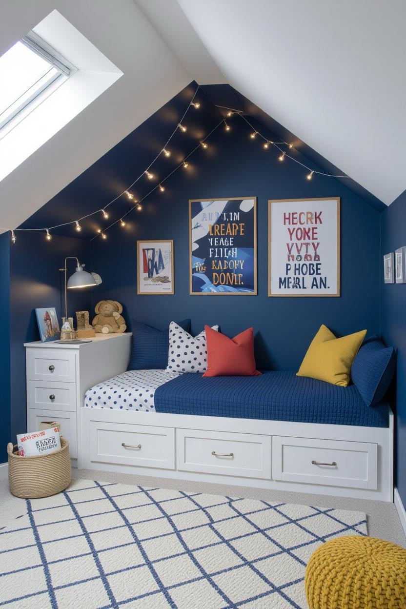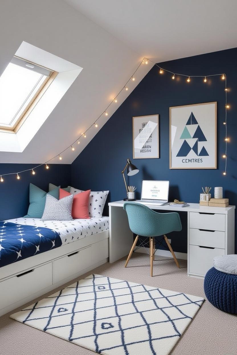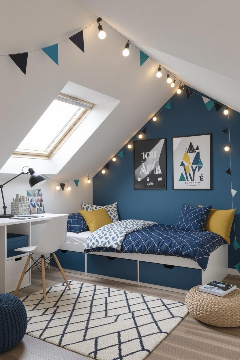 Attics make the perfect teen bedrooms. Personalize with posters, string lights, a comfy study nook, and bold colors to give it a youthful, fun vibe that reflects their personality.