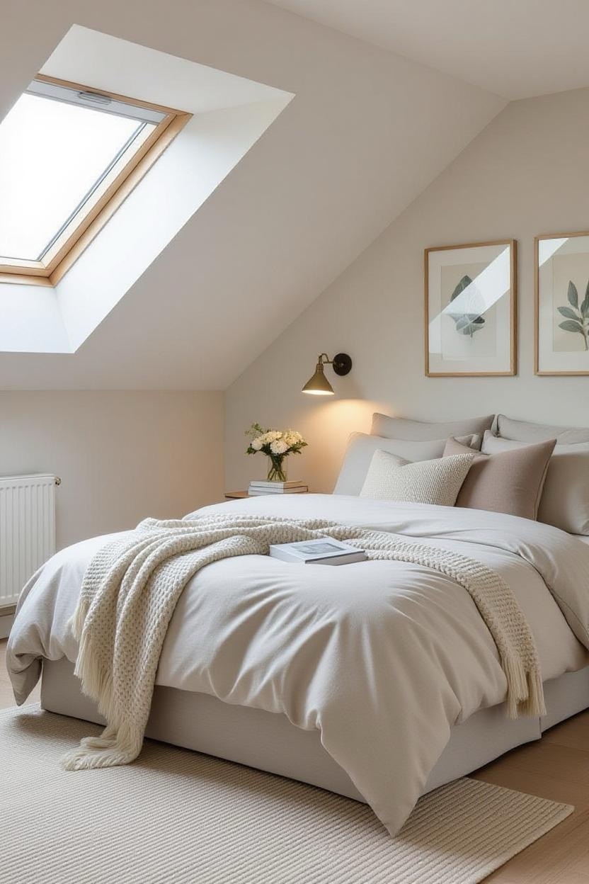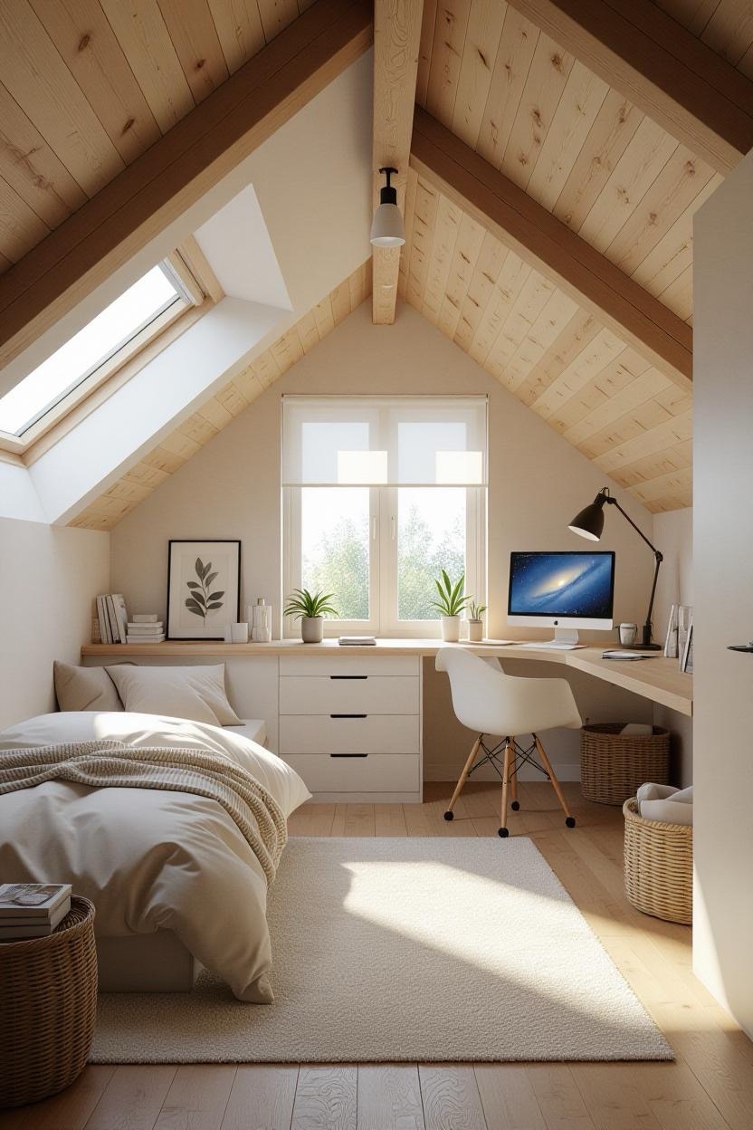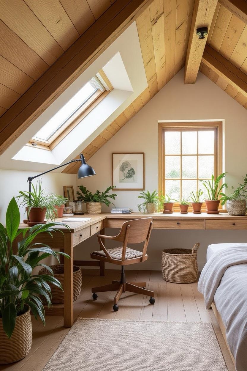 If you’re an artist or creative, combine your attic bedroom with a studio. Natural light from skylights, paired with a small workspace, makes it ideal for creativity and relaxation in one space.