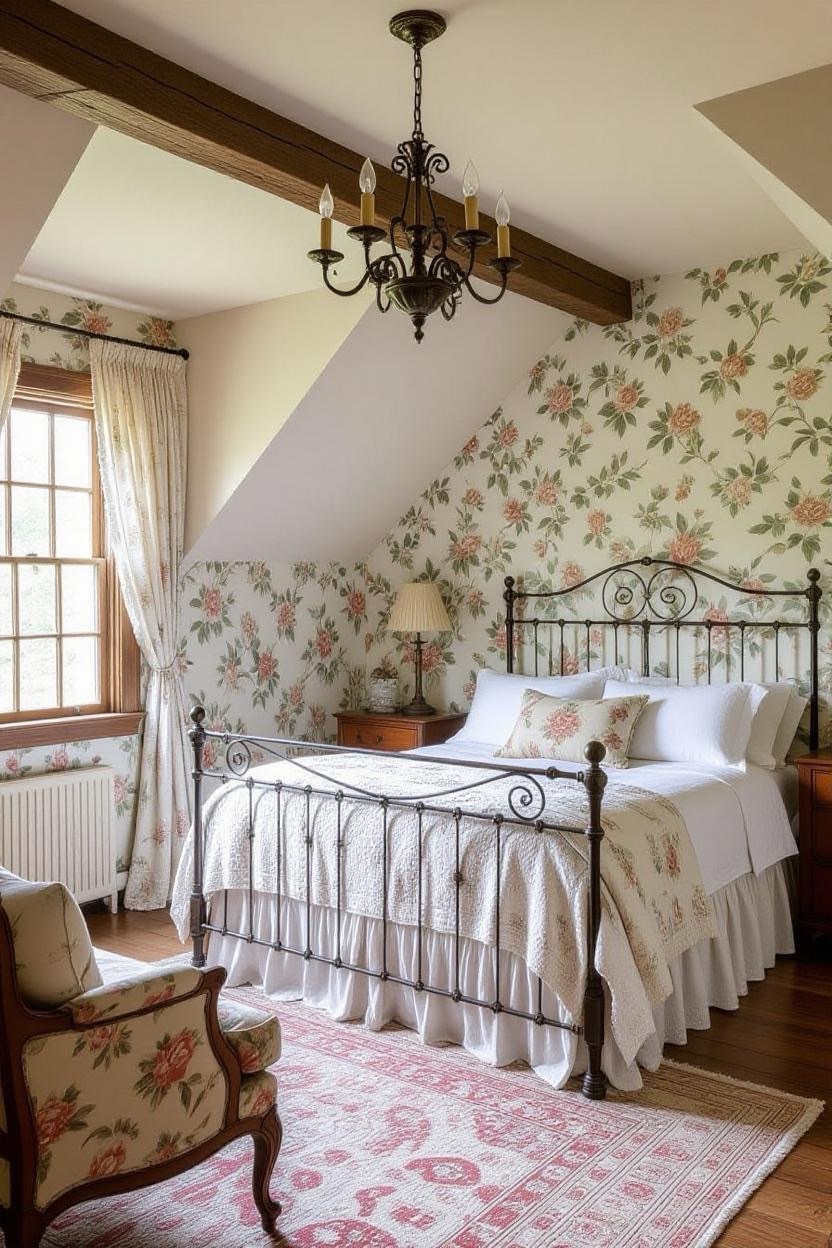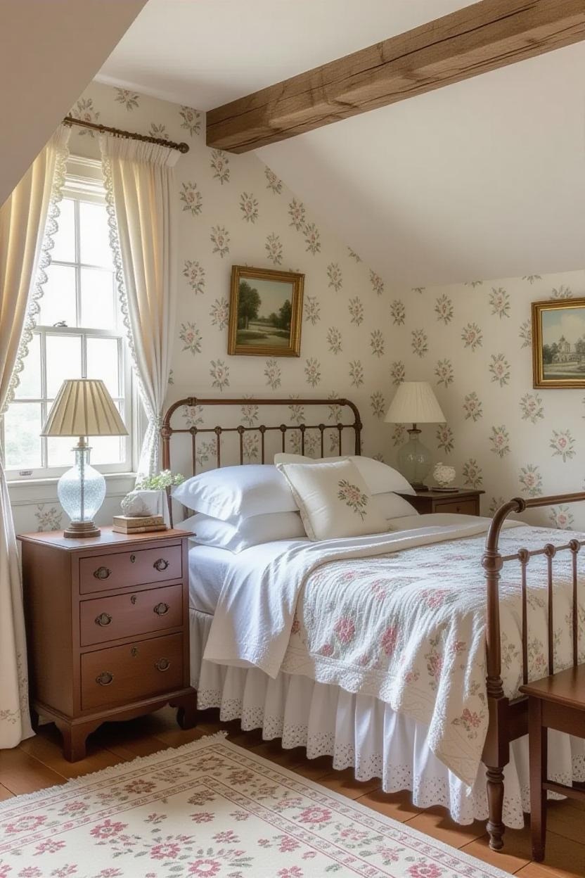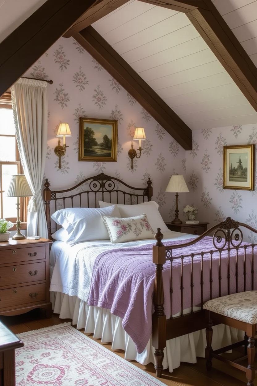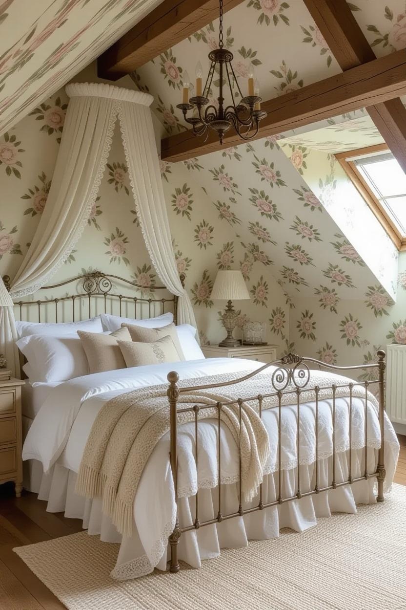 Give your attic a nostalgic look with antique furniture, floral wallpaper, and vintage lighting fixtures. A wrought-iron bedframe and lace curtains will complete the timeless, romantic atmosphere.