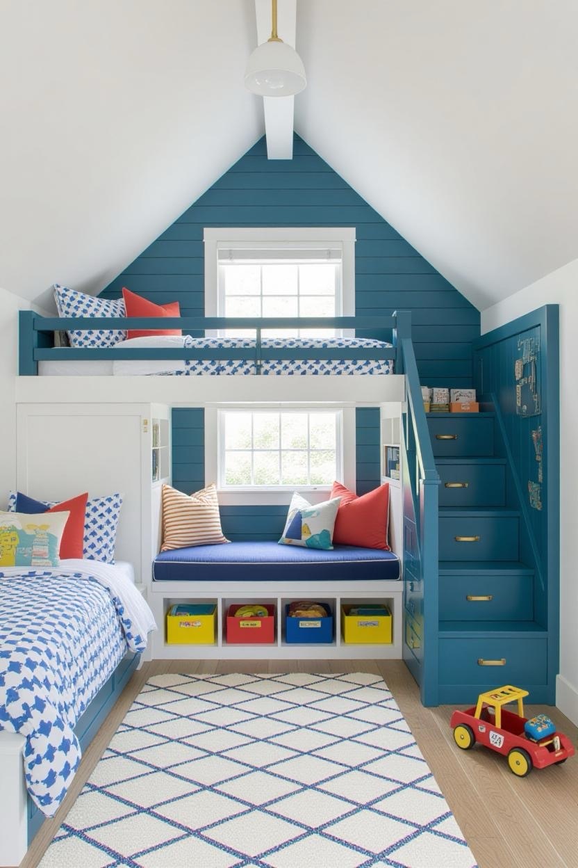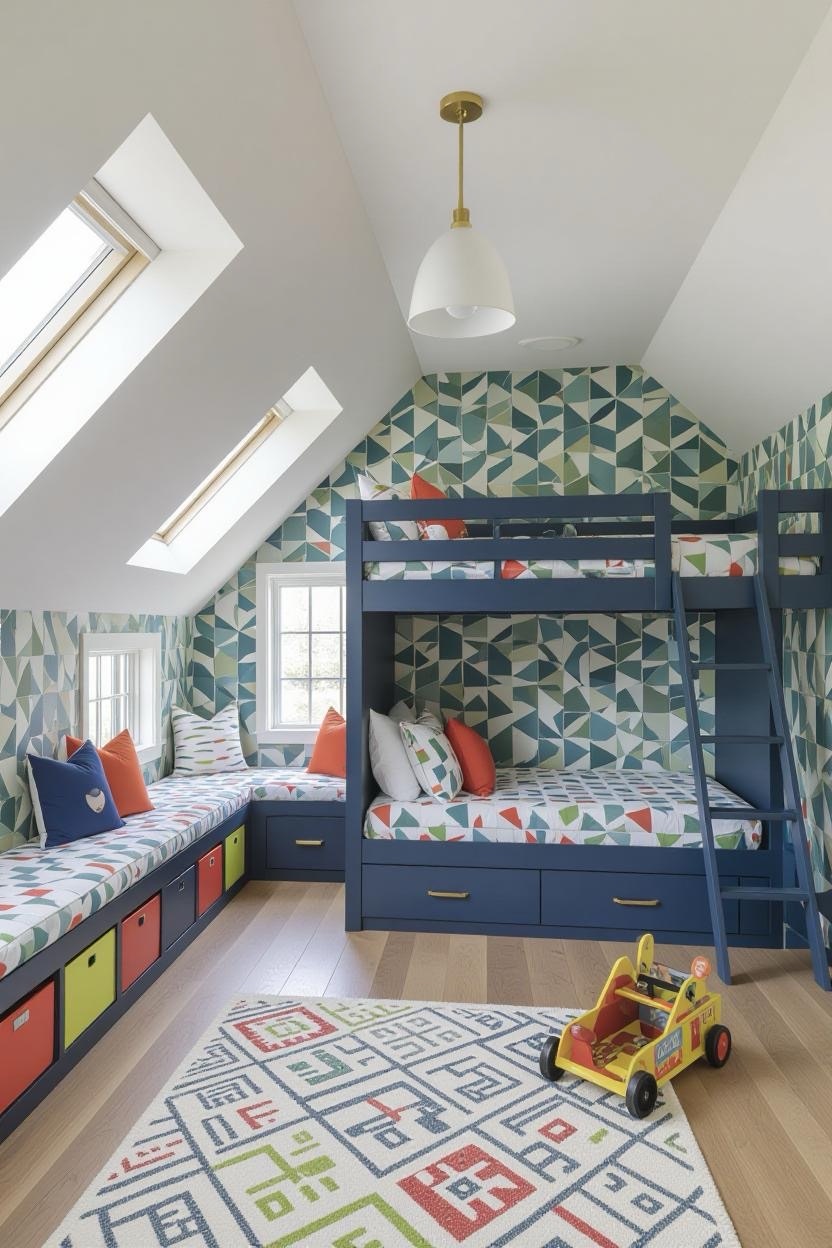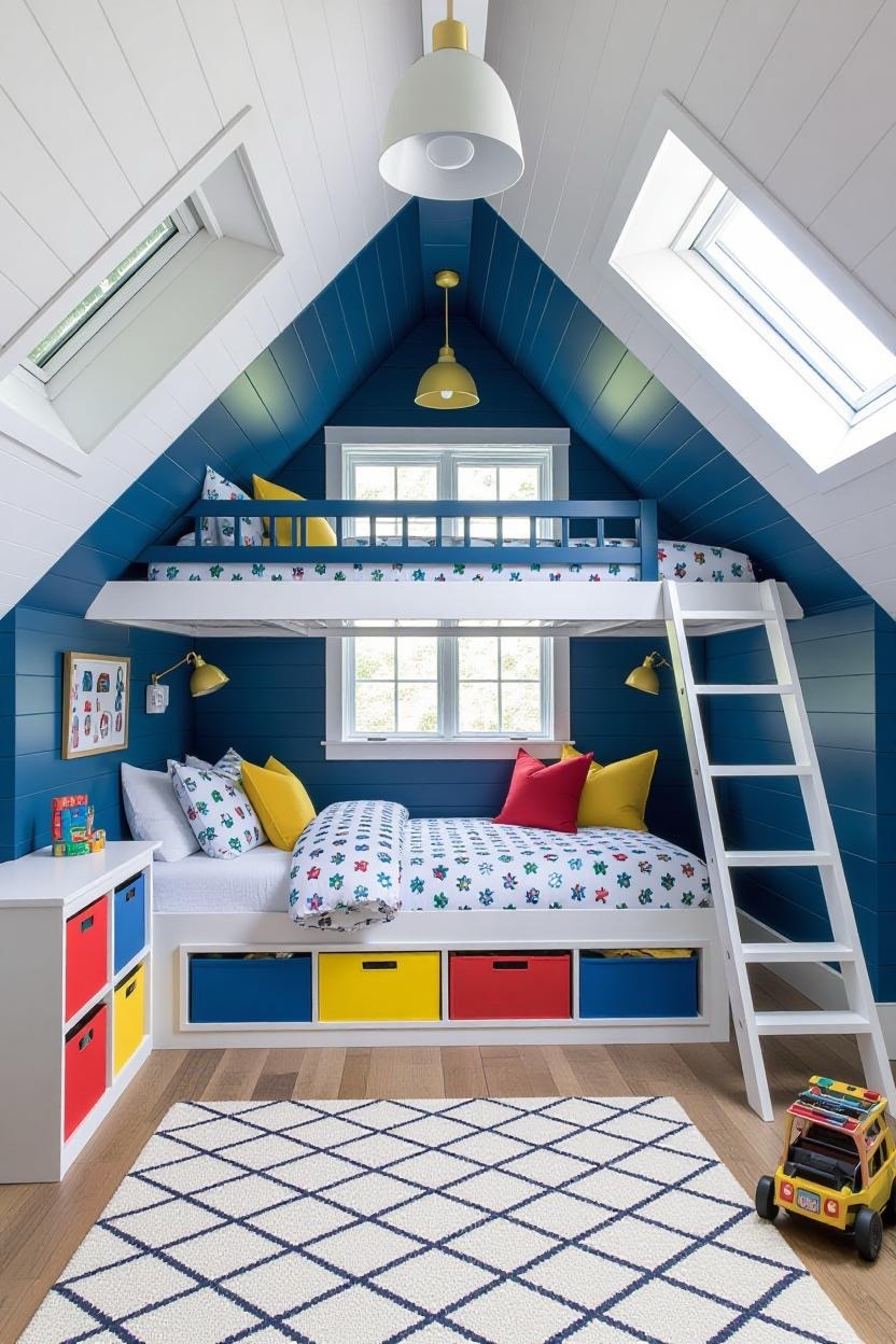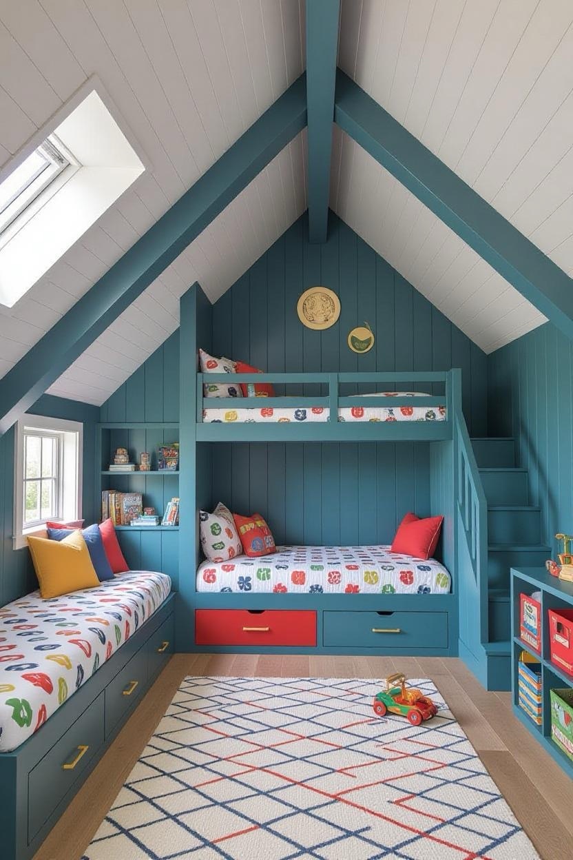 Your attic can double as a kids’ bedroom with creative bunk beds, colorful decor, and toy storage. The sloped ceilings create a playful atmosphere that feels like a secret hideout.