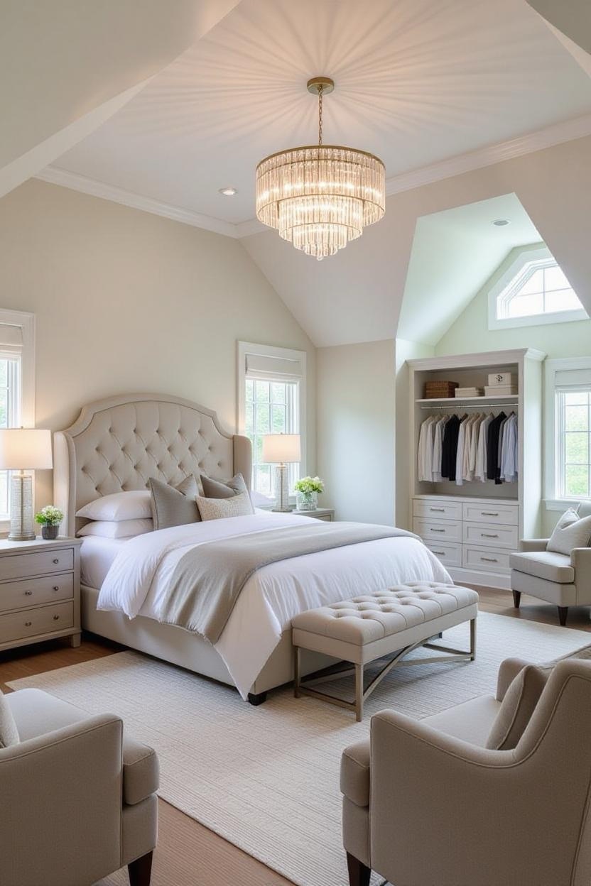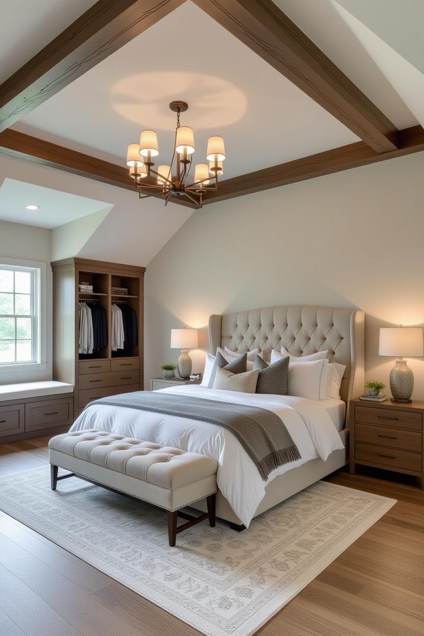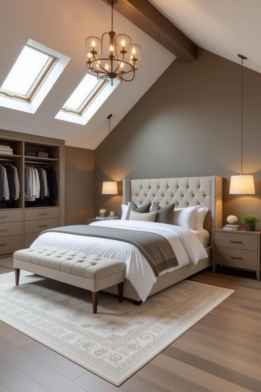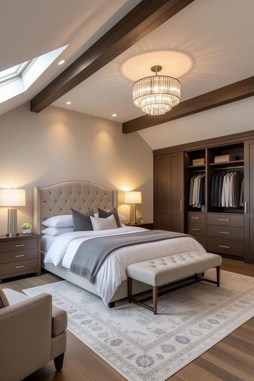 Expand your master bedroom into the attic and turn it into a luxurious suite. Think large bed, soft upholstered headboard, walk-in closet, and statement lighting that makes the space feel grand yet cozy.
