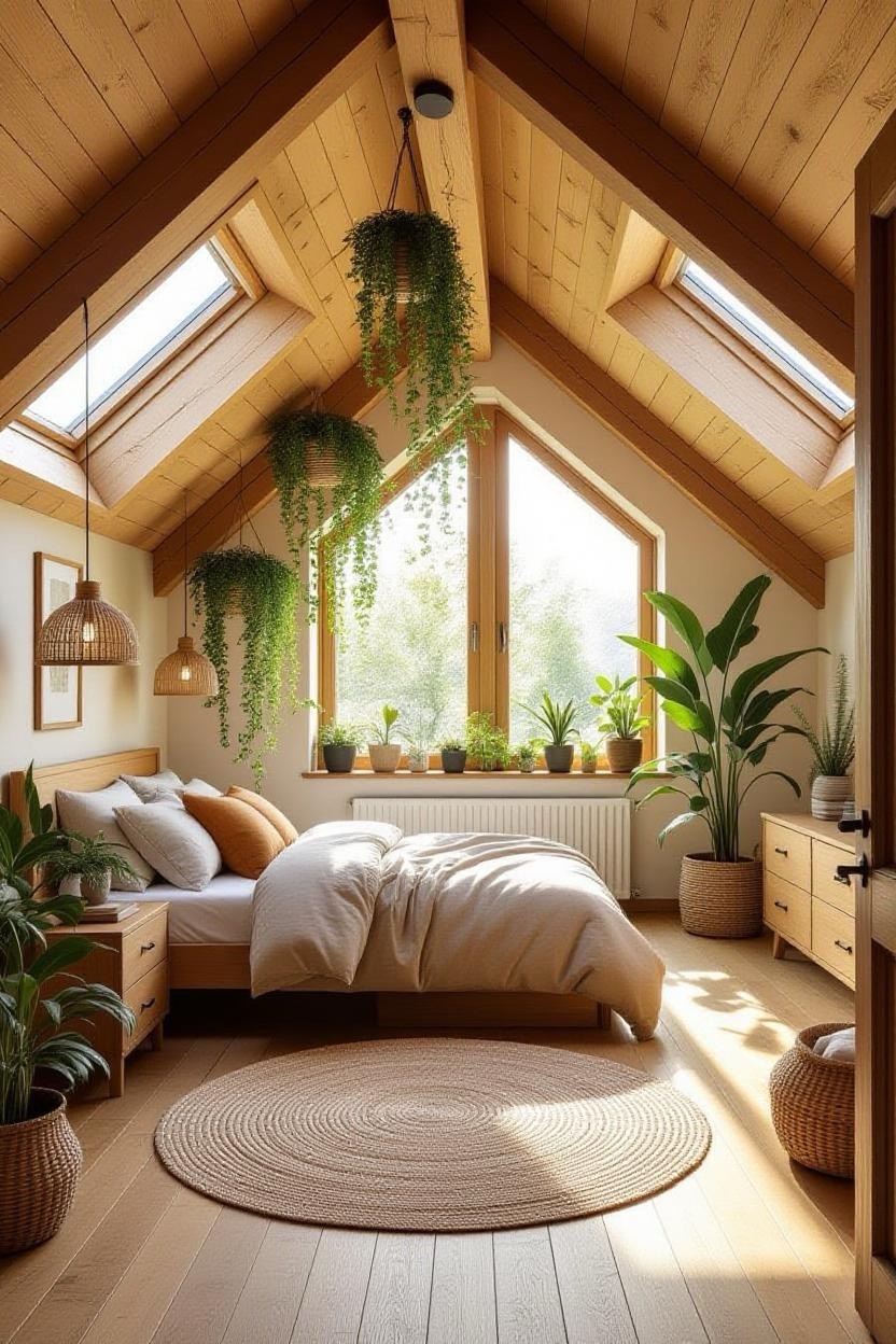 Bring the outdoors in by decorating with earthy tones, wooden furniture, and plenty of greenery. Skylights allow natural light to pour in, making the space bright and uplifting.
