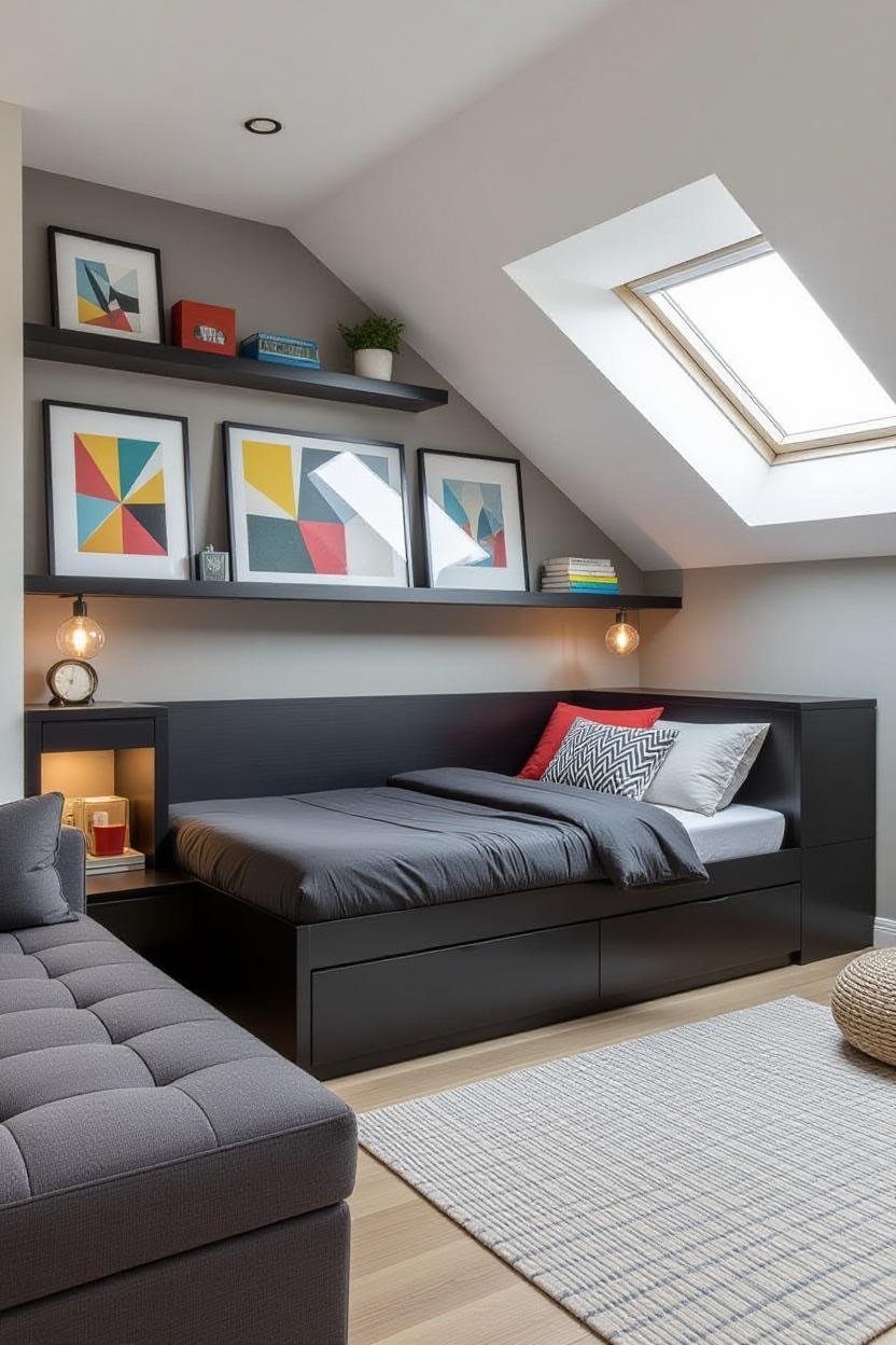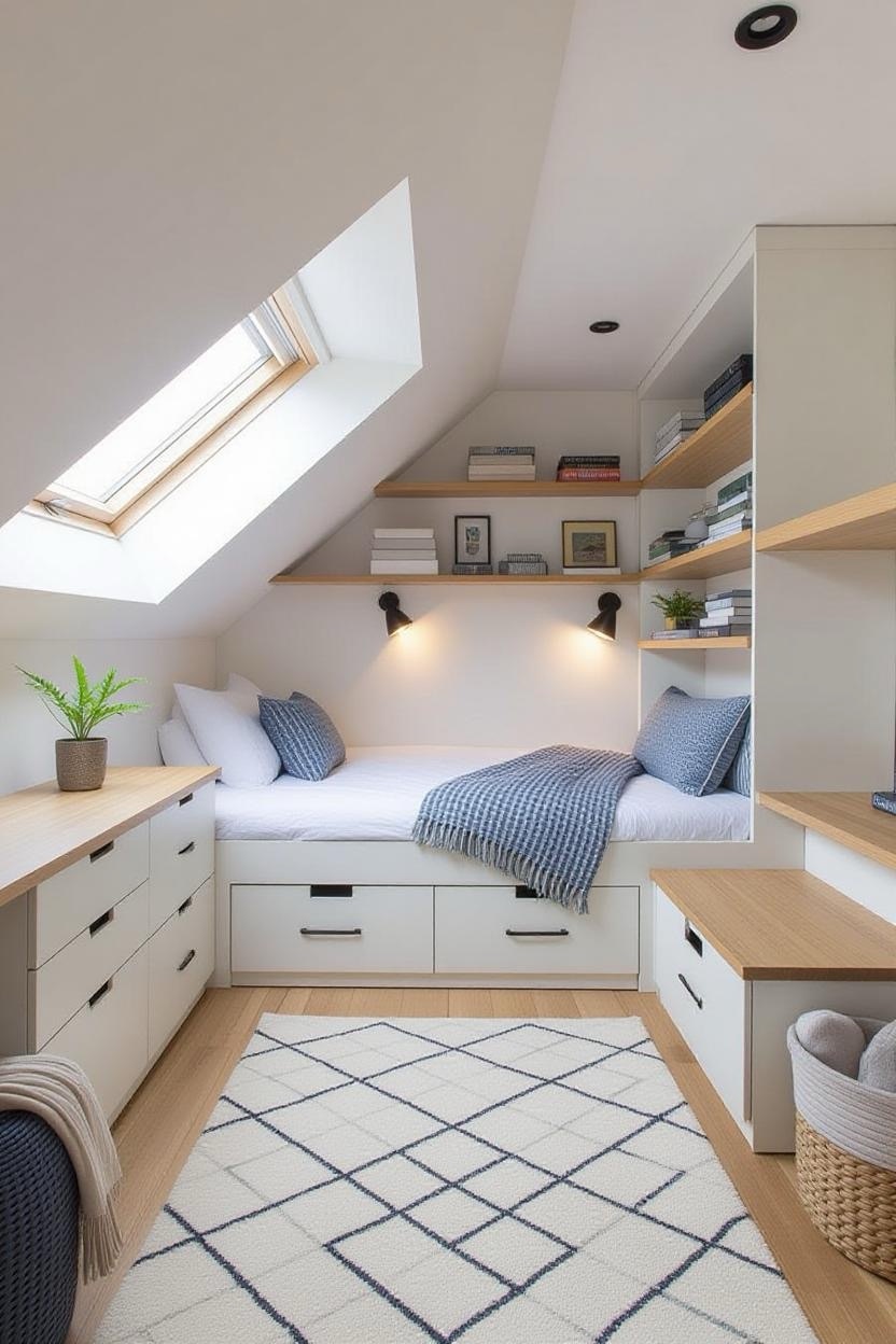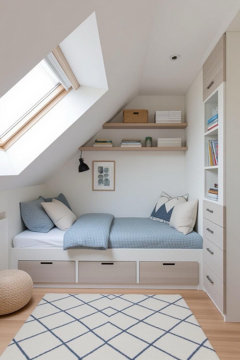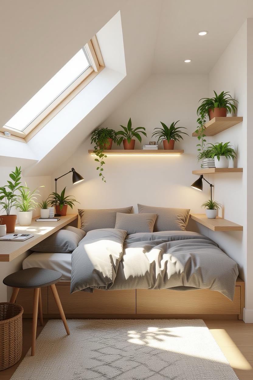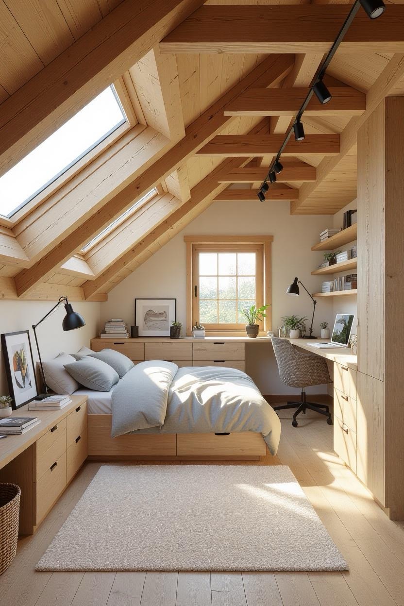Even small attics can shine with the right design. Opt for a compact bed, wall-mounted shelves, and multifunctional furniture to maximize the space while keeping it stylish.