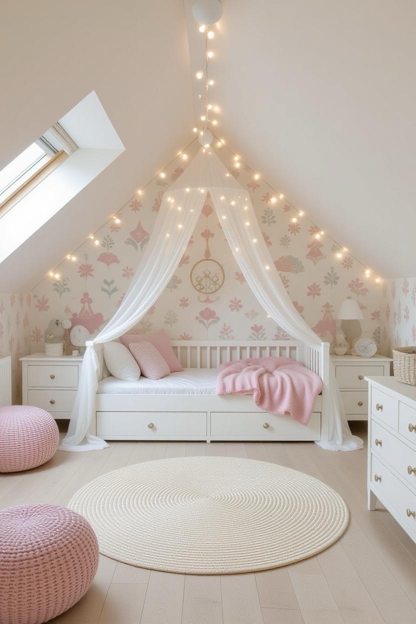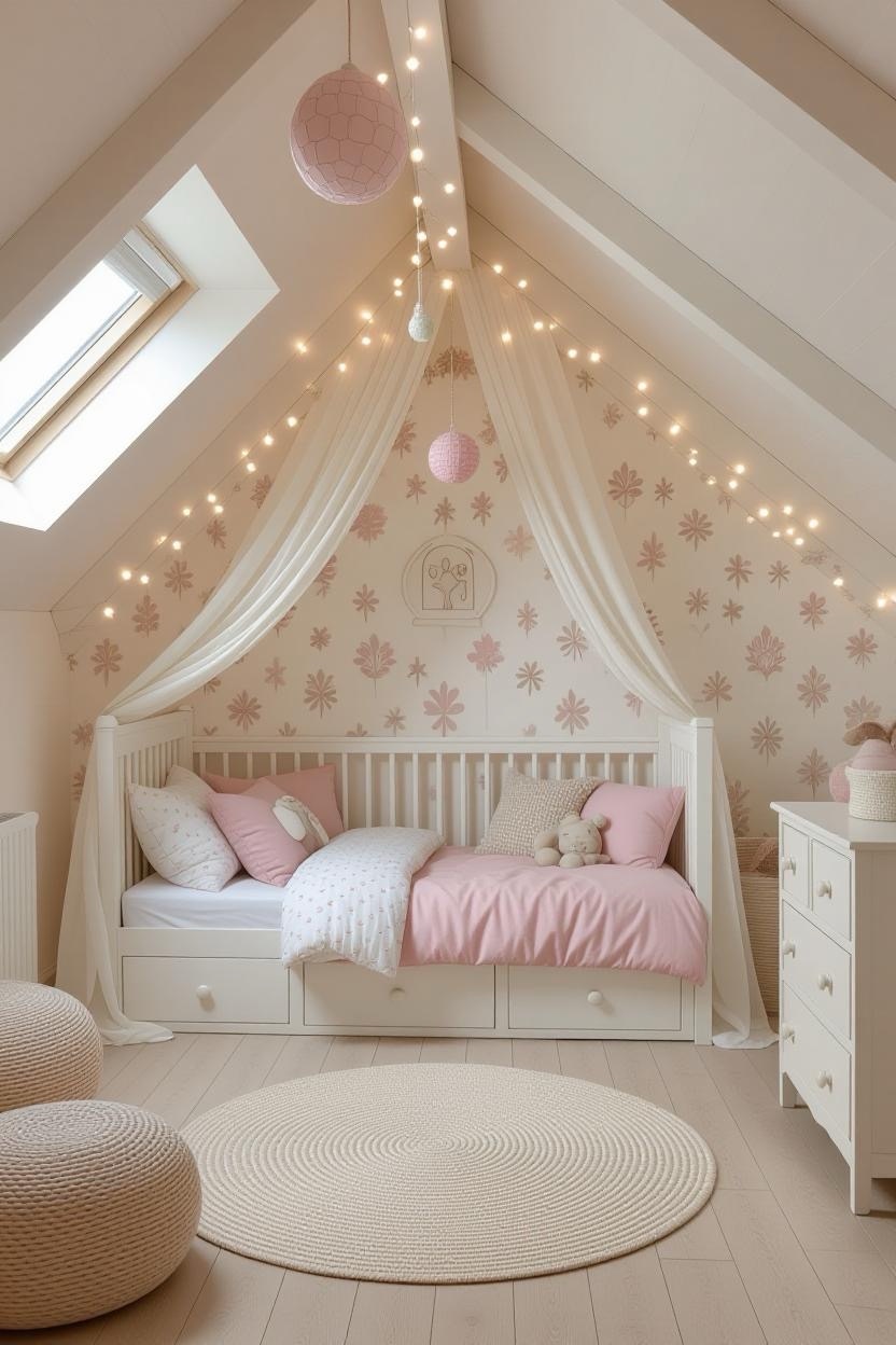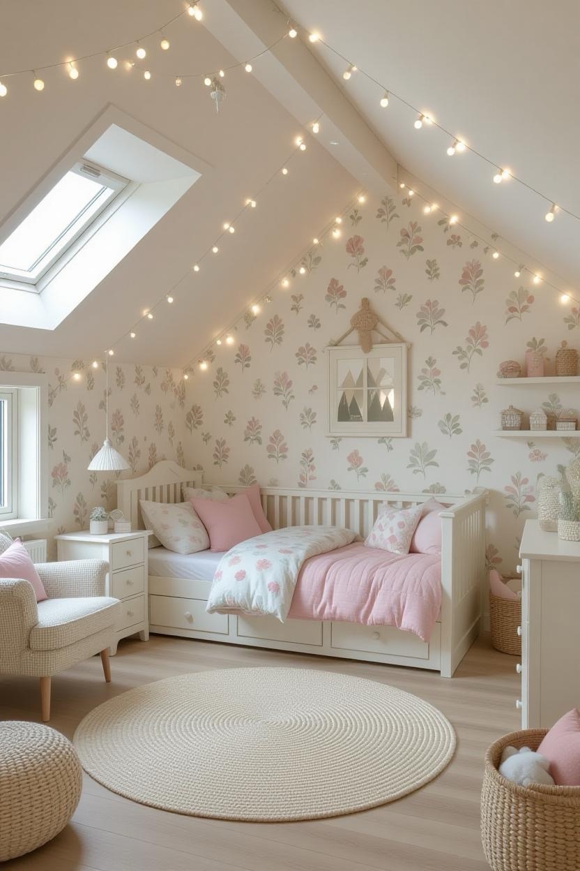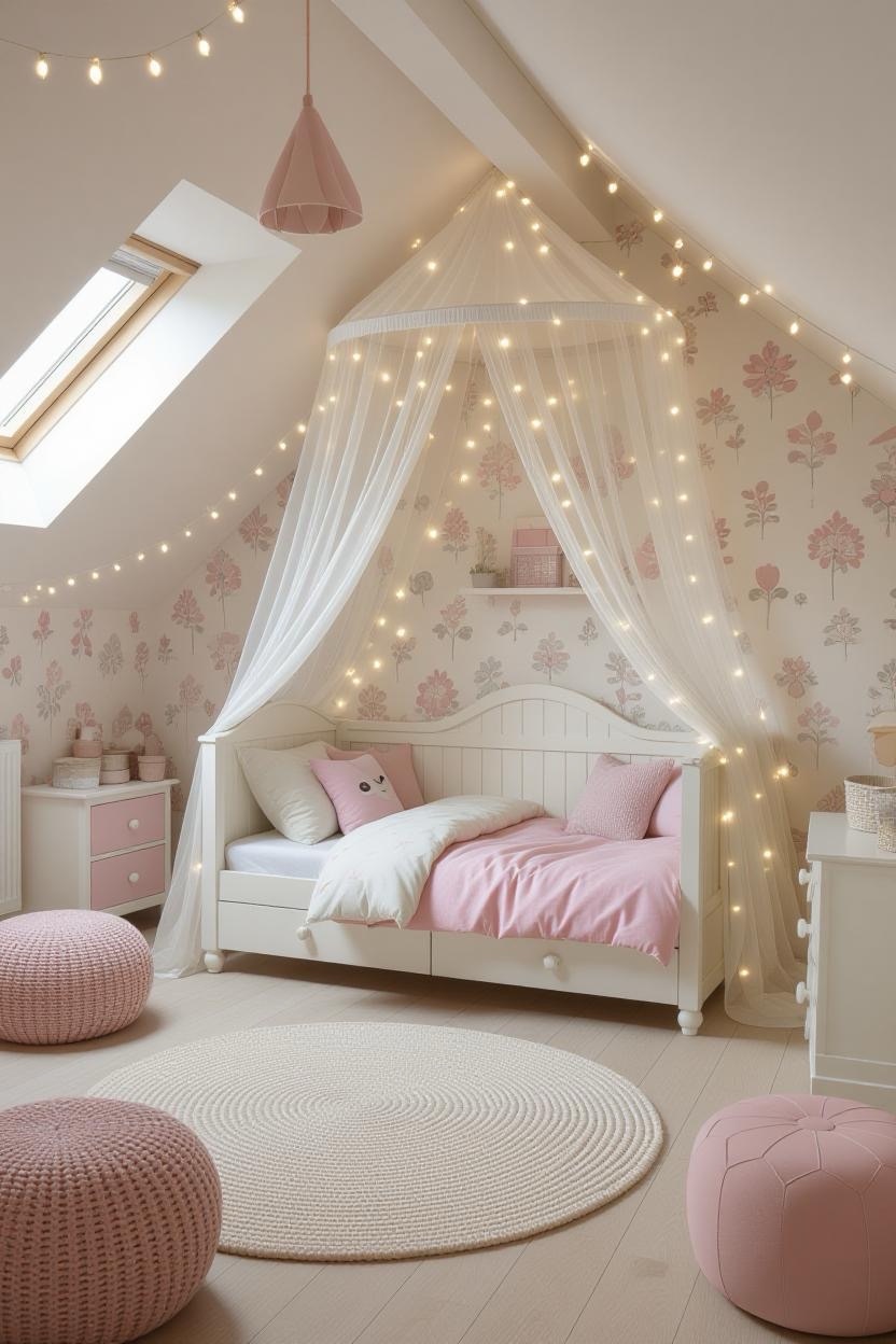 Perfect for kids or dreamers, a fairy-tale attic bedroom with twinkle lights, whimsical wallpaper, and playful furniture brings magic into the space. Think pastel hues and charming details to spark imagination.