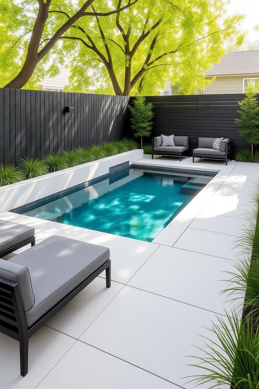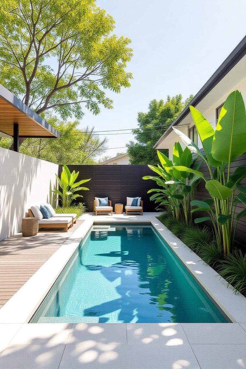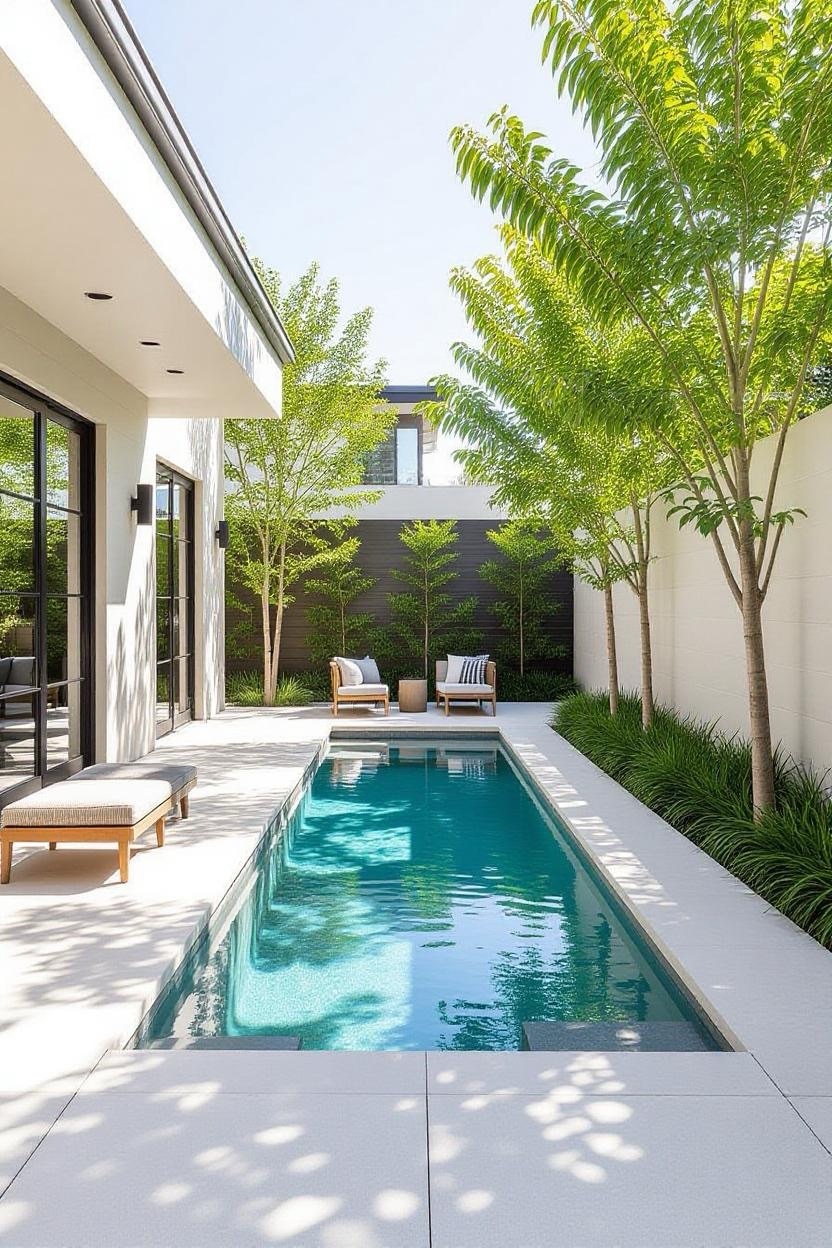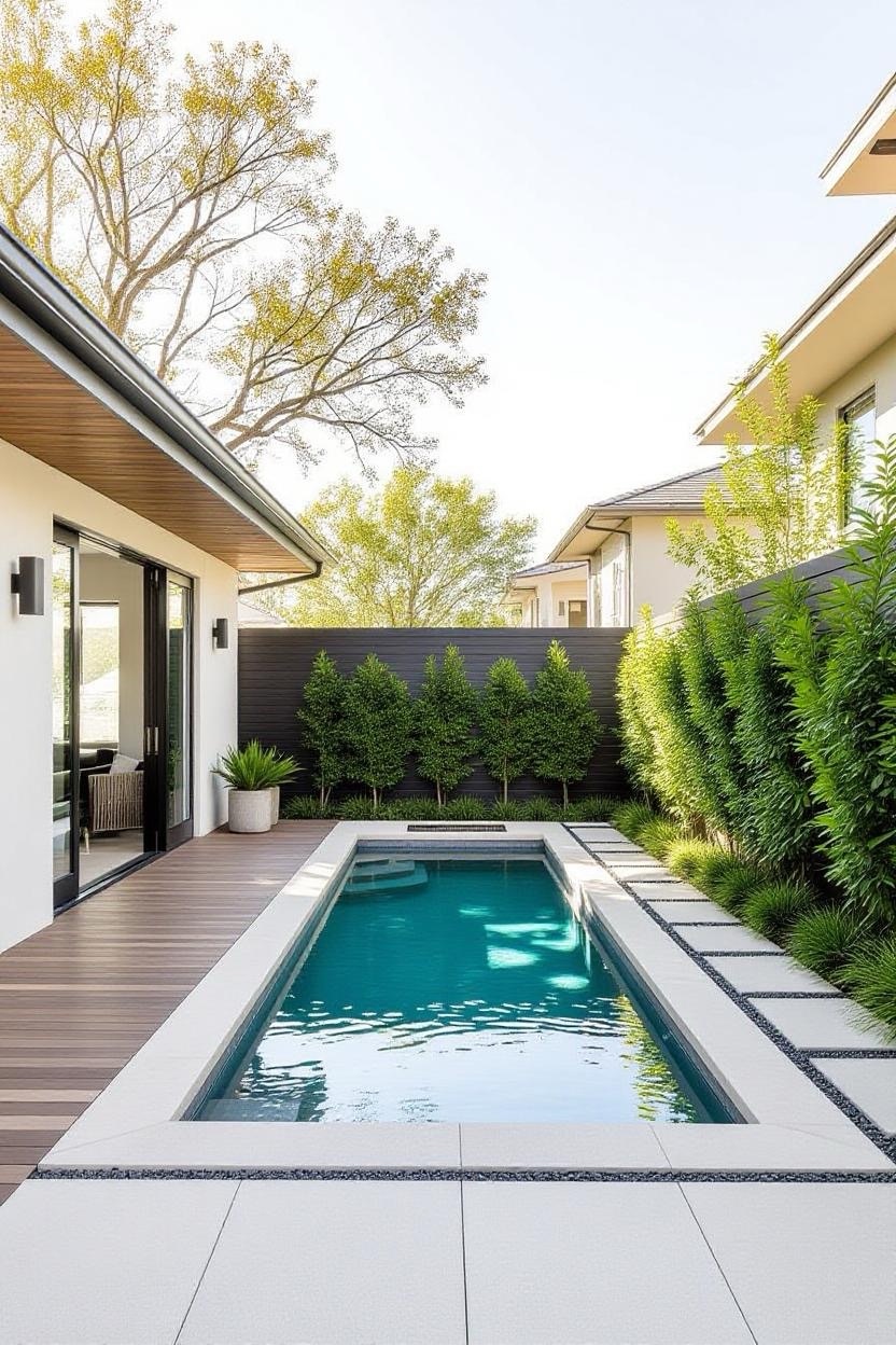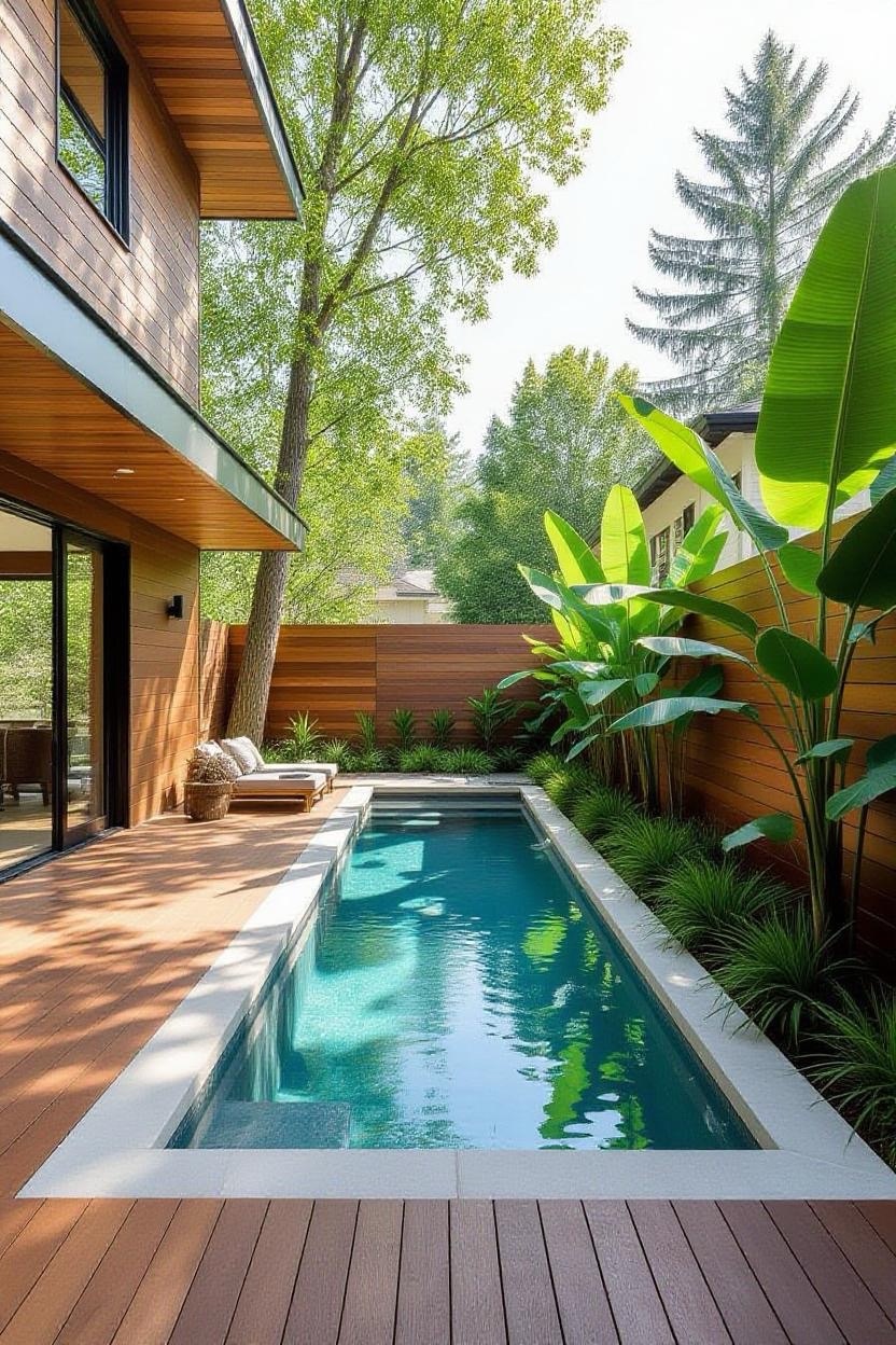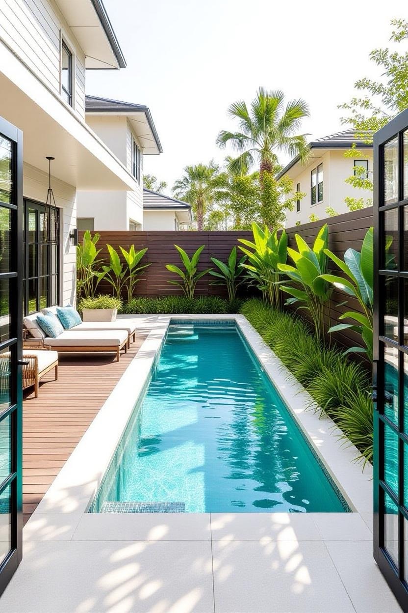 A slim rectangular pool is the perfect choice for narrow backyards. Its clean lines give a modern vibe while fitting seamlessly into tight spaces. Add simple decking around the pool, and you’ve got a sleek retreat that doesn’t overwhelm the yard.