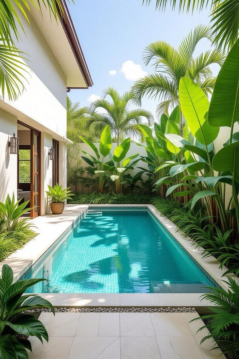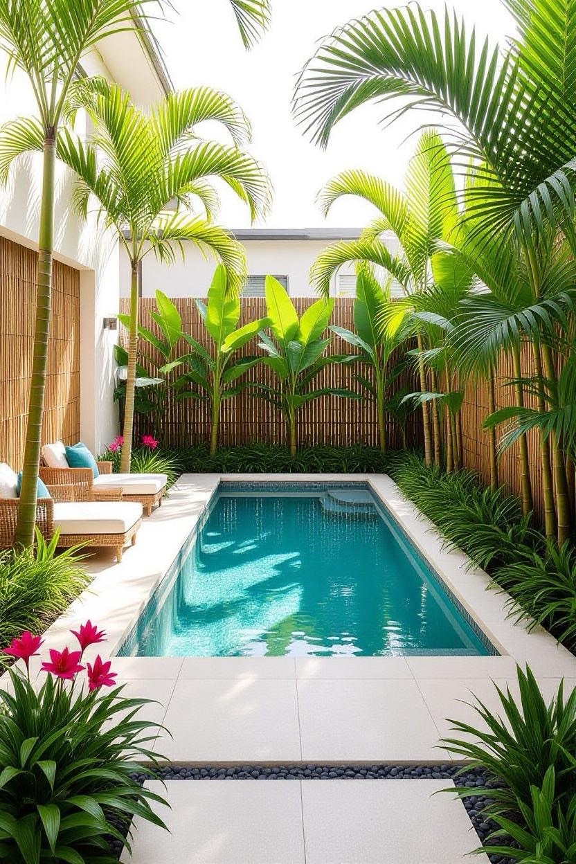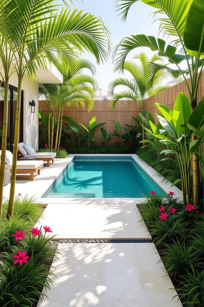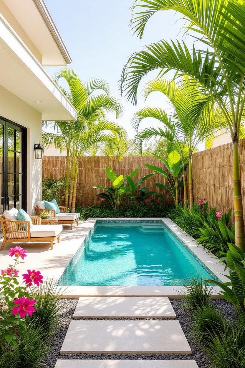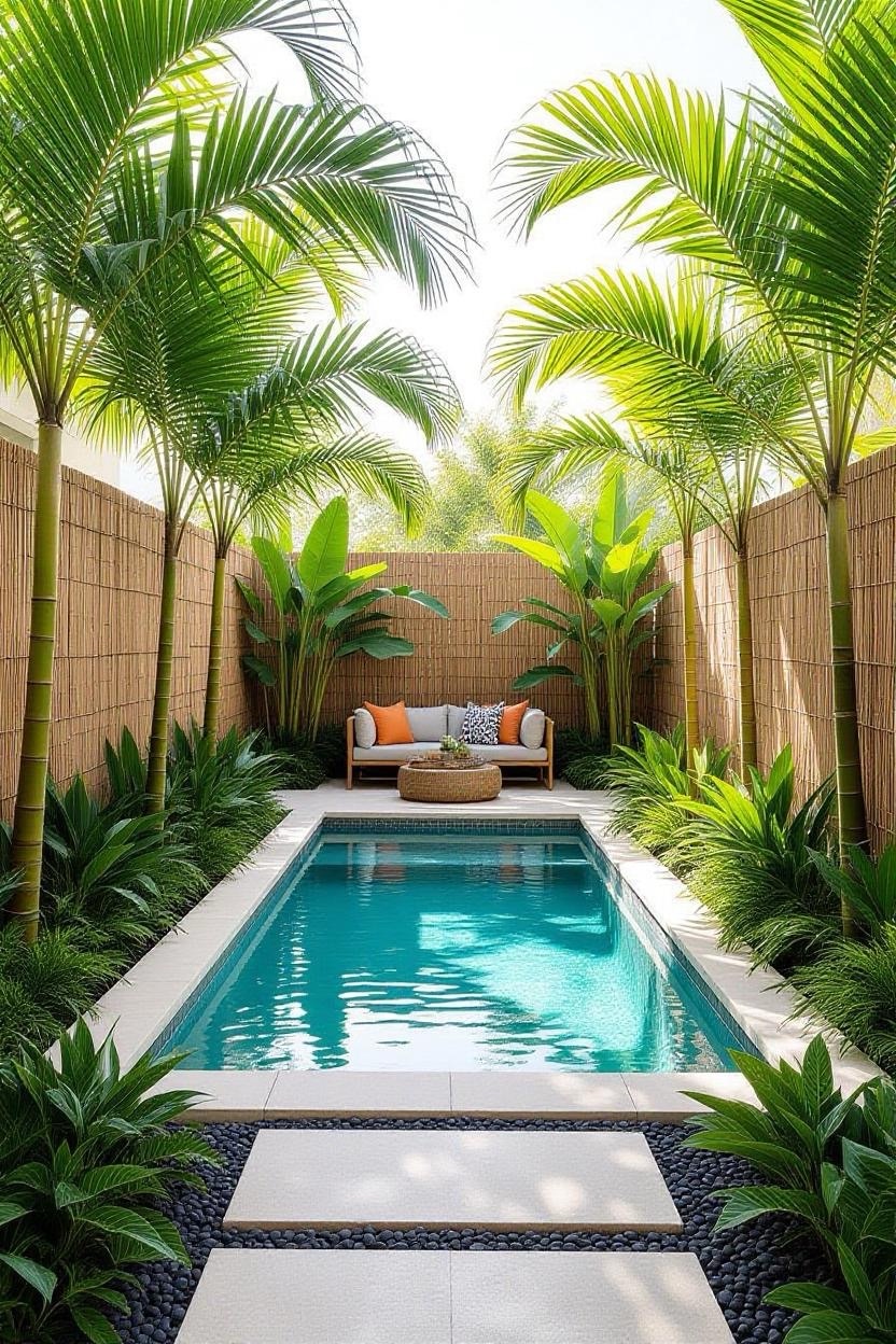 Surround your pool with palm plants, bamboo fencing, and tropical flowers. Even in a tiny space, this creates a resort-style vibe right at home.