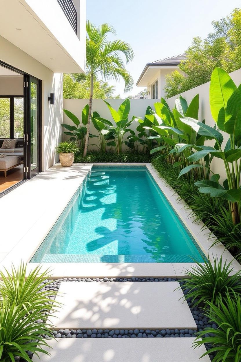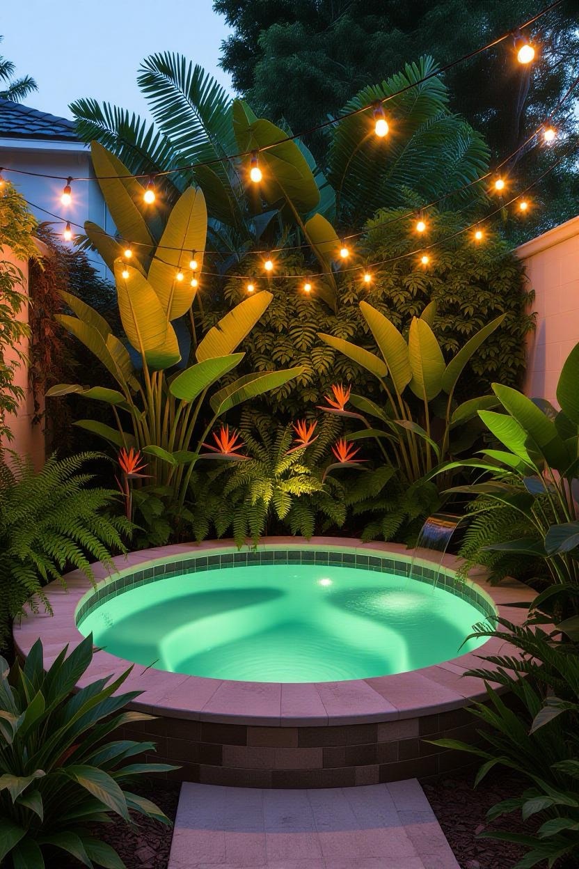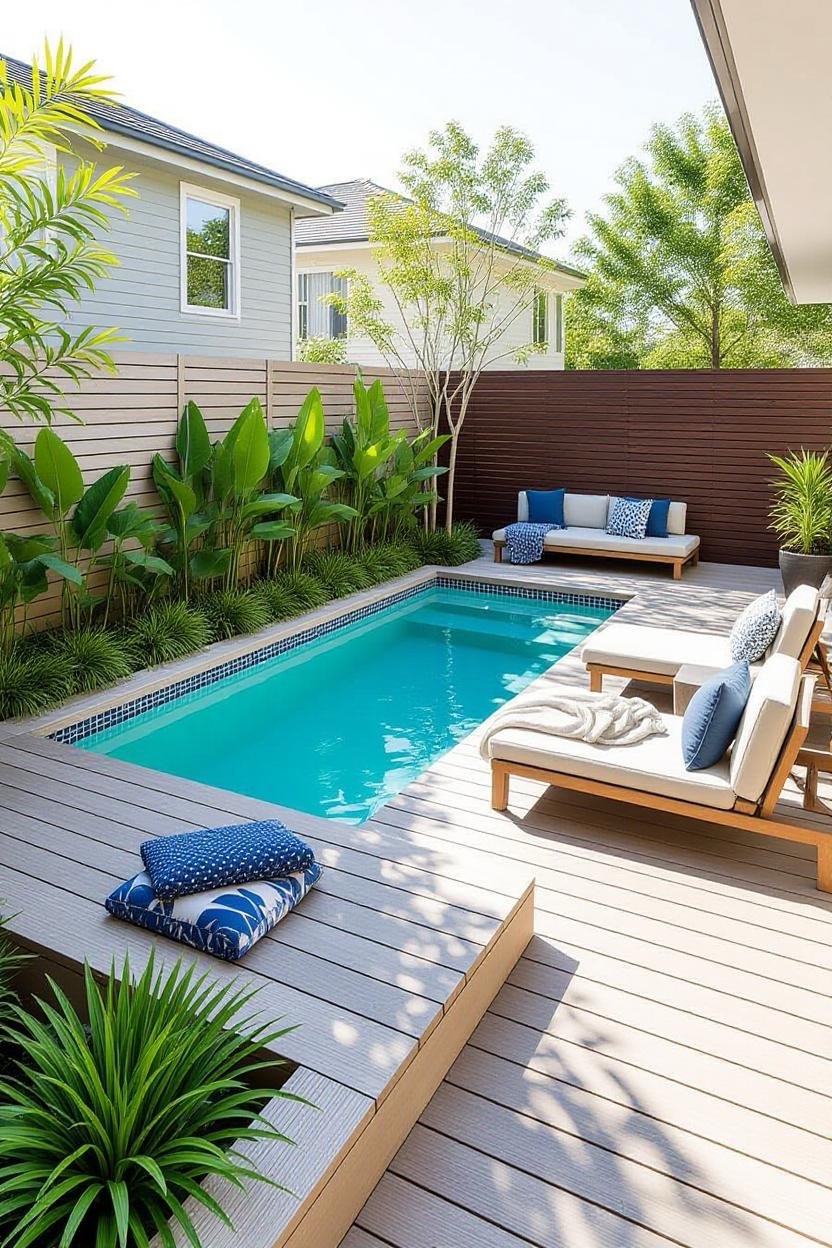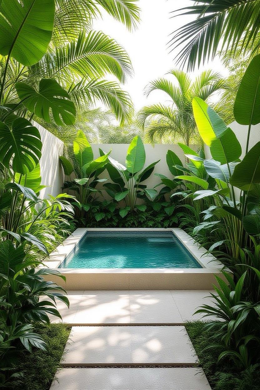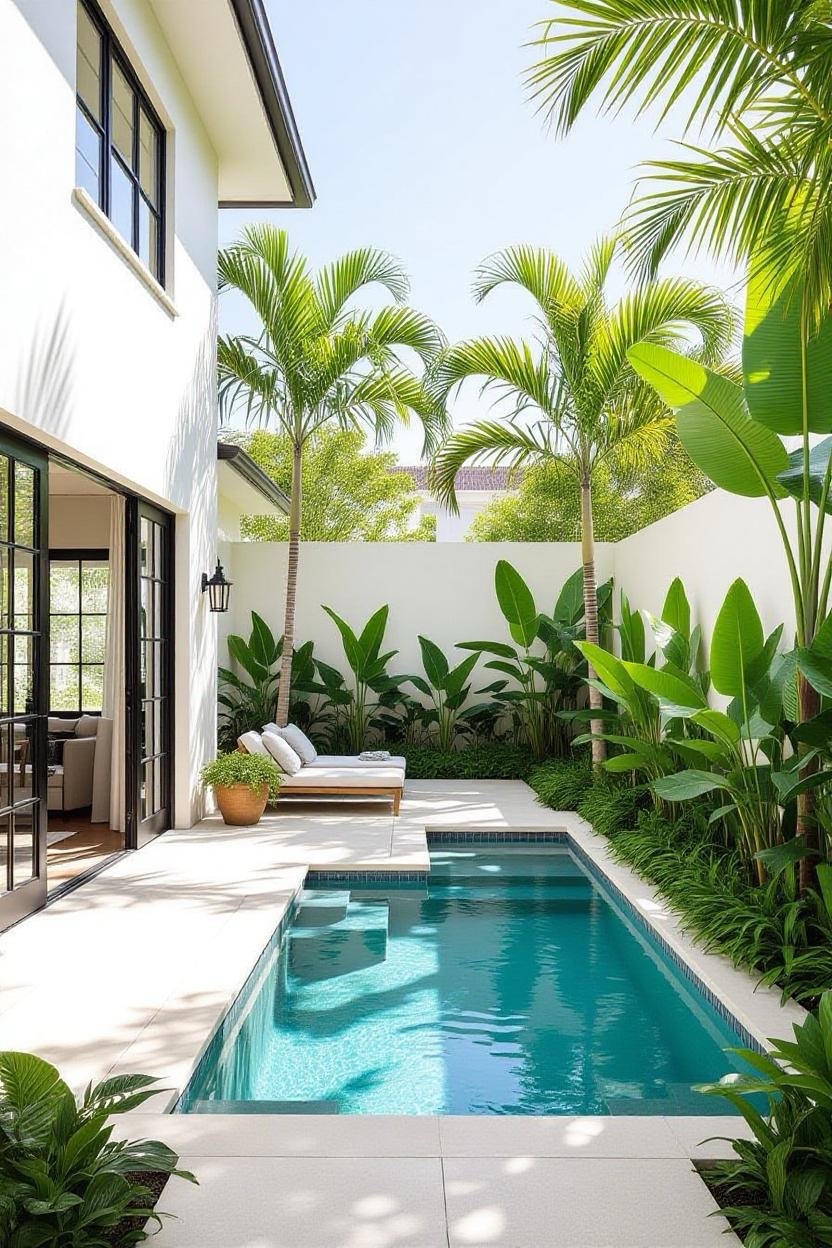 Surround your pool with palm plants, bamboo fencing, and tropical flowers. Even in a tiny space, this creates a resort-style vibe right at home.