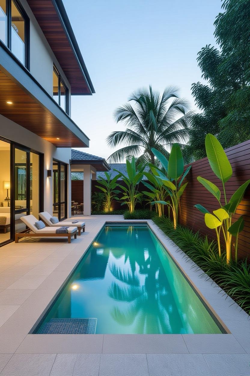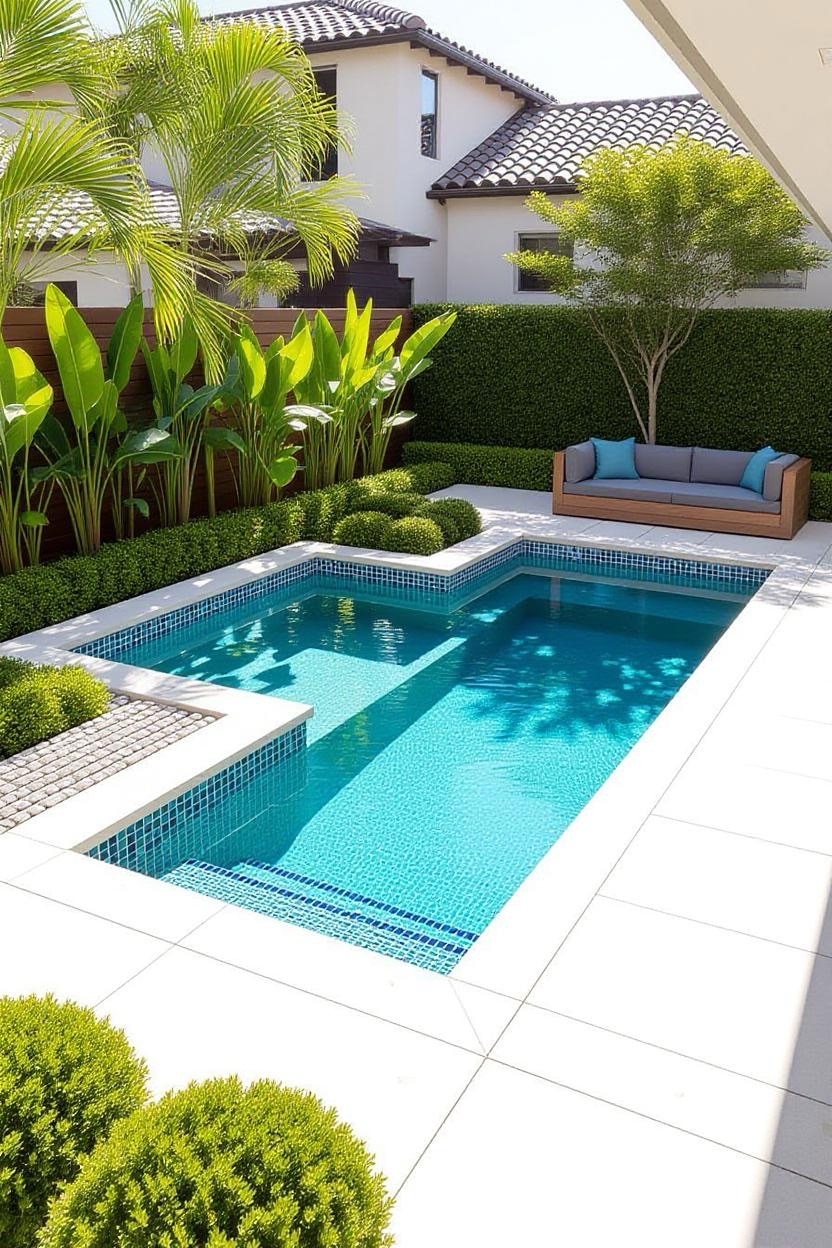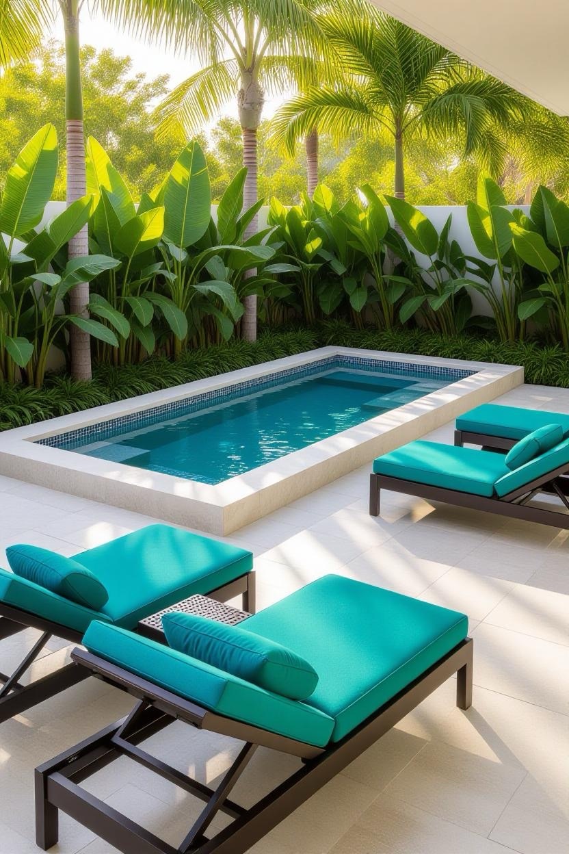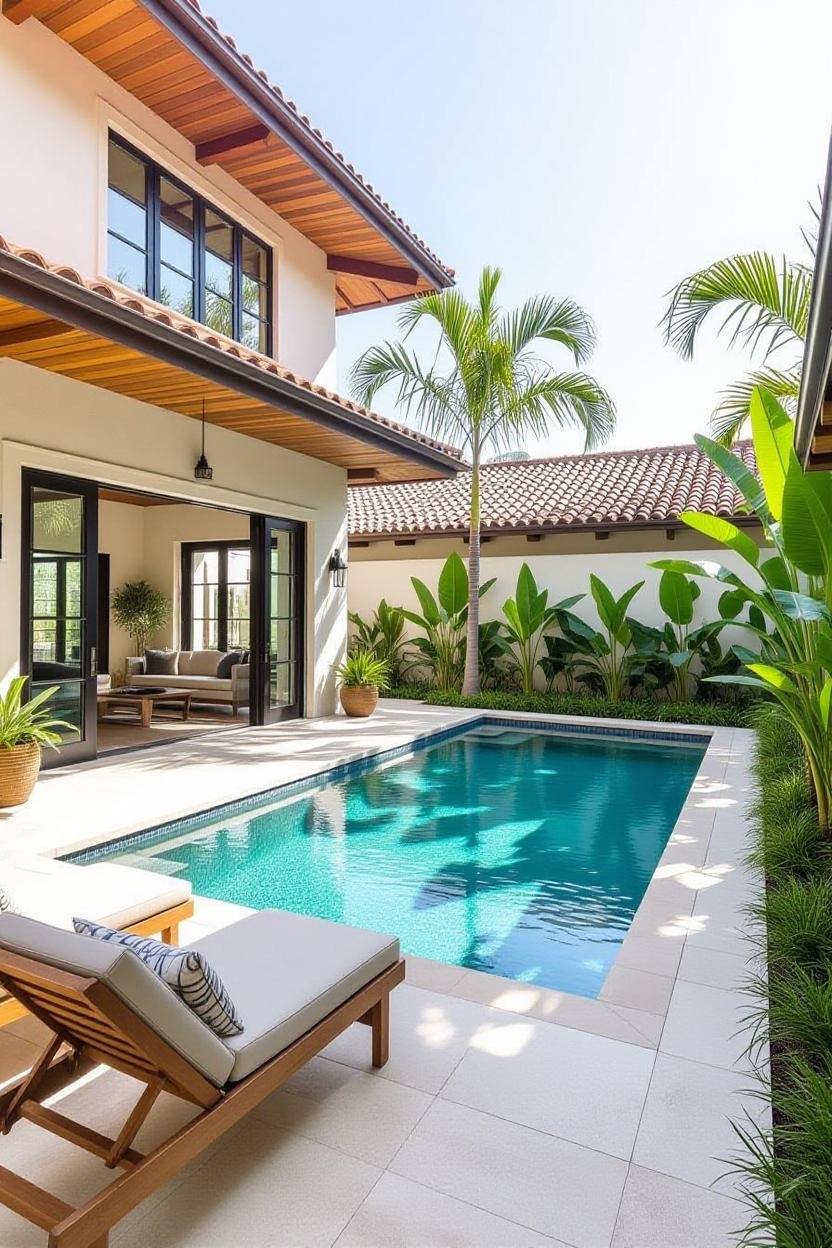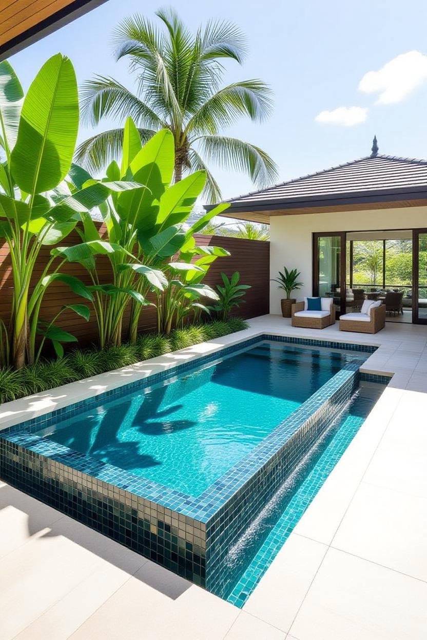 Surround your pool with palm plants, bamboo fencing, and tropical flowers. Even in a tiny space, this creates a resort-style vibe right at home.