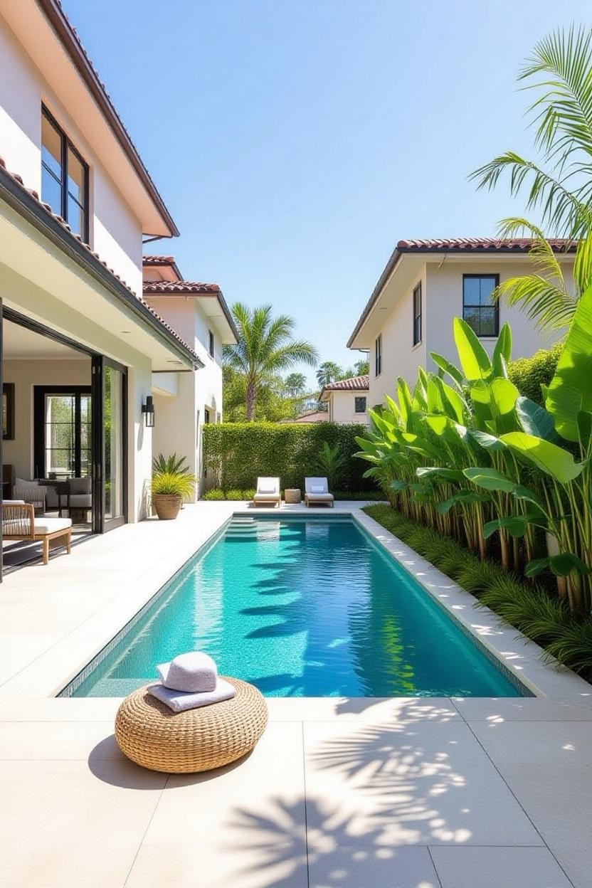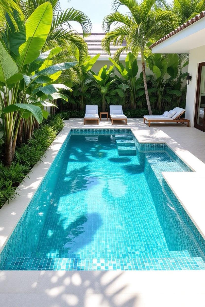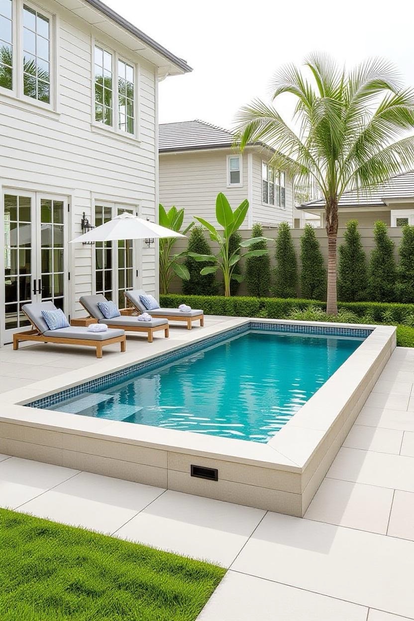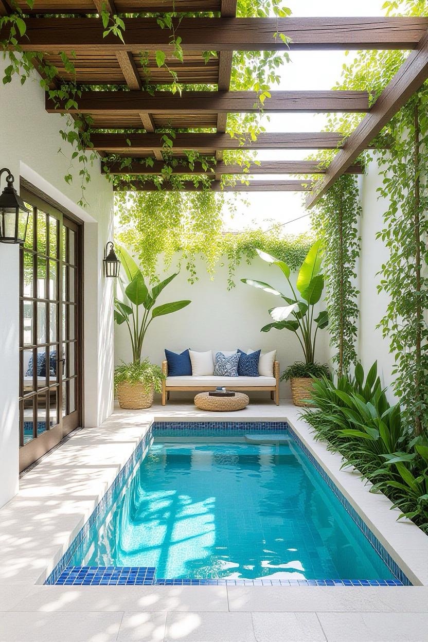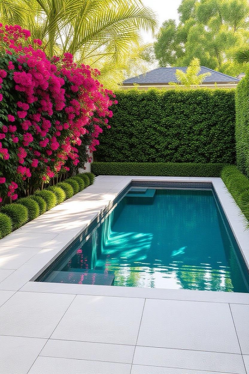 Surround your pool with palm plants, bamboo fencing, and tropical flowers. Even in a tiny space, this creates a resort-style vibe right at home.
