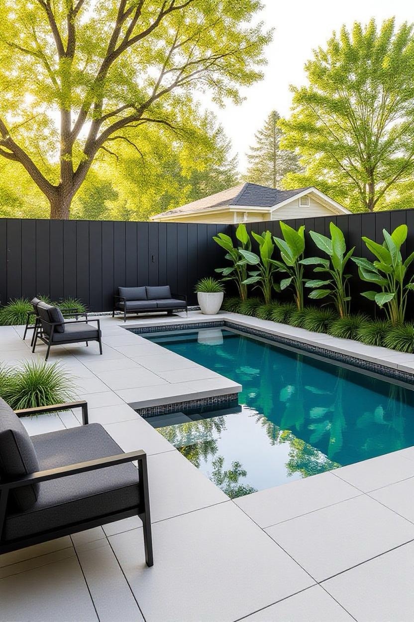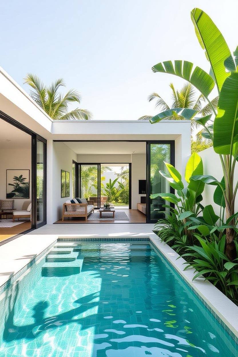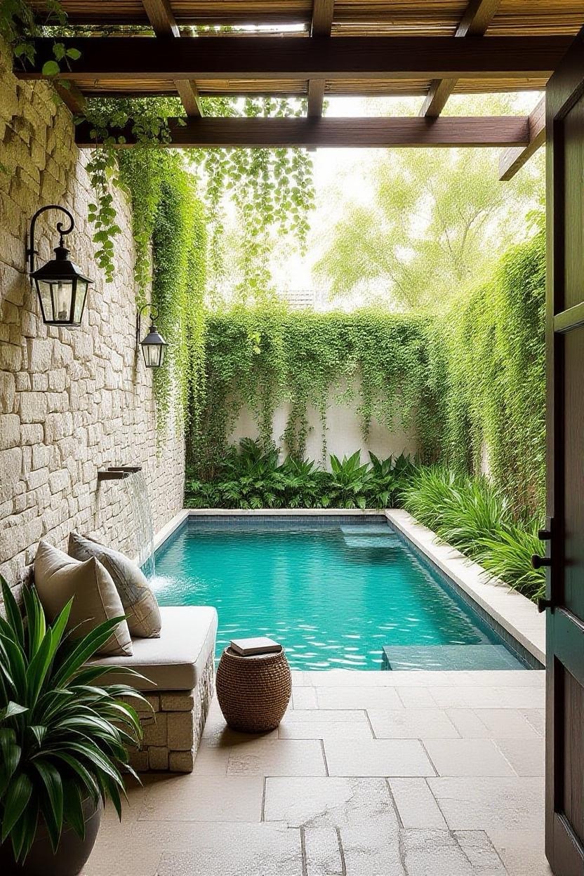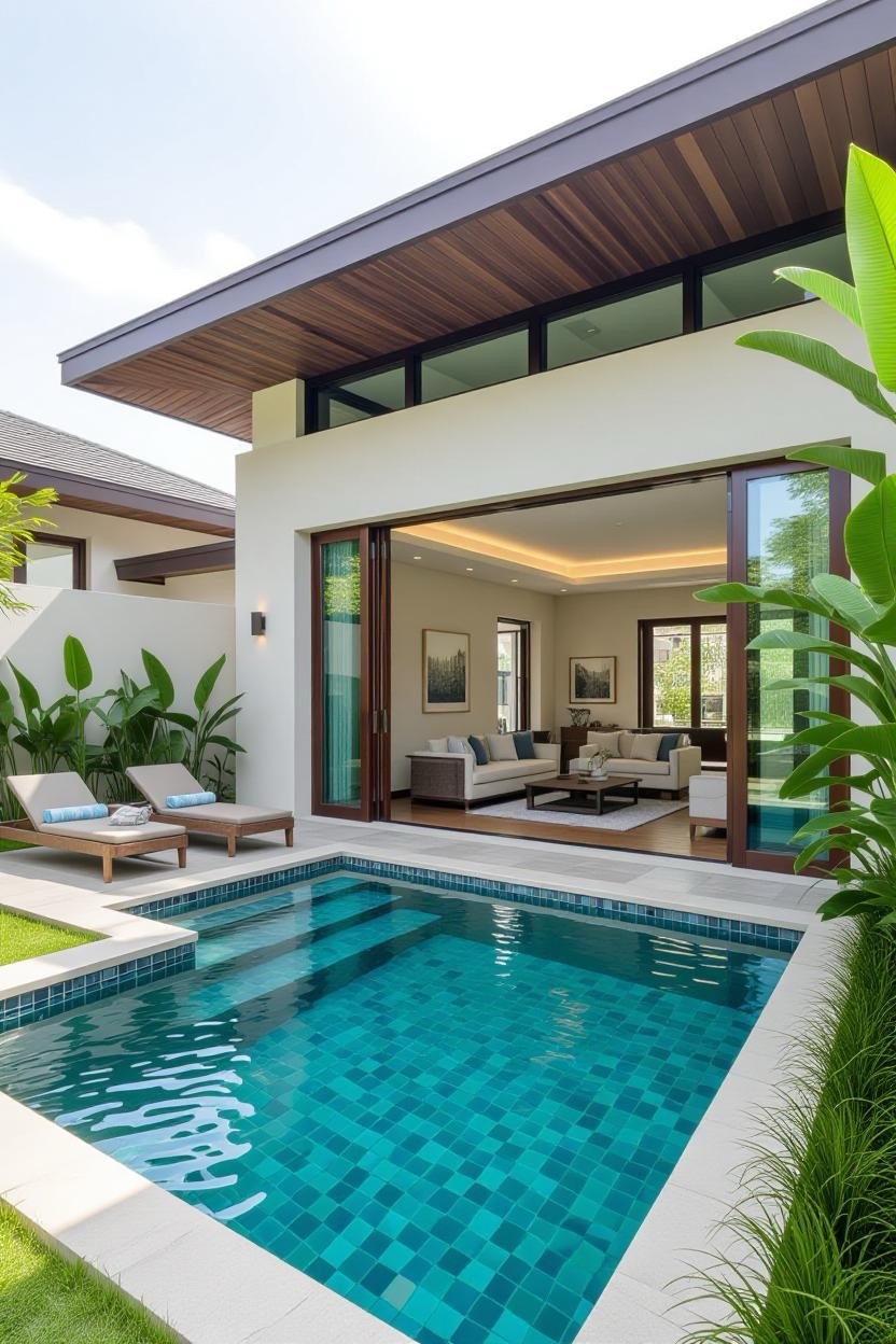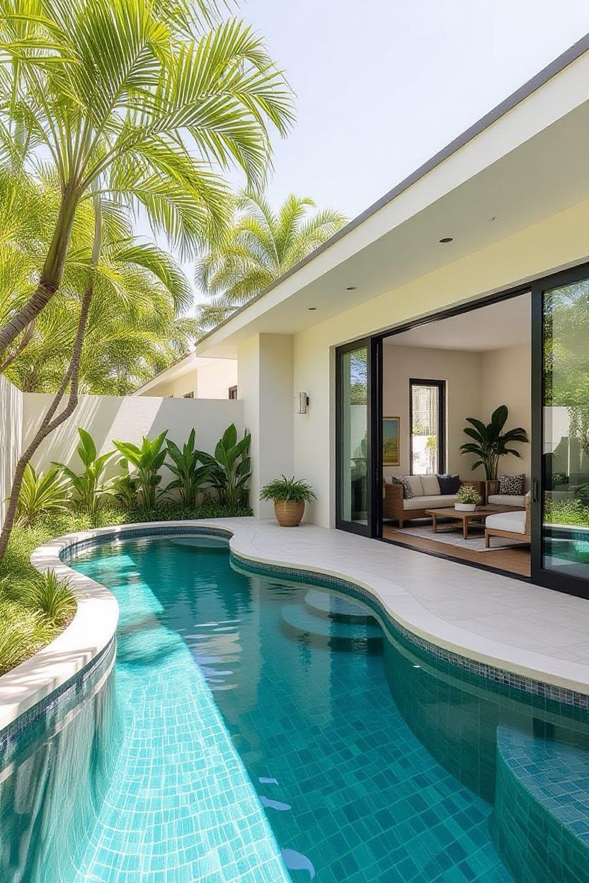Surround your pool with palm plants, bamboo fencing, and tropical flowers. Even in a tiny space, this creates a resort-style vibe right at home.