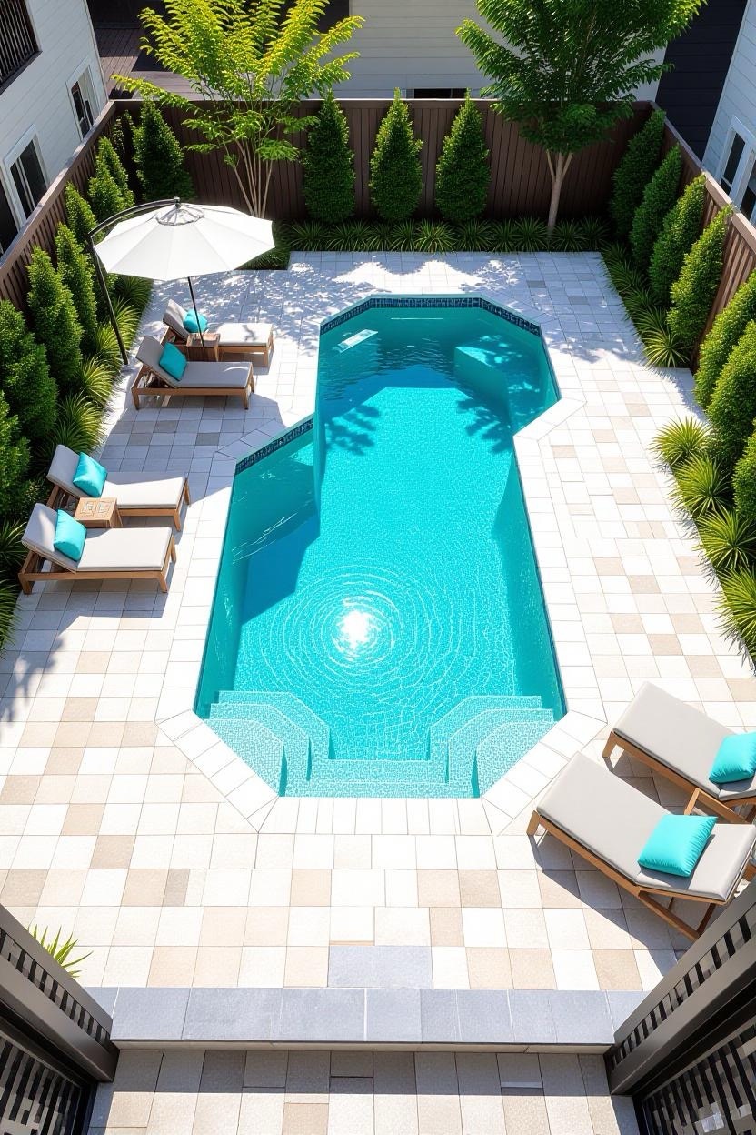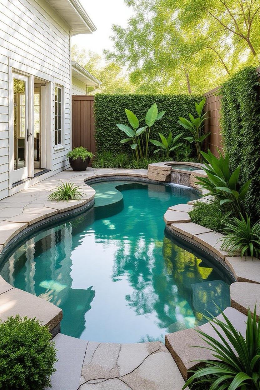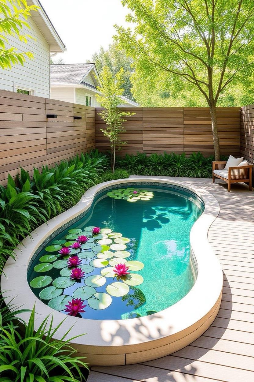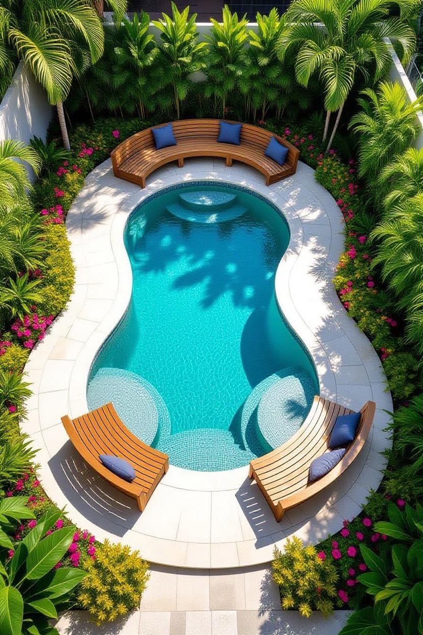 Go beyond rectangles with small hexagonal, oval, or L-shaped pools. Unique geometry makes the pool feel custom and stylish, even in limited spaces.