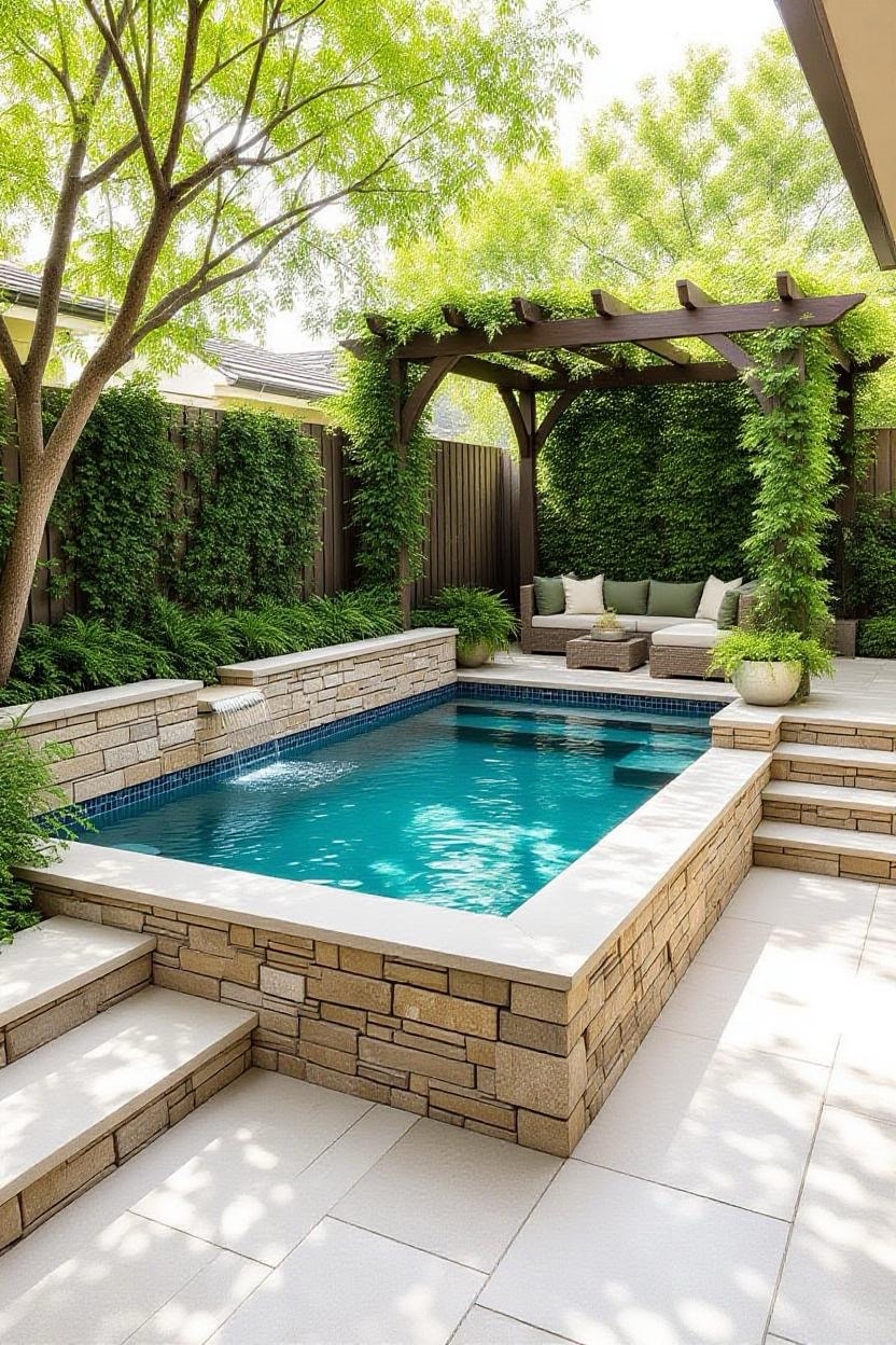 Using natural stone for the pool’s edge and surrounding area adds earthy charm to your backyard. Pair it with climbing plants or a pergola for a cozy, rustic retreat.
