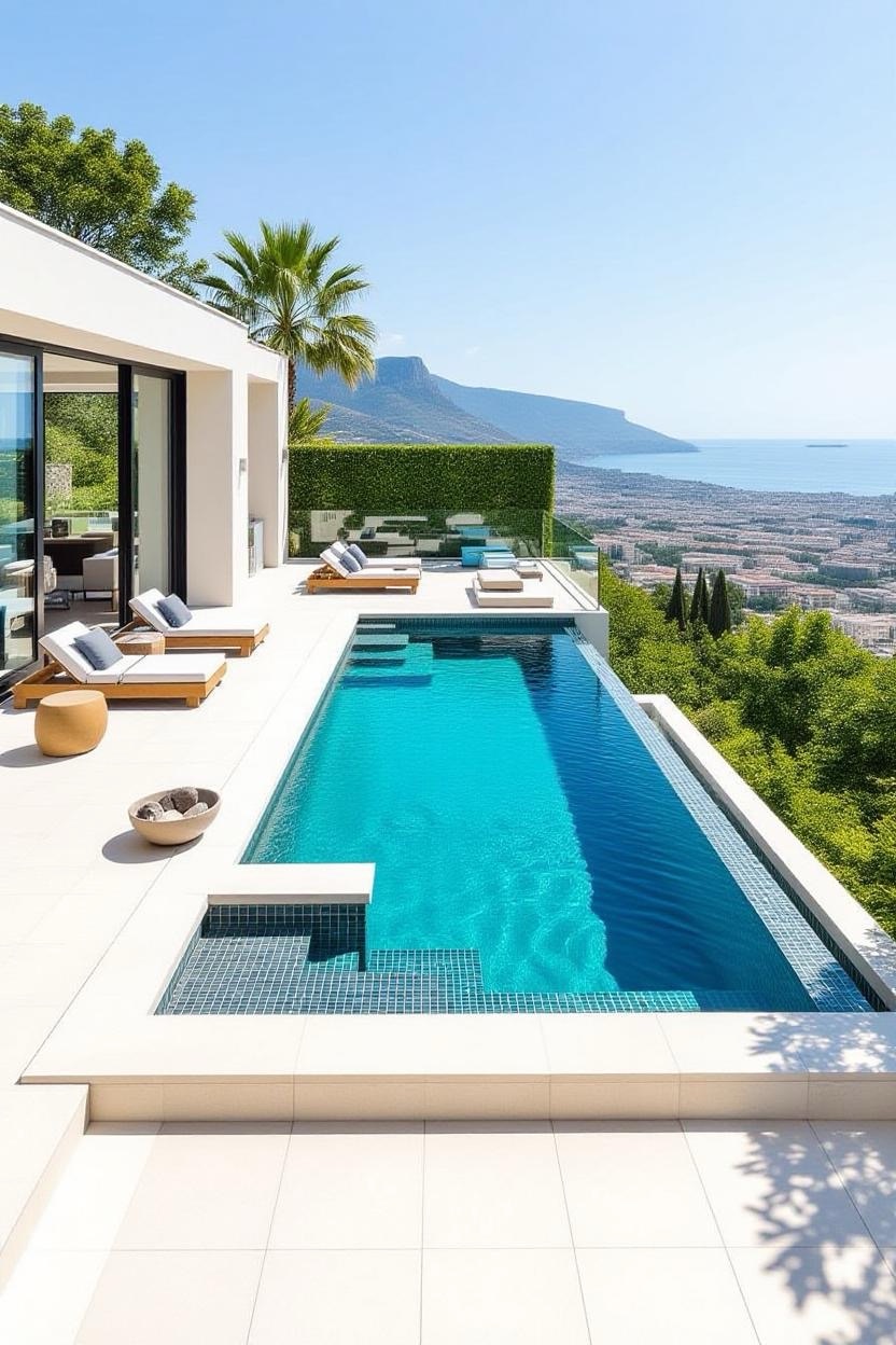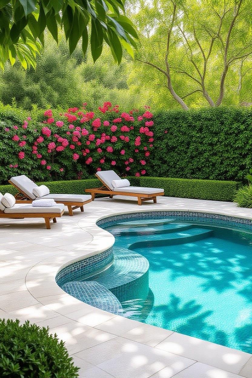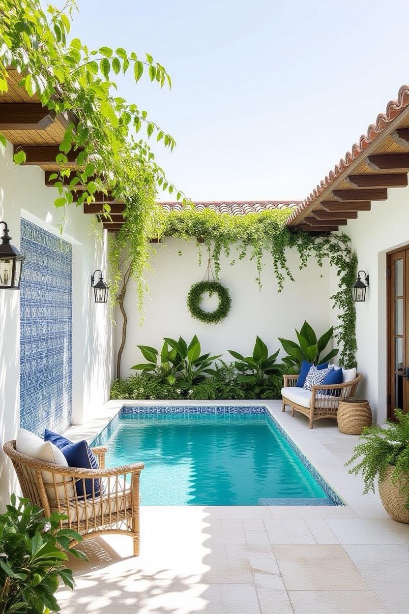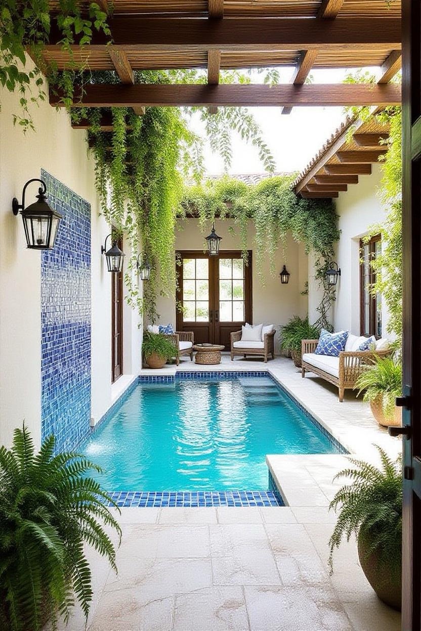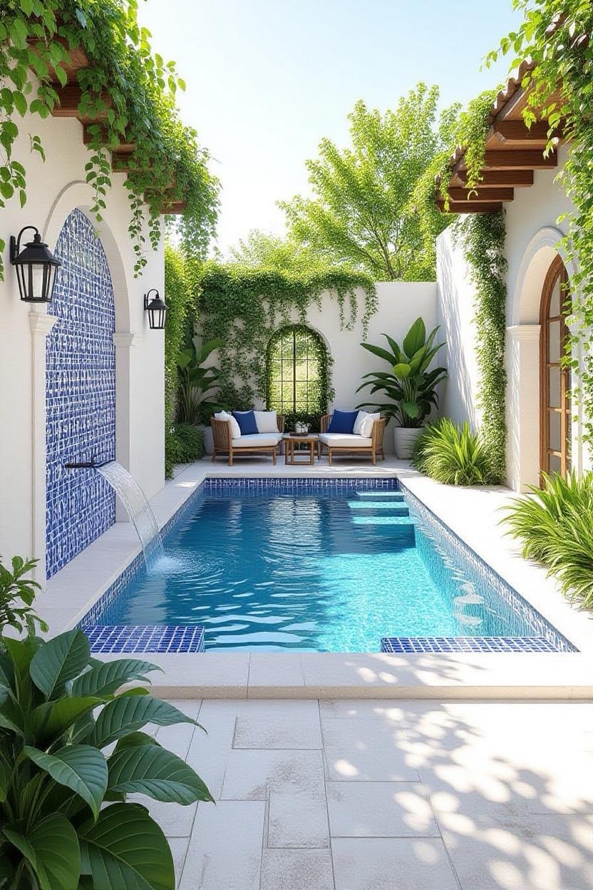 Add a touch of the Mediterranean with white stone, blue tiles, and climbing vines. This design turns your pool into a dreamy coastal-inspired escape.