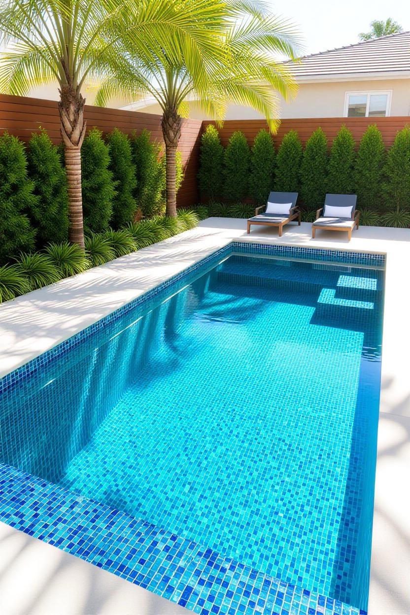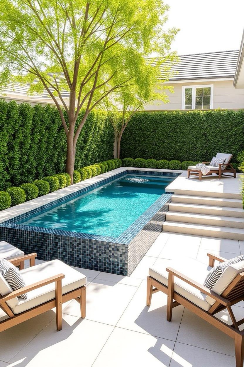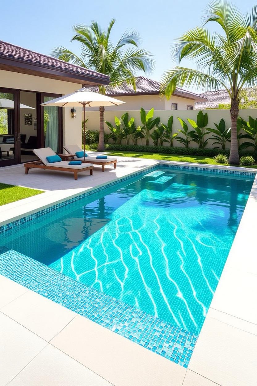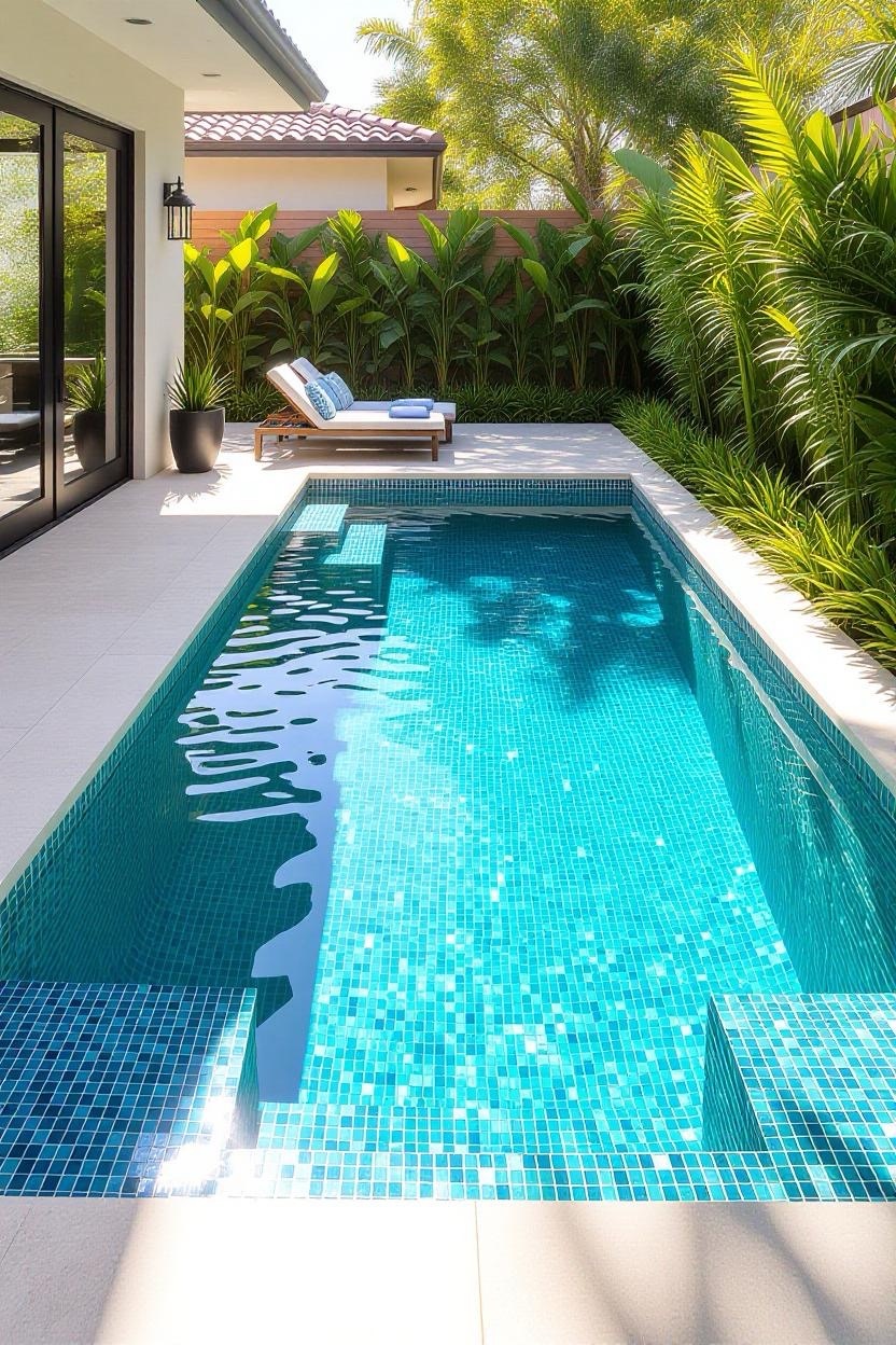Opt for shimmering glass tiles for the pool interior. They catch sunlight beautifully and add a high-end touch, even in the smallest of pools.