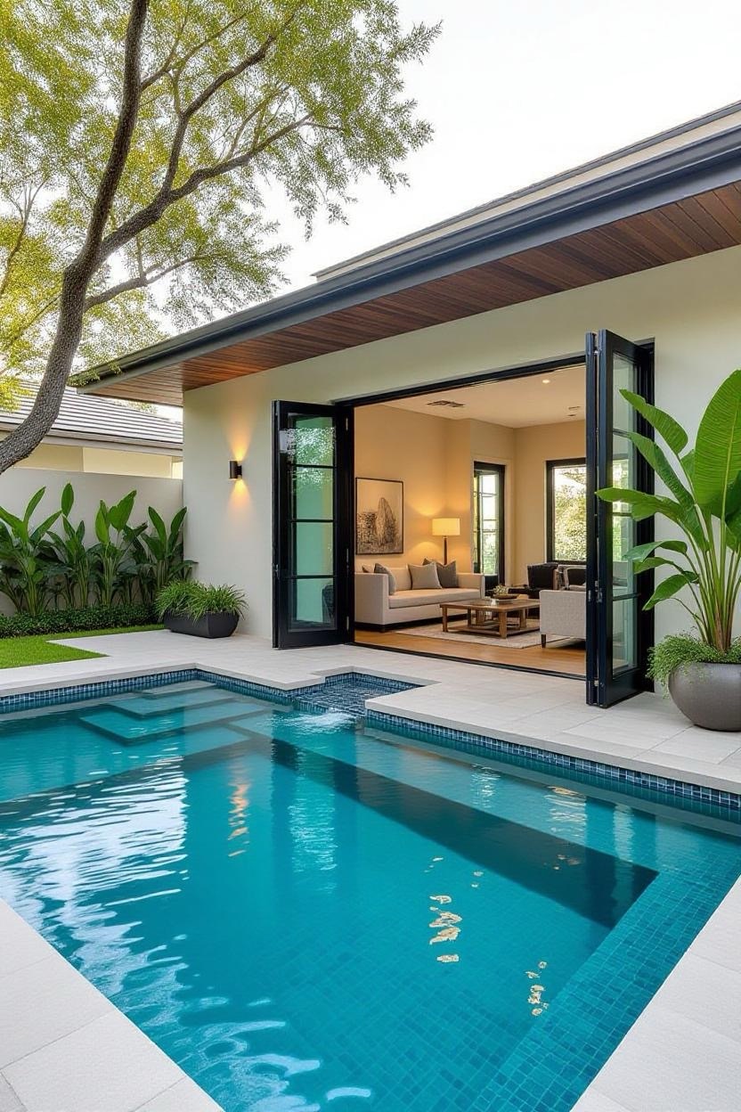 If you have a backyard that connects directly to indoor space, design the pool so it flows from the house outward. Glass doors opening onto the pool make your home feel more expansive.