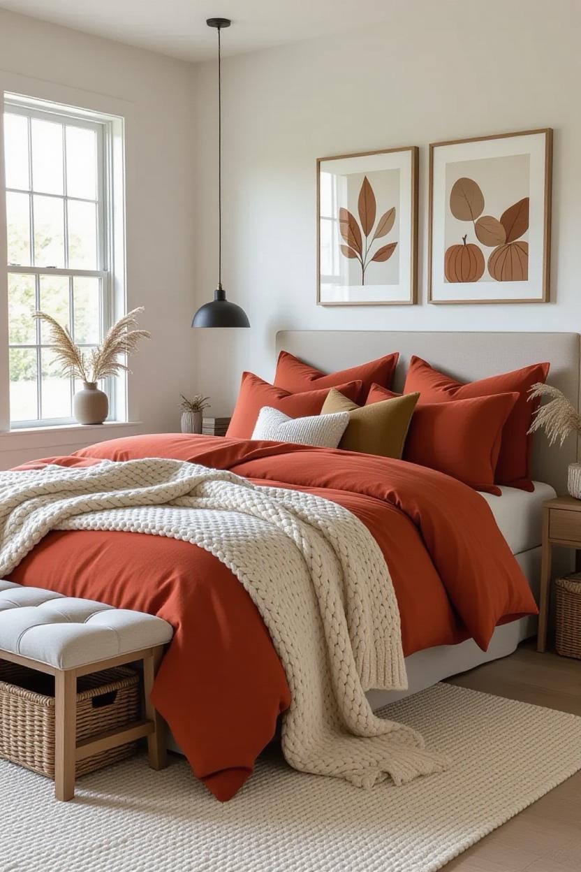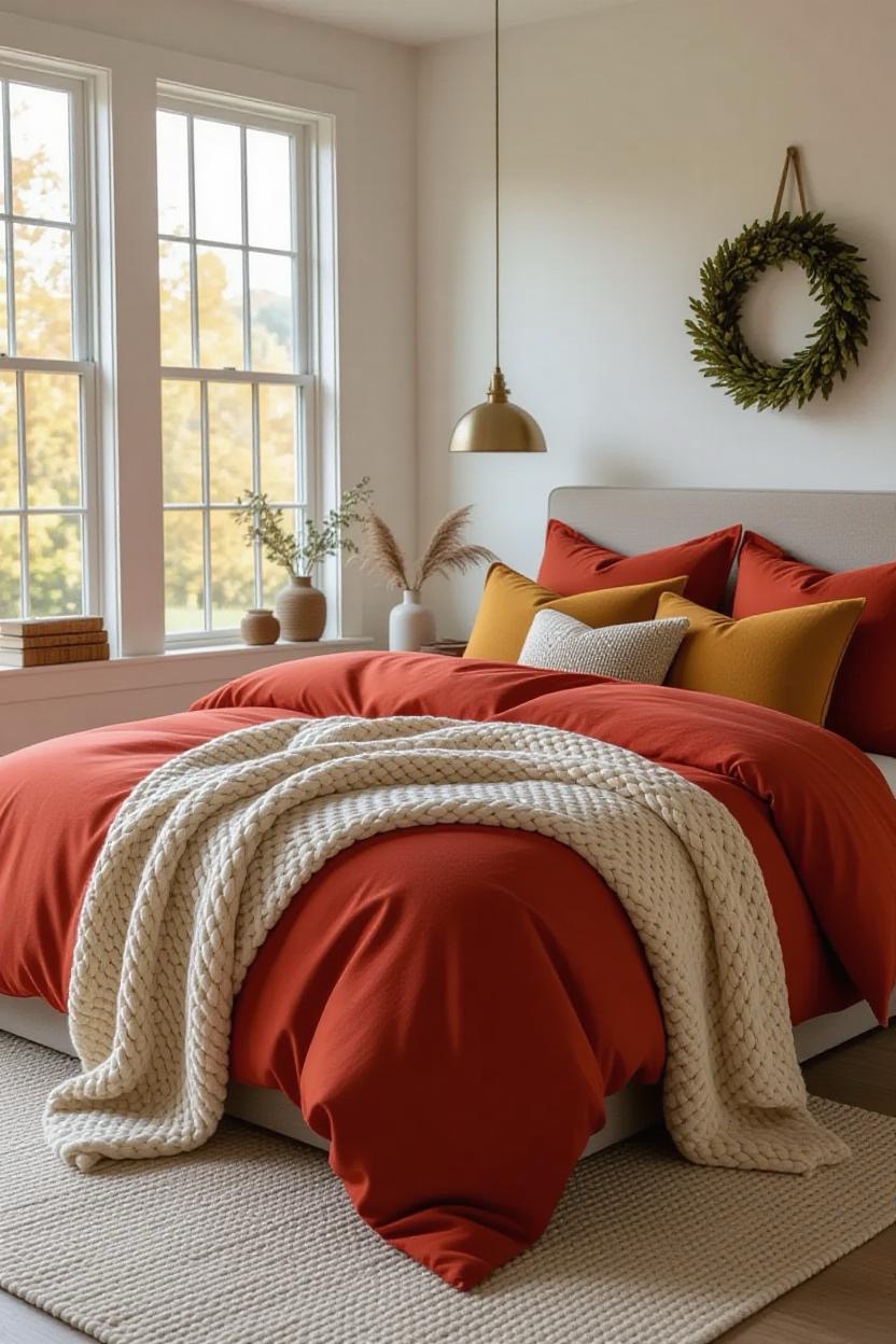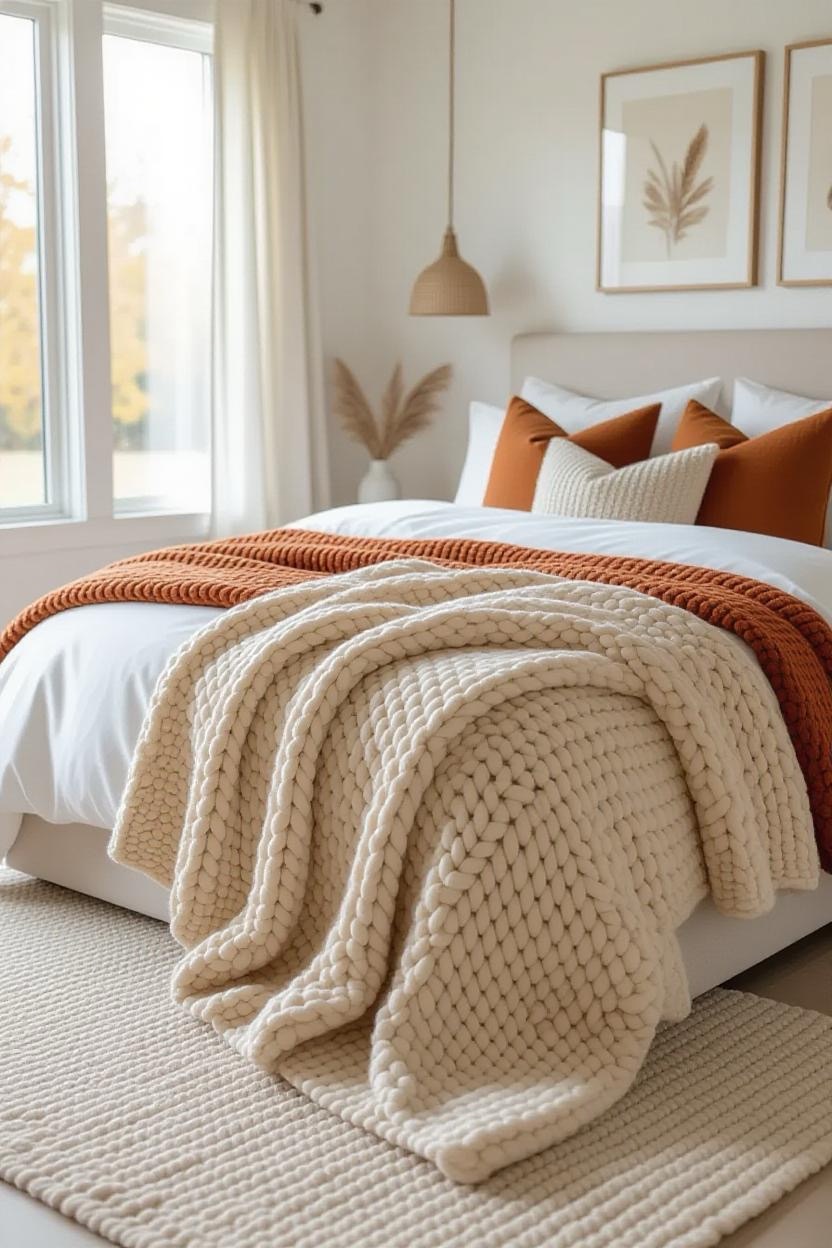 Nothing says fall like a chunky knit throw draped across your bed. Choose warm, neutral tones like oatmeal or rust for a cozy vibe. These oversized textures instantly add warmth, both literally and visually, making your space feel snug and inviting.