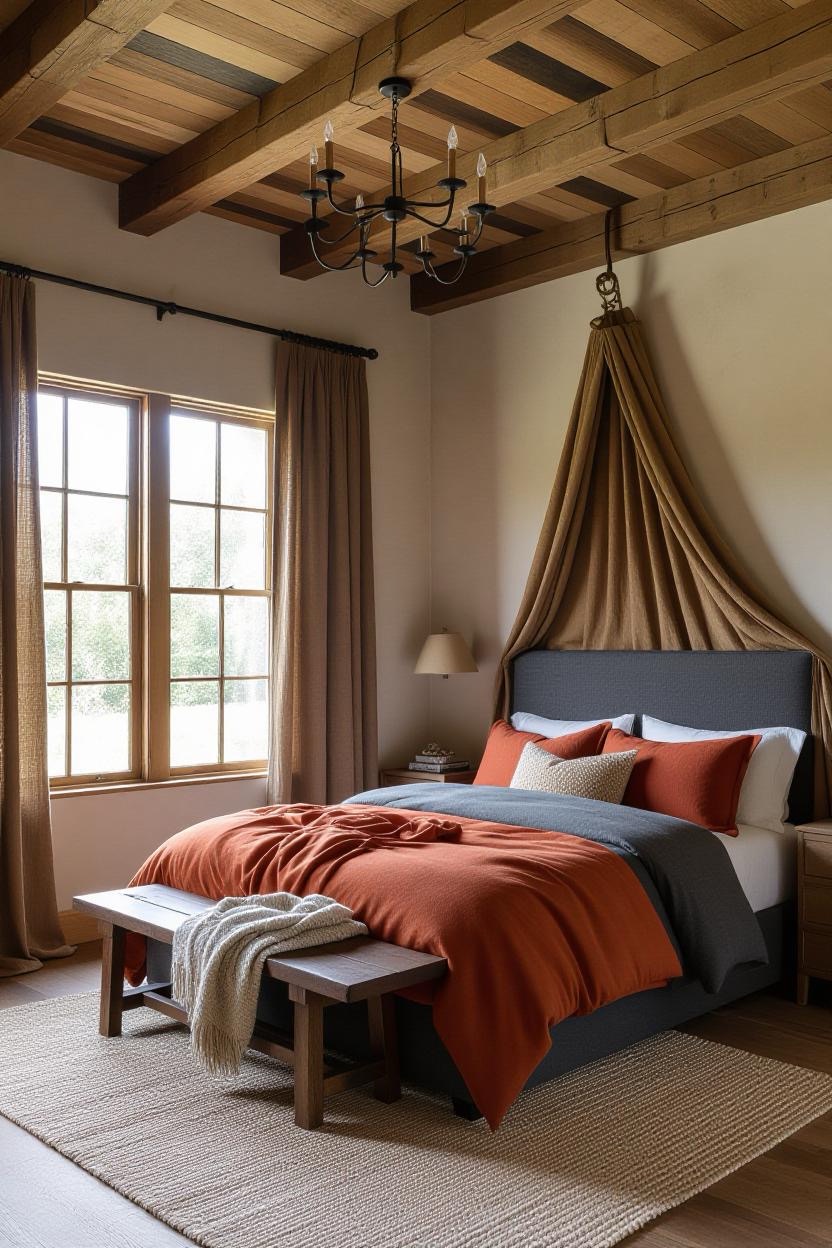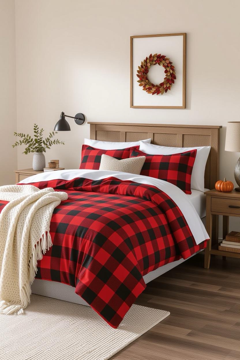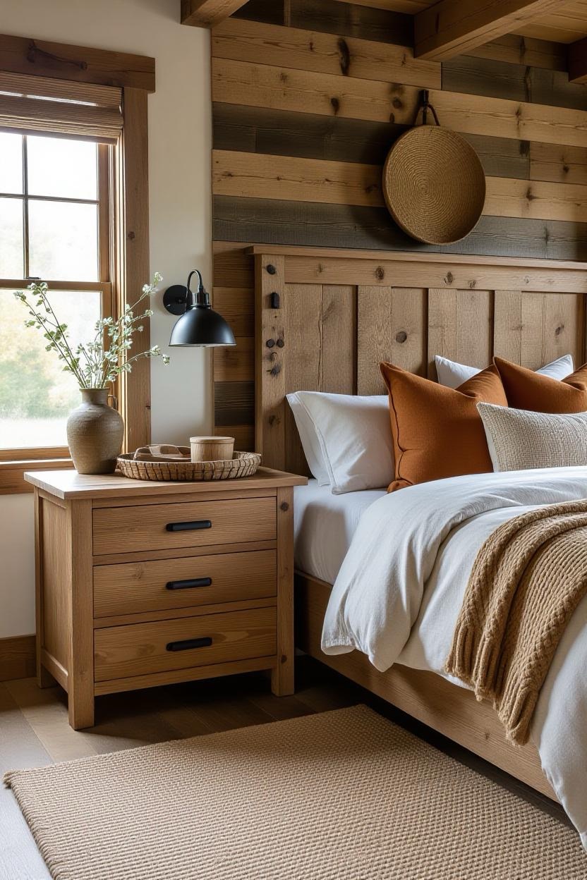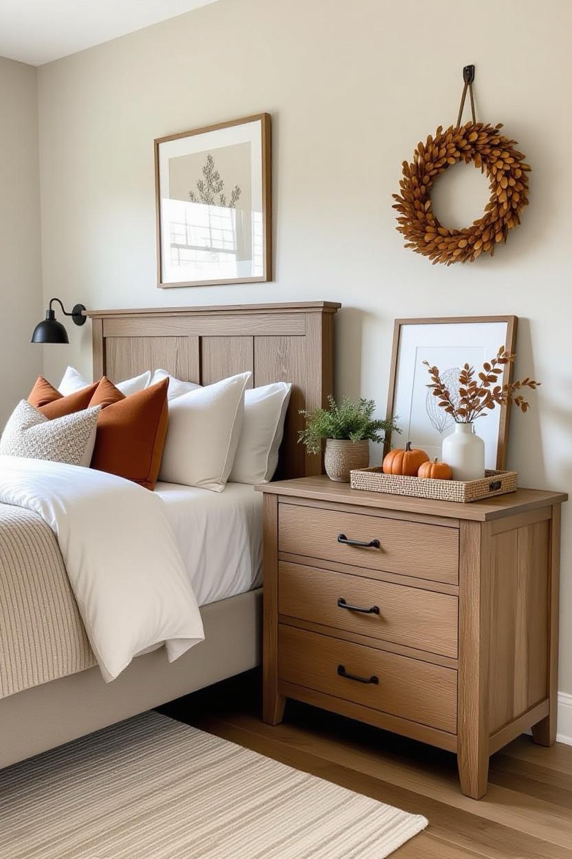 Use wooden nightstands, a headboard, or even small decor pieces like trays or frames to ground your fall bedroom in rustic charm. The natural texture pairs beautifully with fall’s earthy palette.