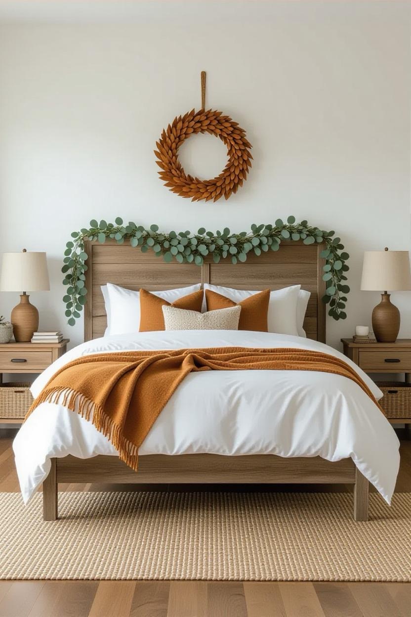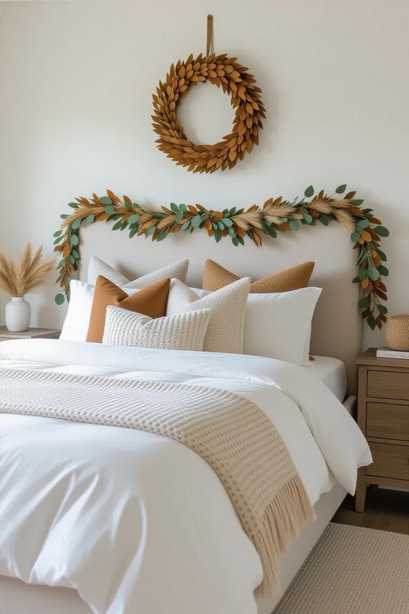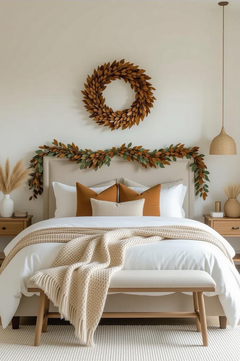 Use a mini wreath above your bed or a garland along your headboard. Choose materials like dried leaves, wheat, or eucalyptus to subtly bring in fall foliage.