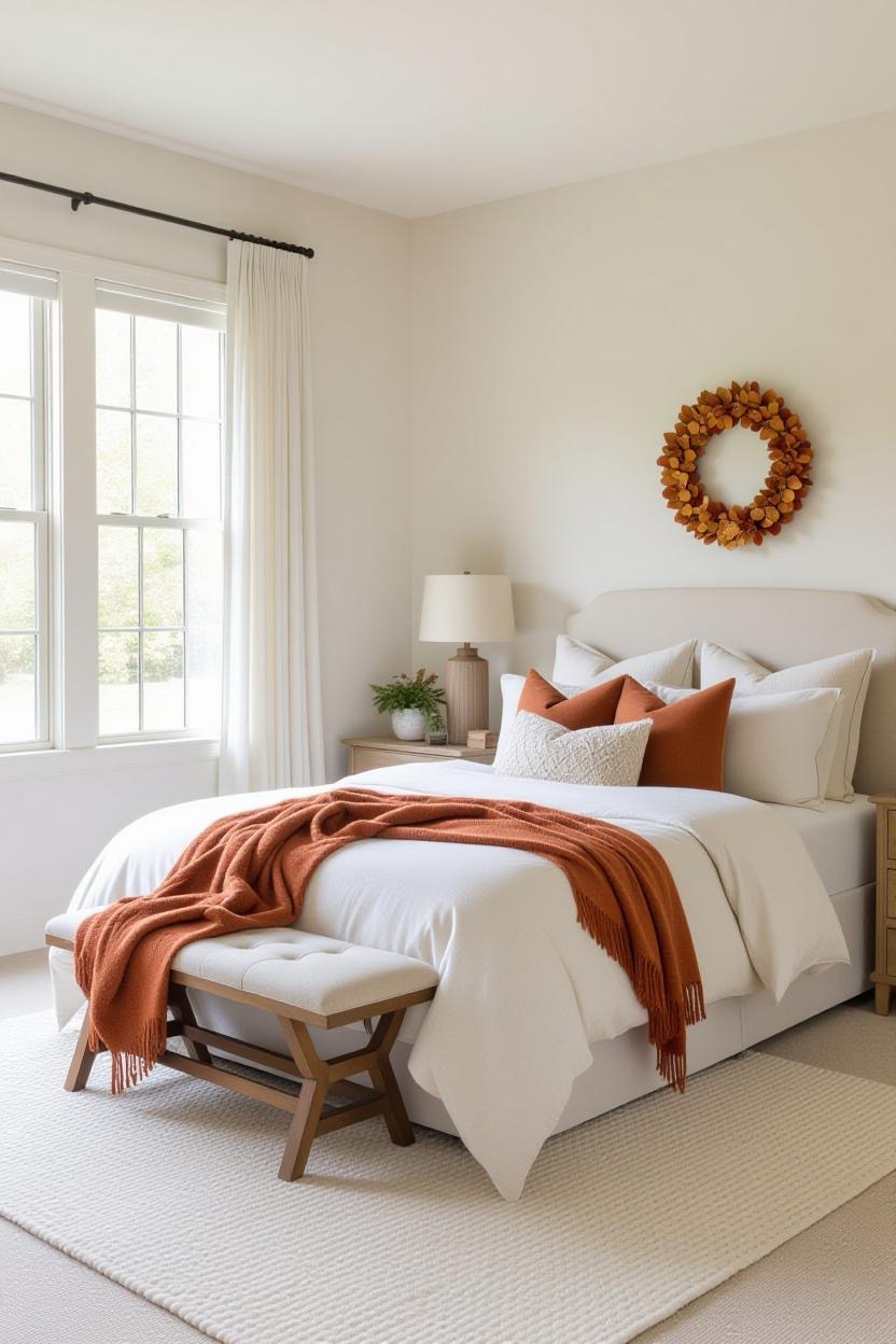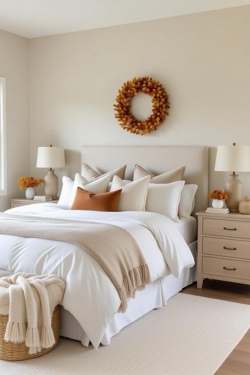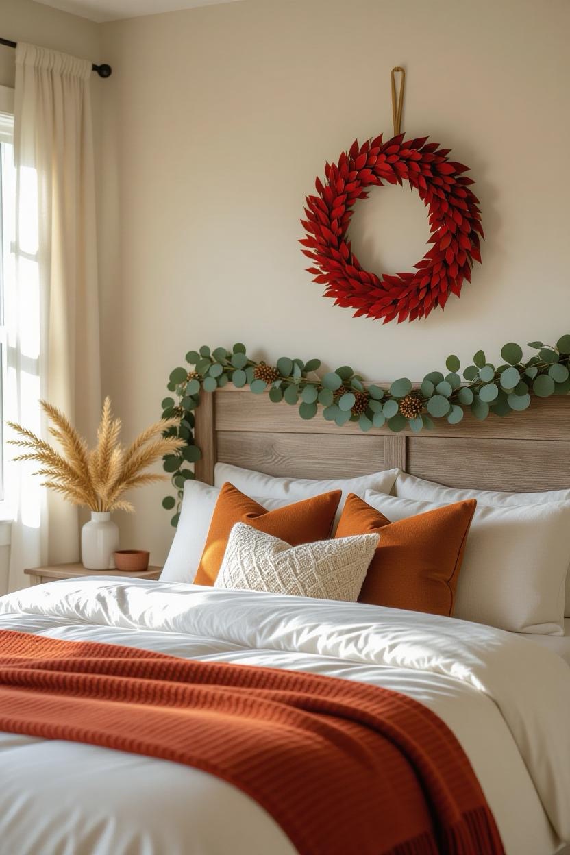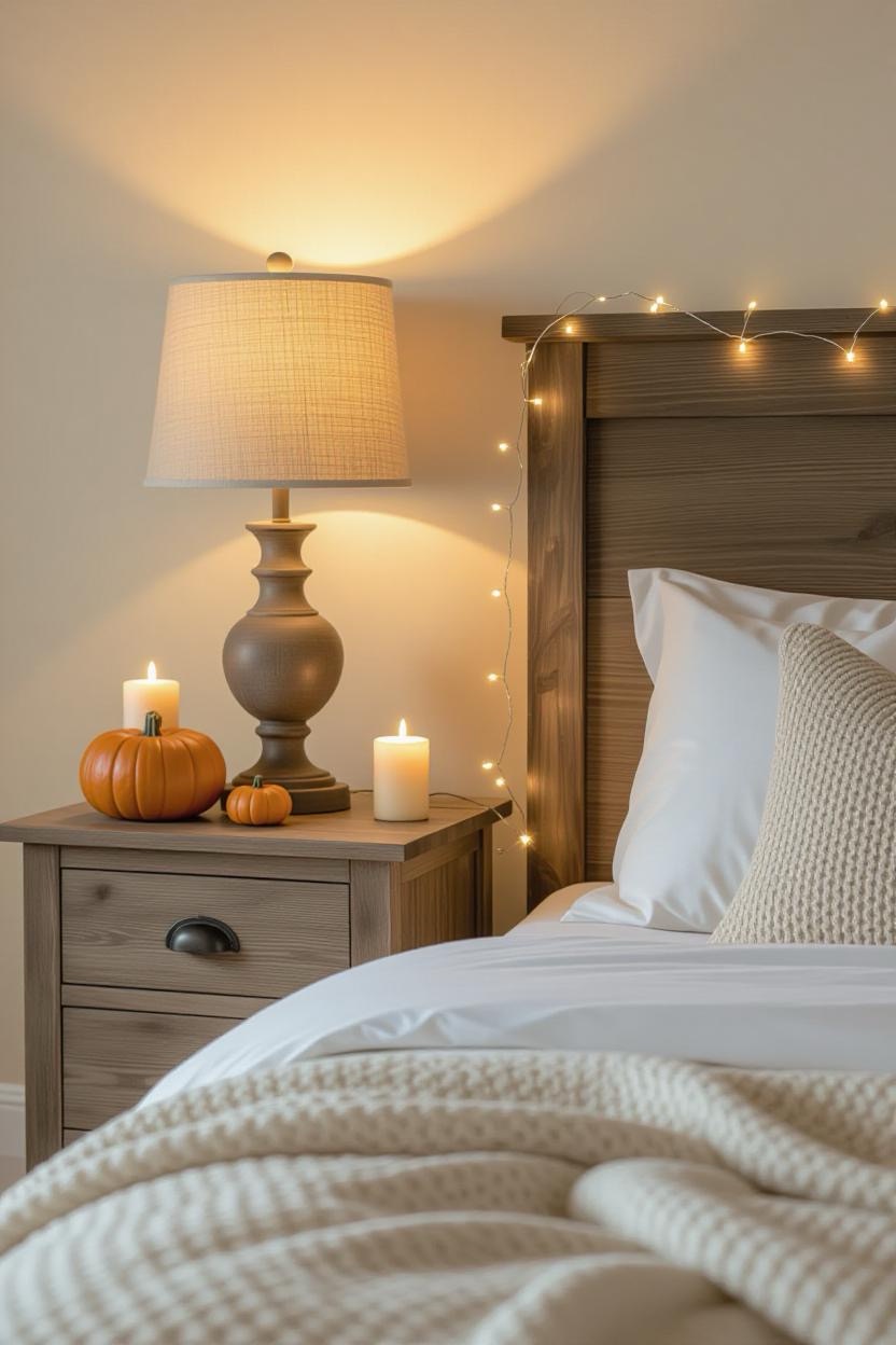 Use a mini wreath above your bed or a garland along your headboard. Choose materials like dried leaves, wheat, or eucalyptus to subtly bring in fall foliage.