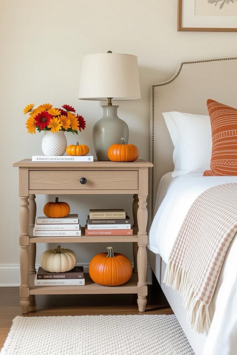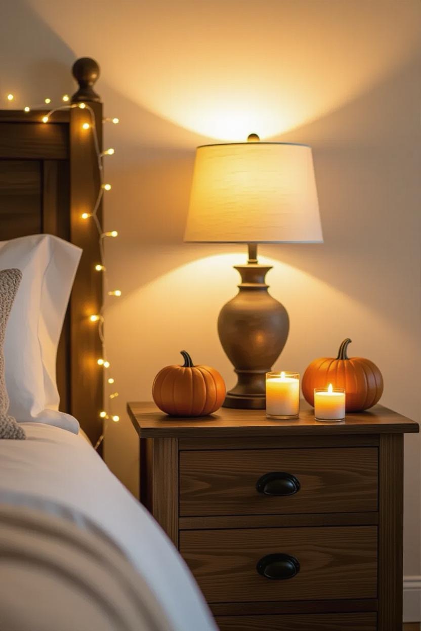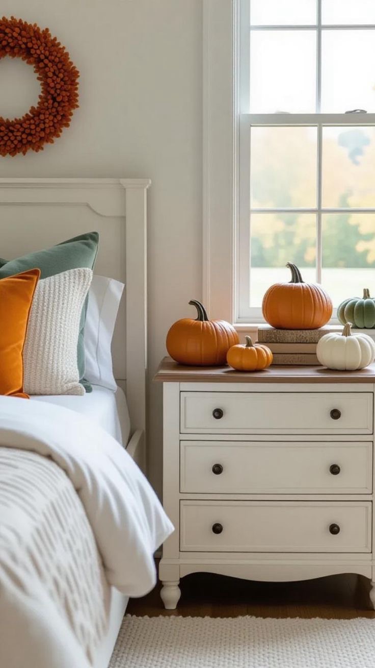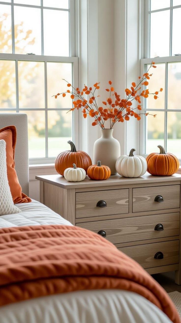 Add small decorative pumpkins to your nightstand, dresser, or windowsill. Mix real and faux options in different textures ceramic, velvet, or wood for a festive touch without overdoing it.